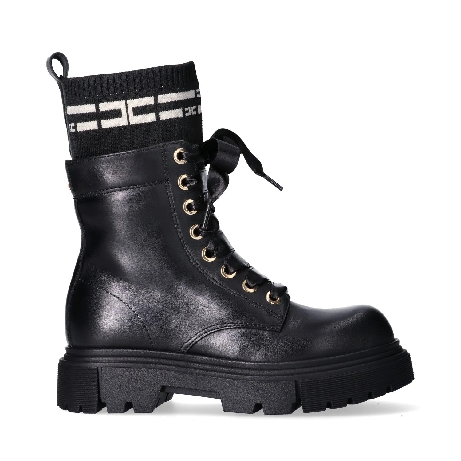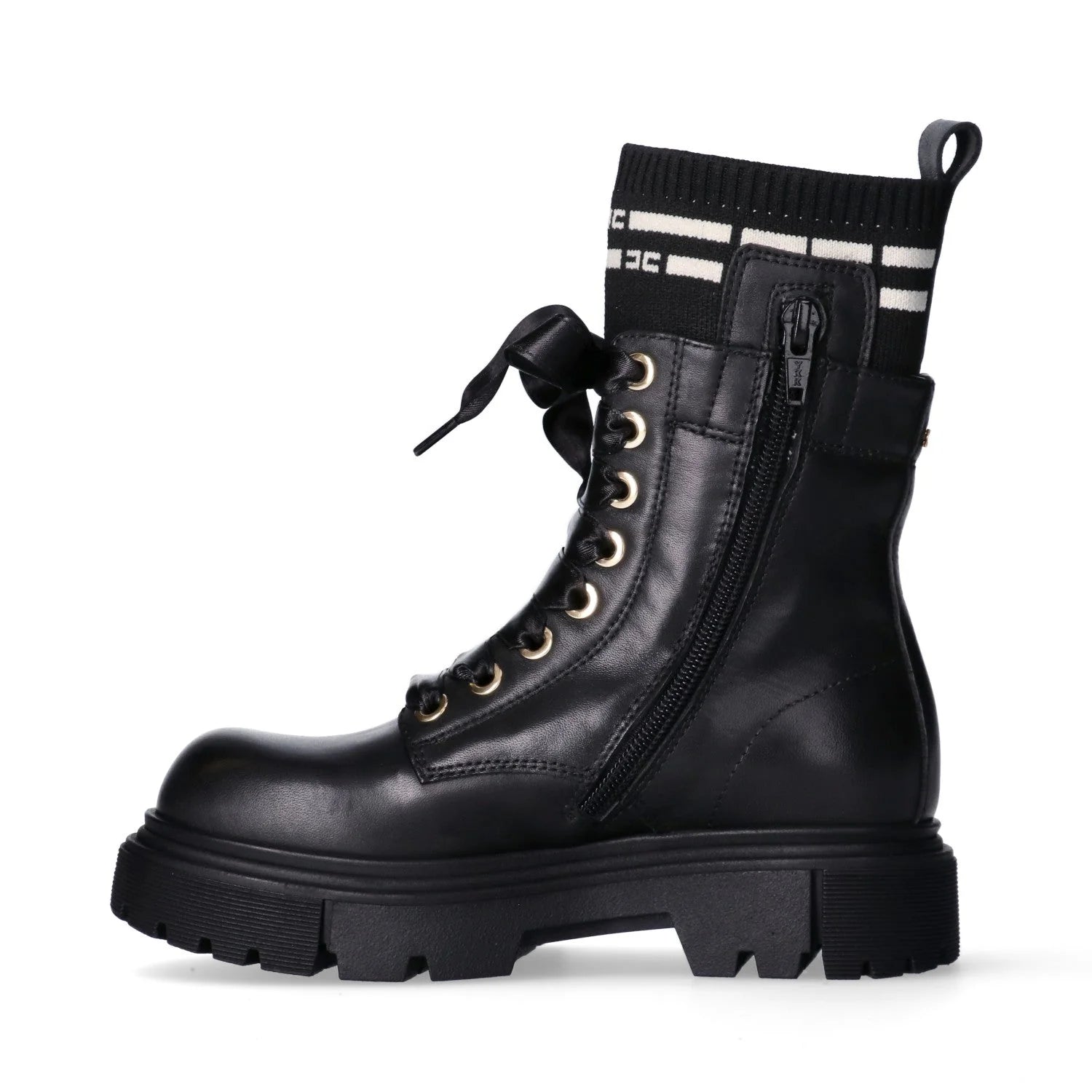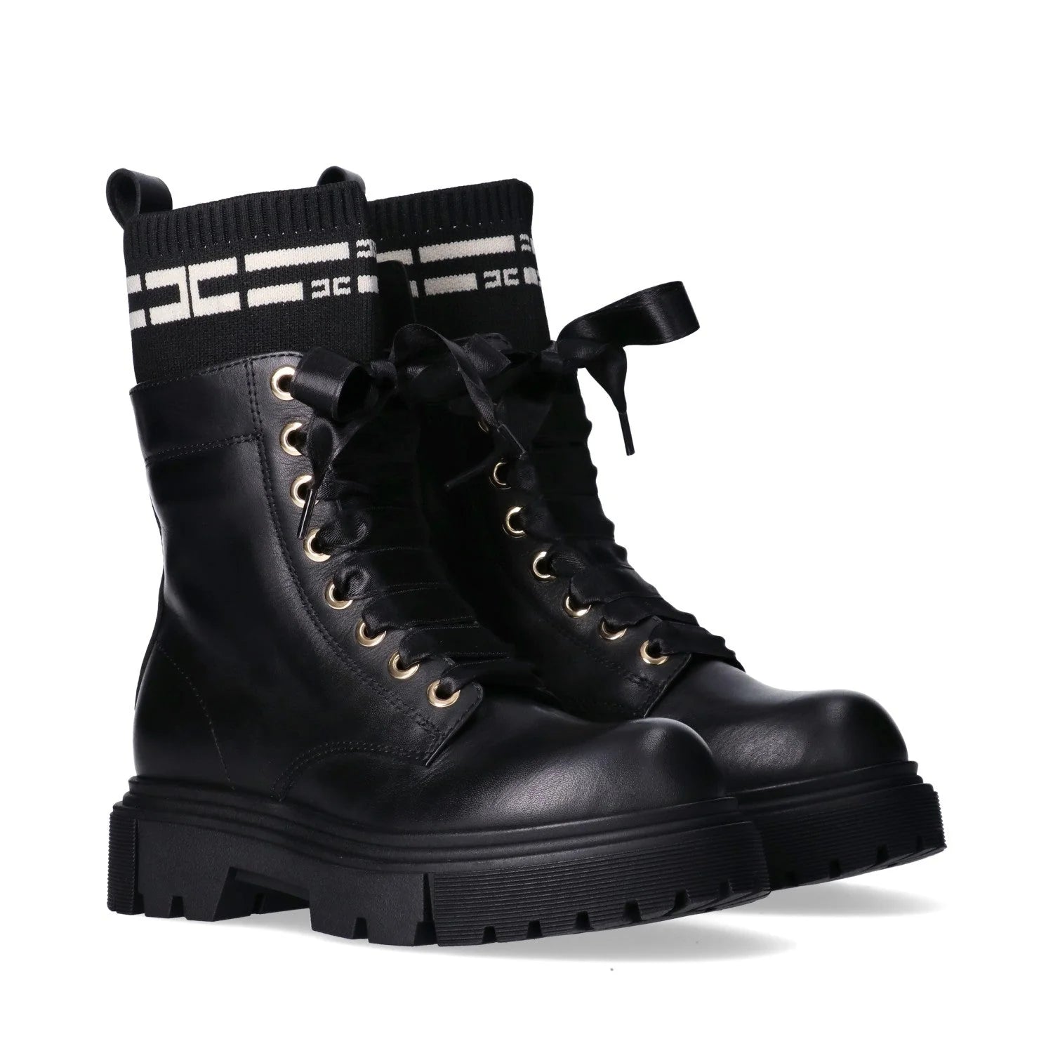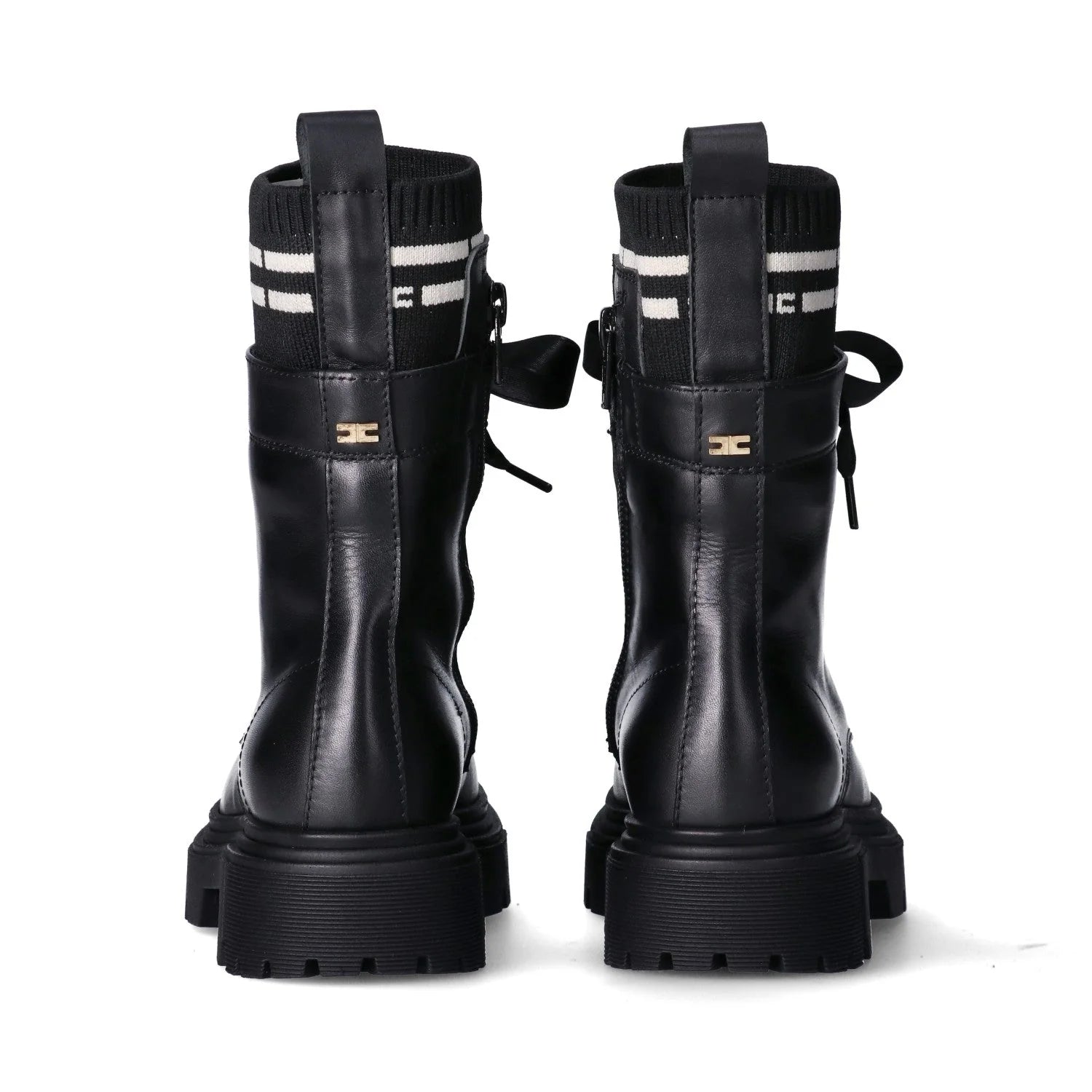 Un modello dal carattere deciso e femminile. Gli anfibi Elisabetta Franchi La Mia Bambina sono realizzati in pelle e tessuto elastico, con dettagli esclusivi come i lacci in raso e il gambale a calza logato che abbraccia la caviglia. La fodera e la soletta in pelle garantiscono comfort e traspirabilità, mentre la suola carrarmato in gomma antiscivolo assicura stabilità ad ogni passo. Perfetti per look casual-chic che non passano inosservati.