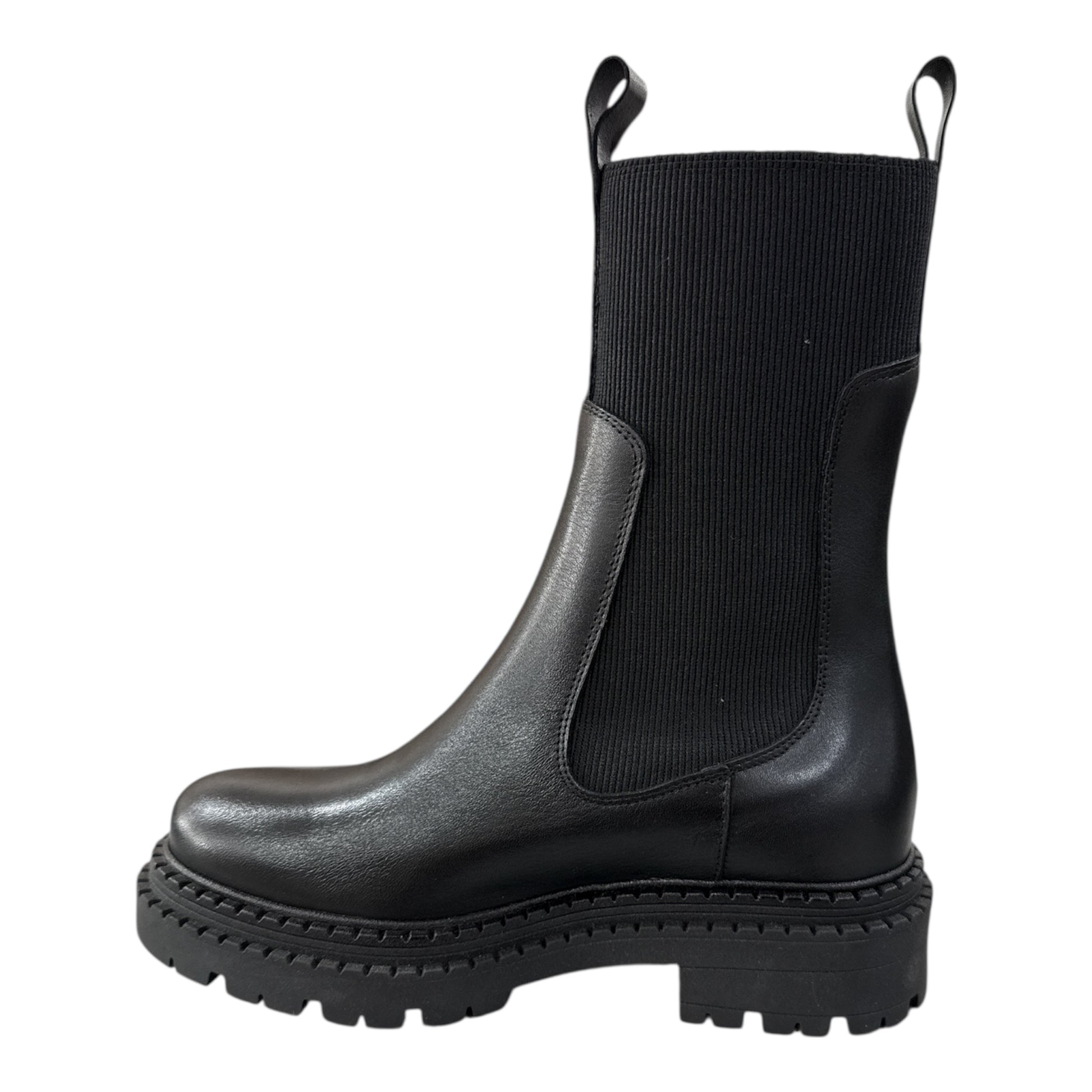 High black leather boot, equipped with gold hook.