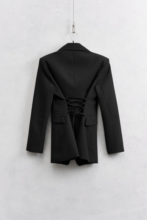 Blazer con collo a revers, spalle imbottite, chiusura a doppiopetto con bottoni, presenta pinces e tasche , dettaglio laccio incrociato, posteriore, vestibilità regolare.