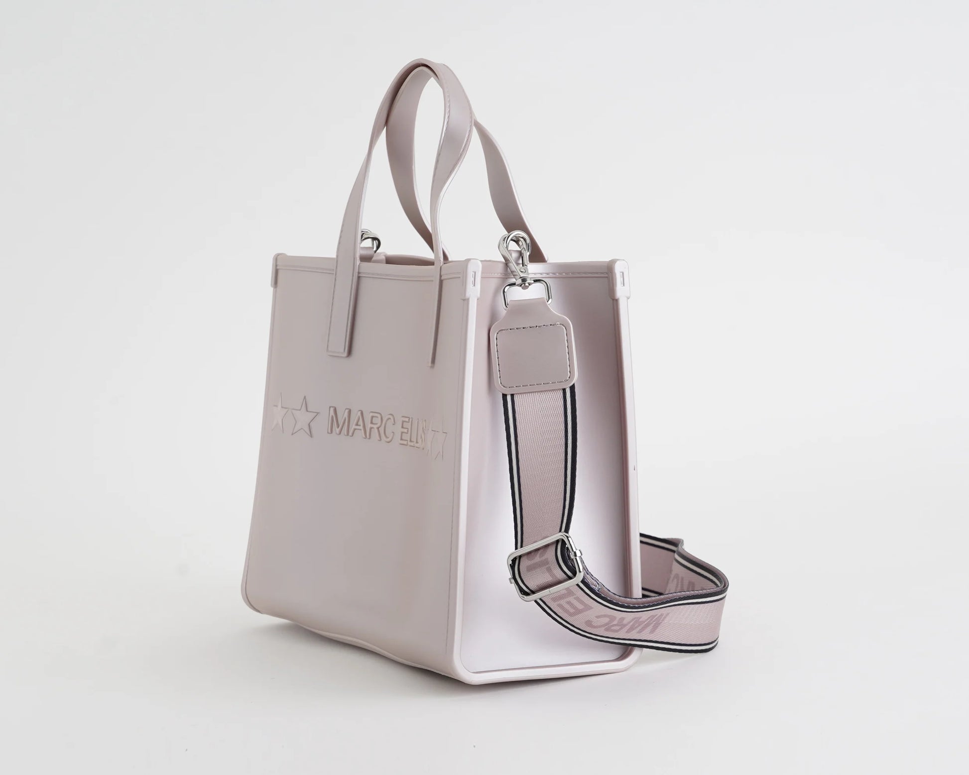 Shopper Flat Go si distingue per le linee pulite e la struttura rigida, perfetta per l'uso quotidiano o per il lavoro. Sul davanti spicca il logo Marc Ellis con stelle in rilievo, dettaglio distintivo che aggiunge un tocco moderno. È dotata di doppi manici per portarla a mano e di tracolla regolabile e removibile per indossarla anche a spalla o crossbody. L'interno spazioso è completato da una pochette coordinata rimovibile con chiusura a zip, pensata per custodire gli oggetti più piccoli. Un modello pratico ed elegante, ideale per accompagnare con stile ogni momento della giornata.
