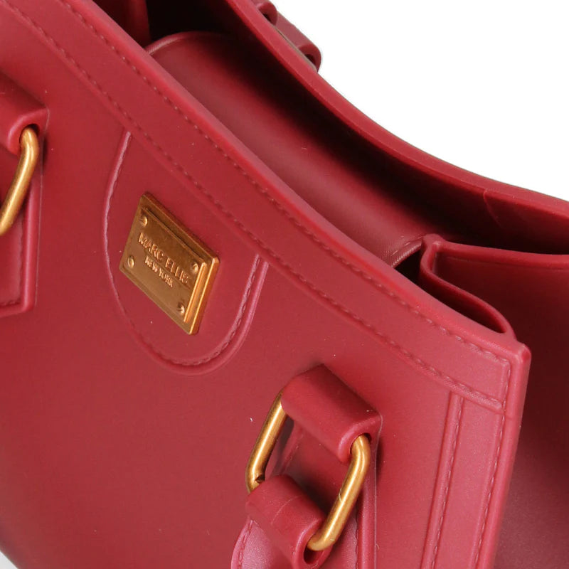 Realizzata interamente in gomma di alta qualità, sia all'interno che all'esterno, questa borsa offre una resistenza e una flessibilità uniche, garantendo una durata nel tempo eccezionale. L'artigianalità è al centro di questa creazione fashion, che si distingue per la sua forma strutturata e i dettagli curati.