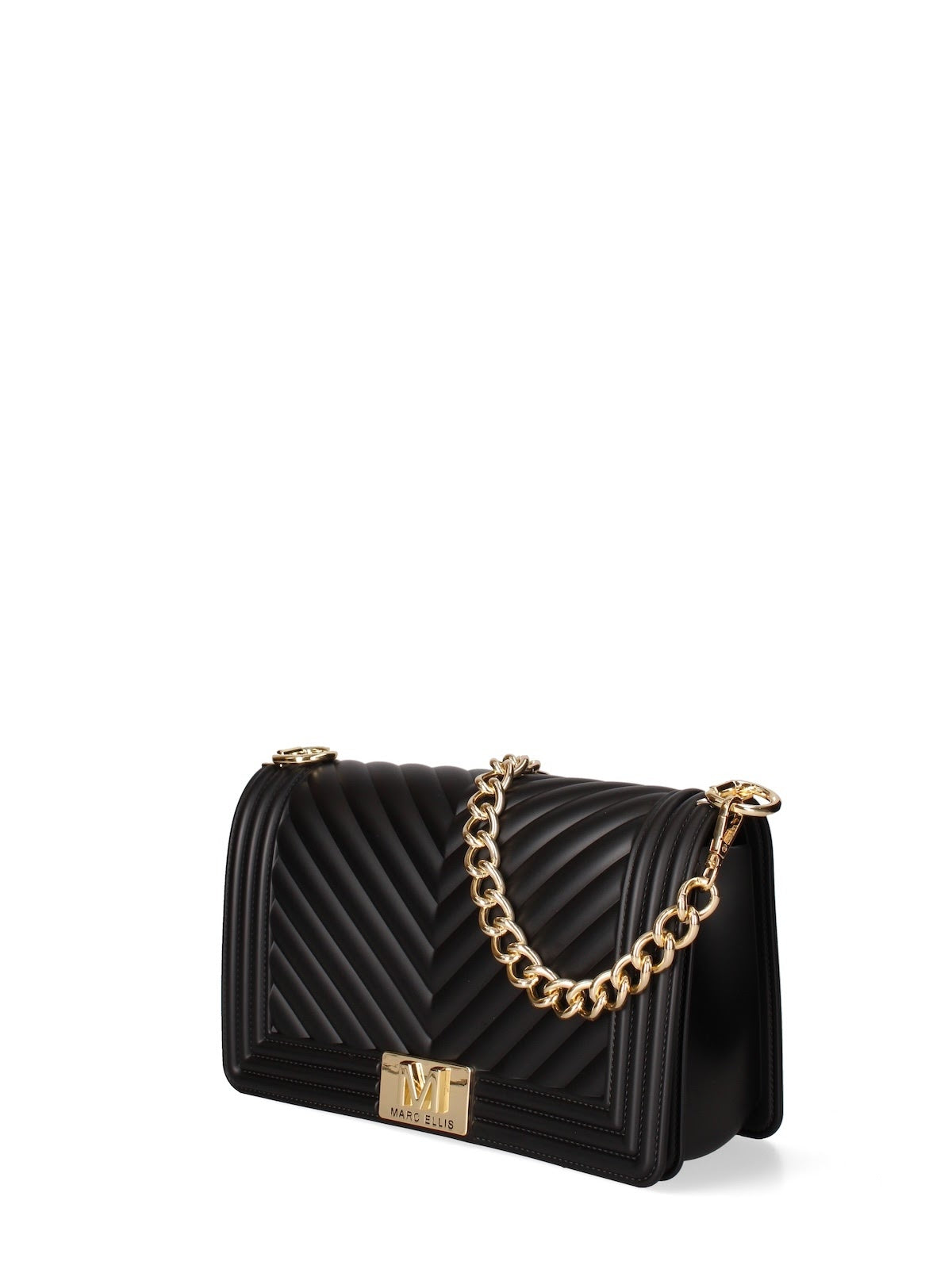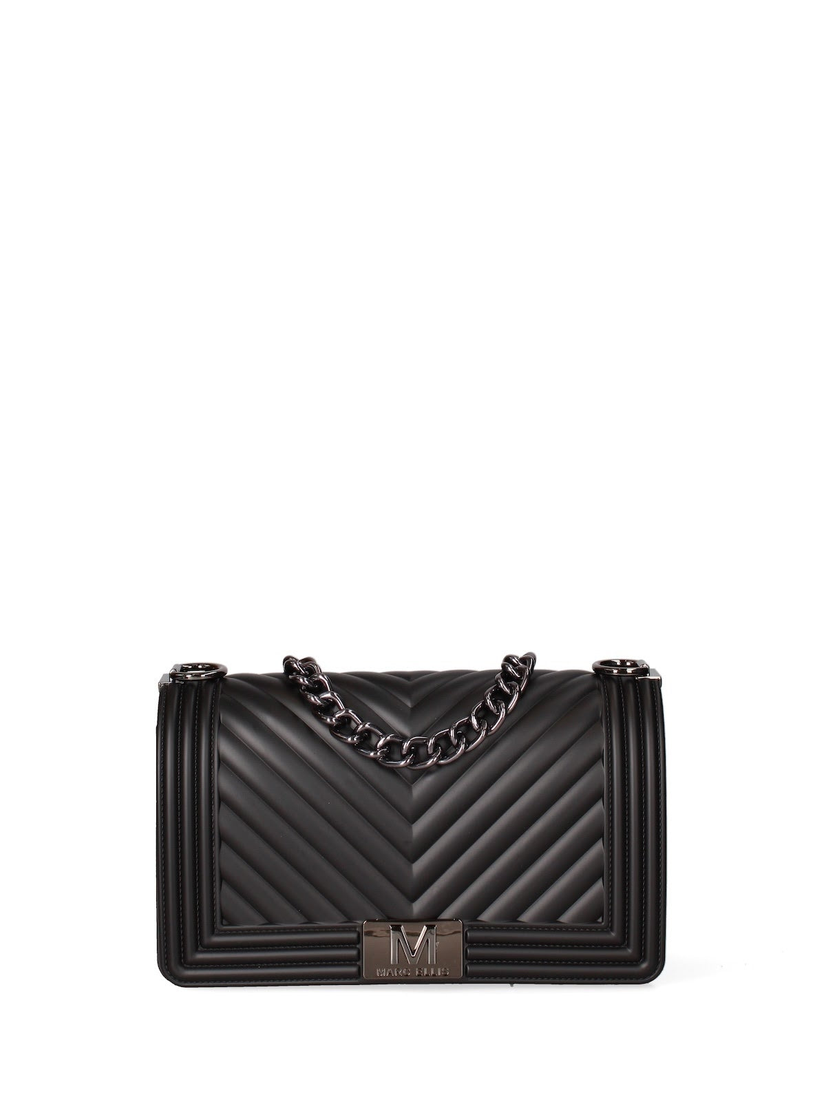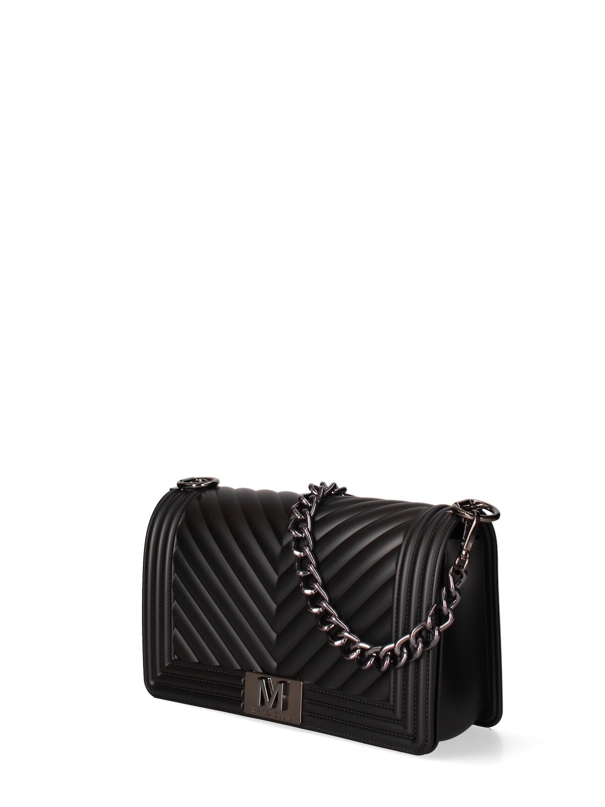 Borsa in pvc con chiusura magnetica. Tracolla in stoffa regolabile e removibile. Manico a catena.