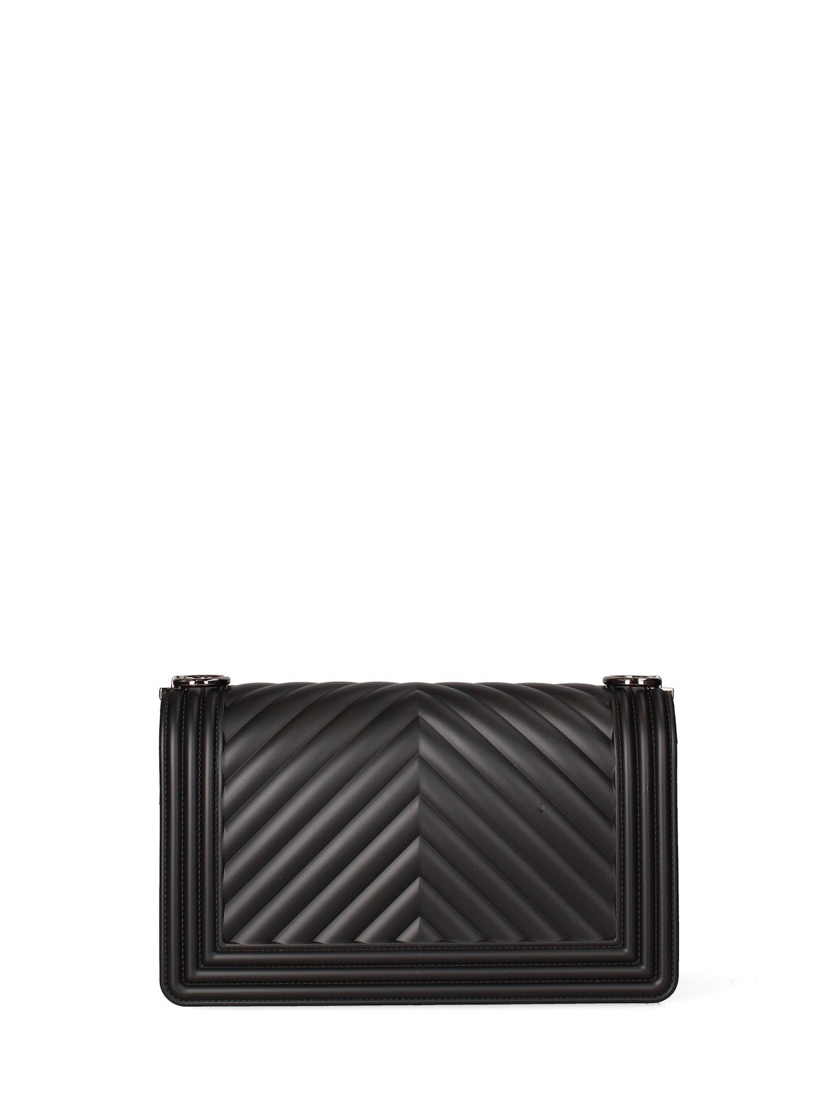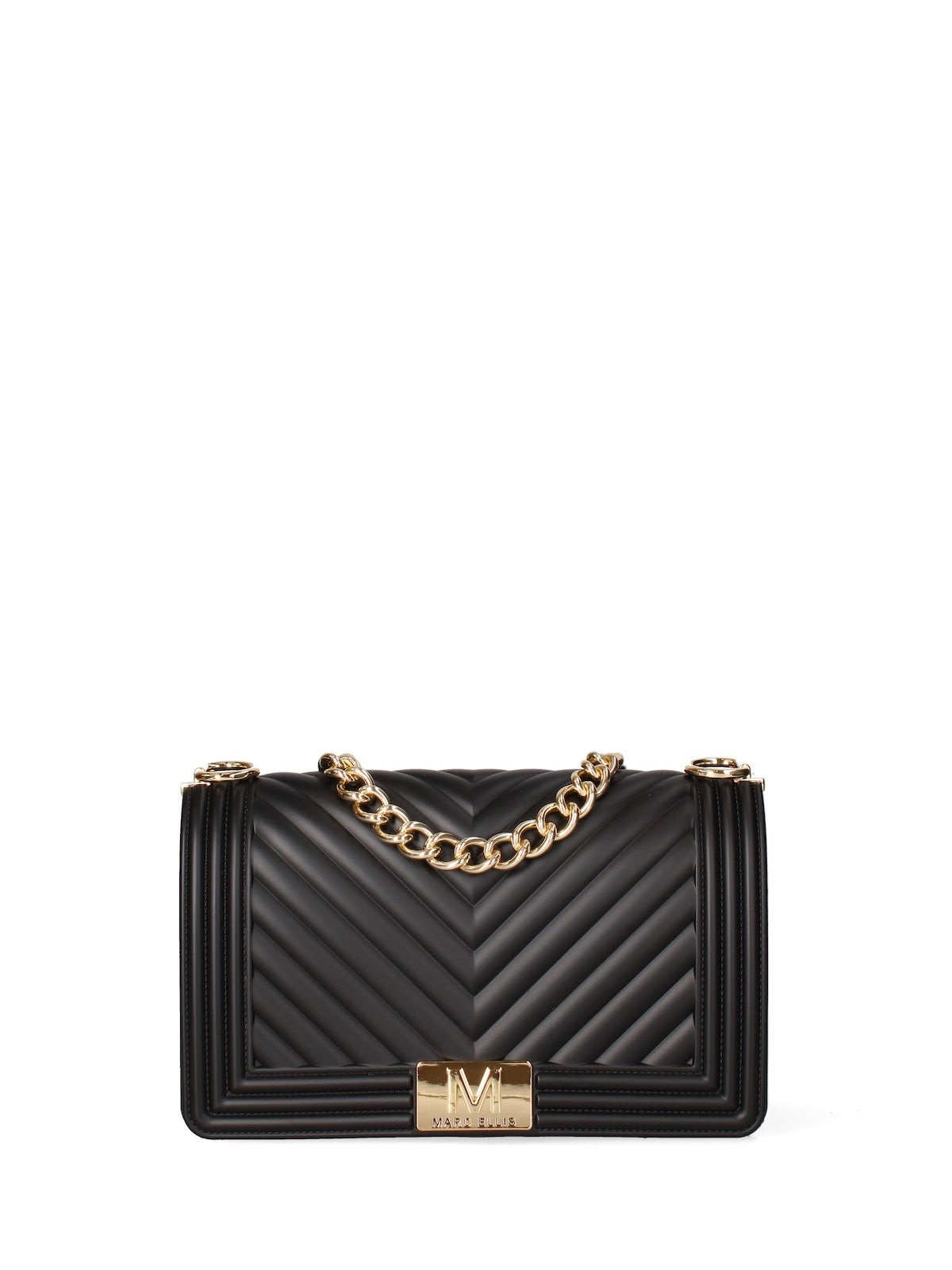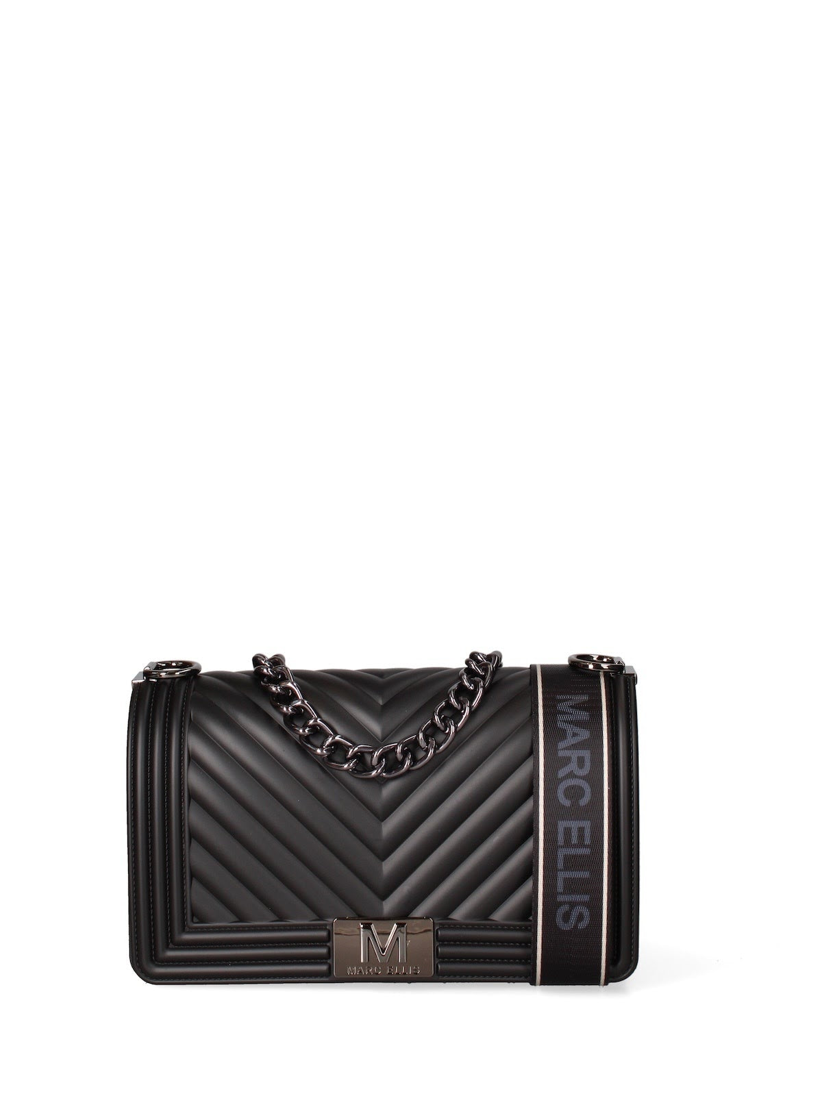 Borsa in pvc con chiusura magnetica. Tracolla in stoffa regolabile e removibile. Manico a catena.