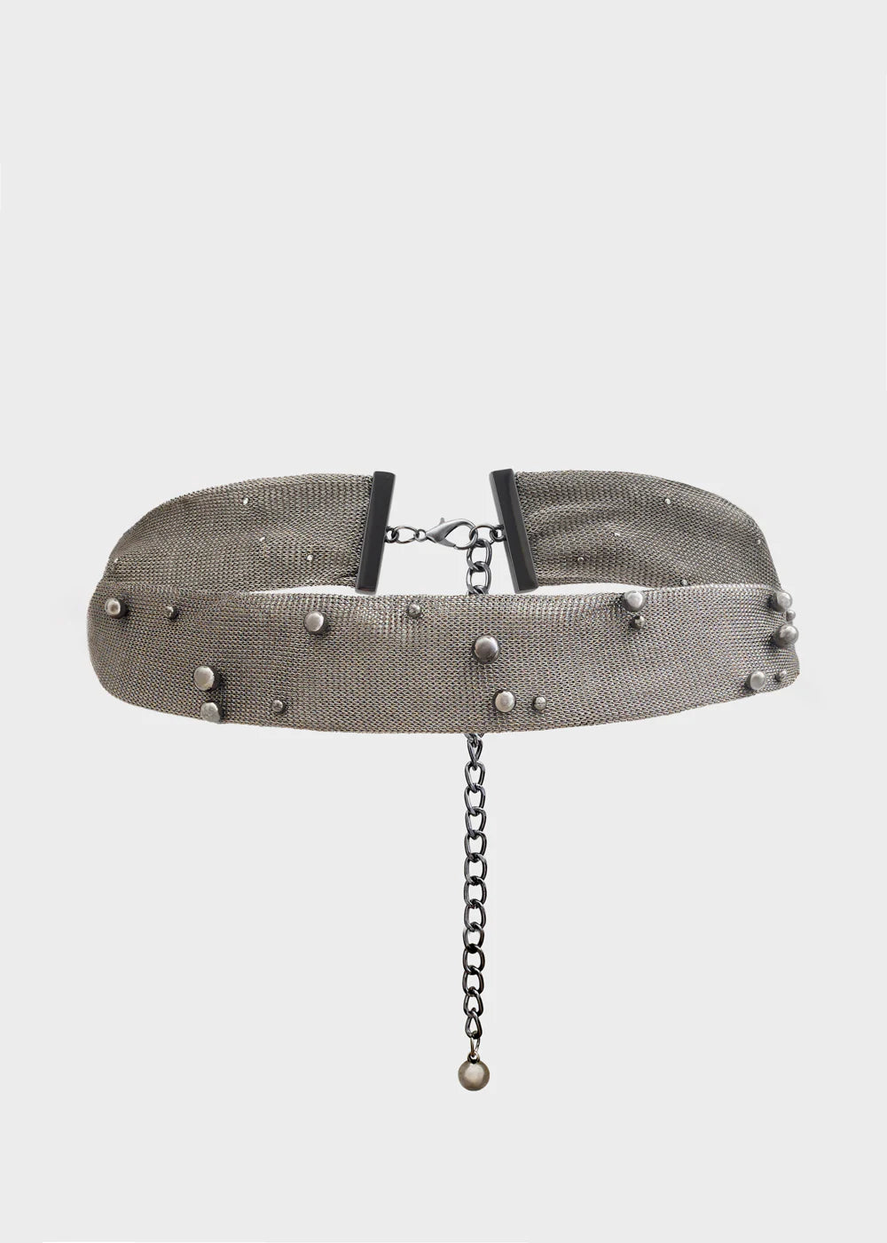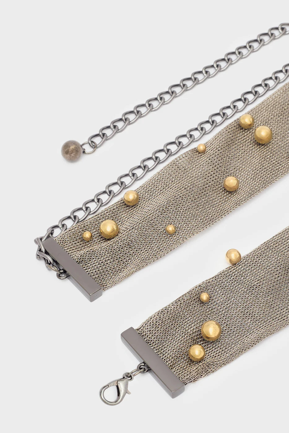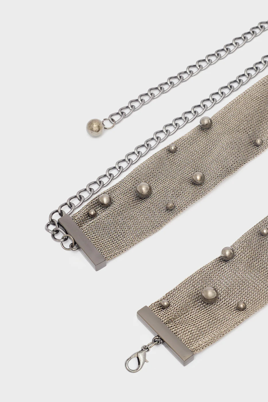 Cintura in tessuto luminoso arricchito da micro applicazioni a perla, un accessorio romantico e sofisticato che valorizza lo stile femminile.