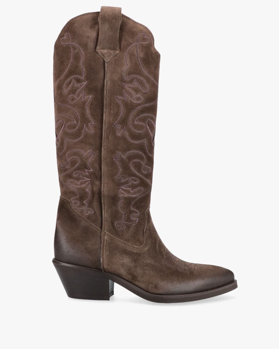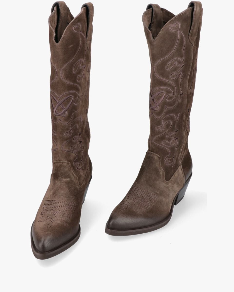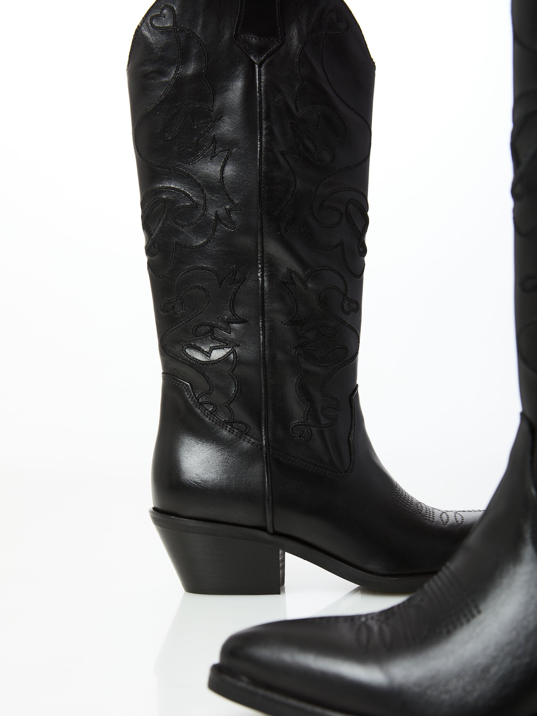 Texano in crosta con tacco 5cm e fondo antiscivolo , gambale impreziosito da ricami alto 32cm .