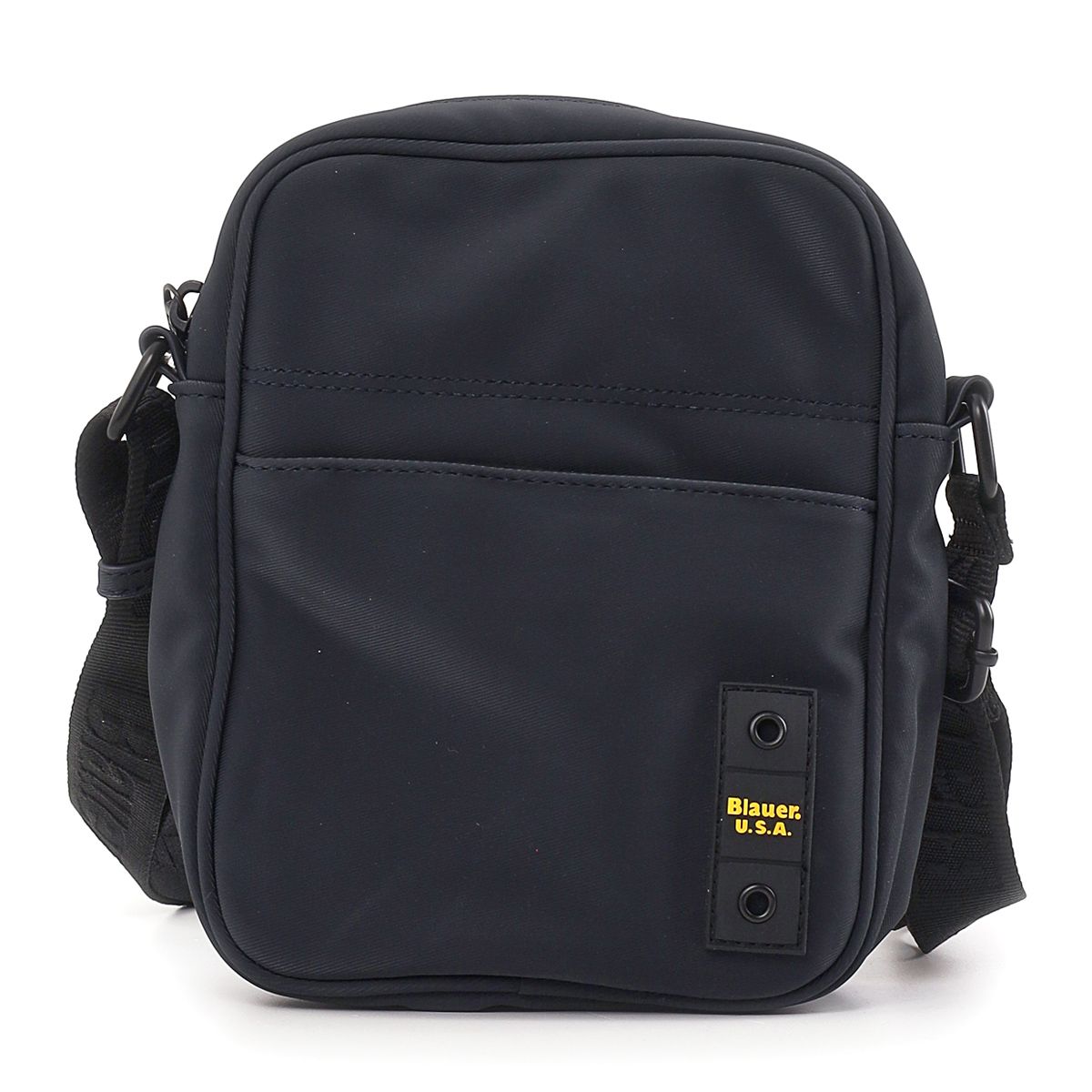 Blauer borsello in nylon, design alla moda con patch logo frontale