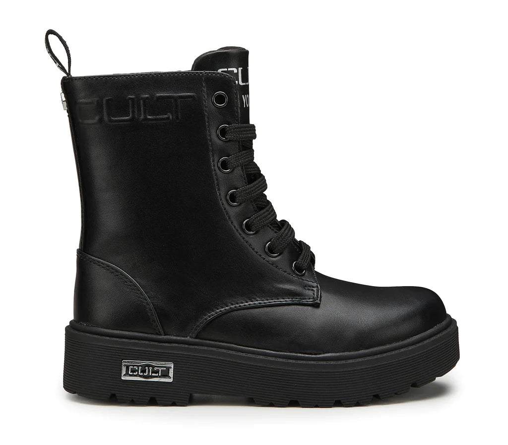 Realizzato in ecopelle nera, presenta lacci sulla tomaia rifinita con il logo in rilievo e una cerniera laterale per calzarlo con facilità. È provvisto di una suola dentellata in gomma nera. Può essere abbinato a gonne e abitini di stagione.