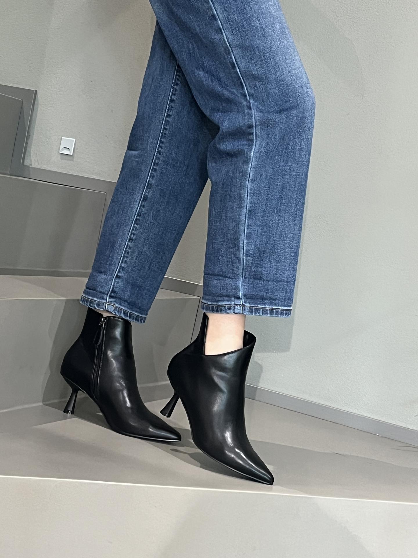 Stivaletto in pelle nero, zip su lato interno, tacco 65 cm, fondo in gomma.