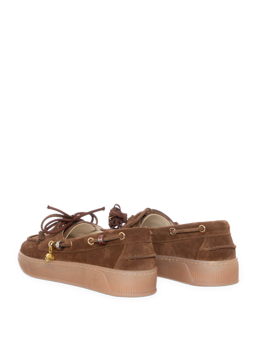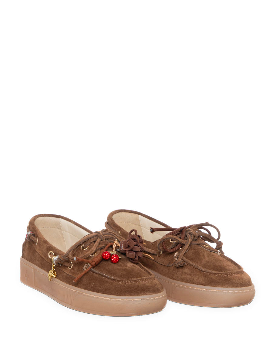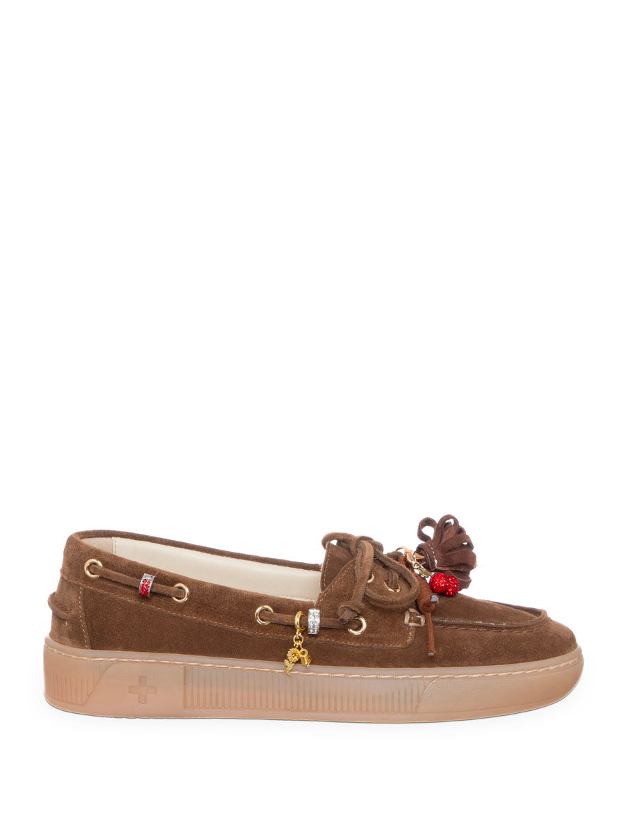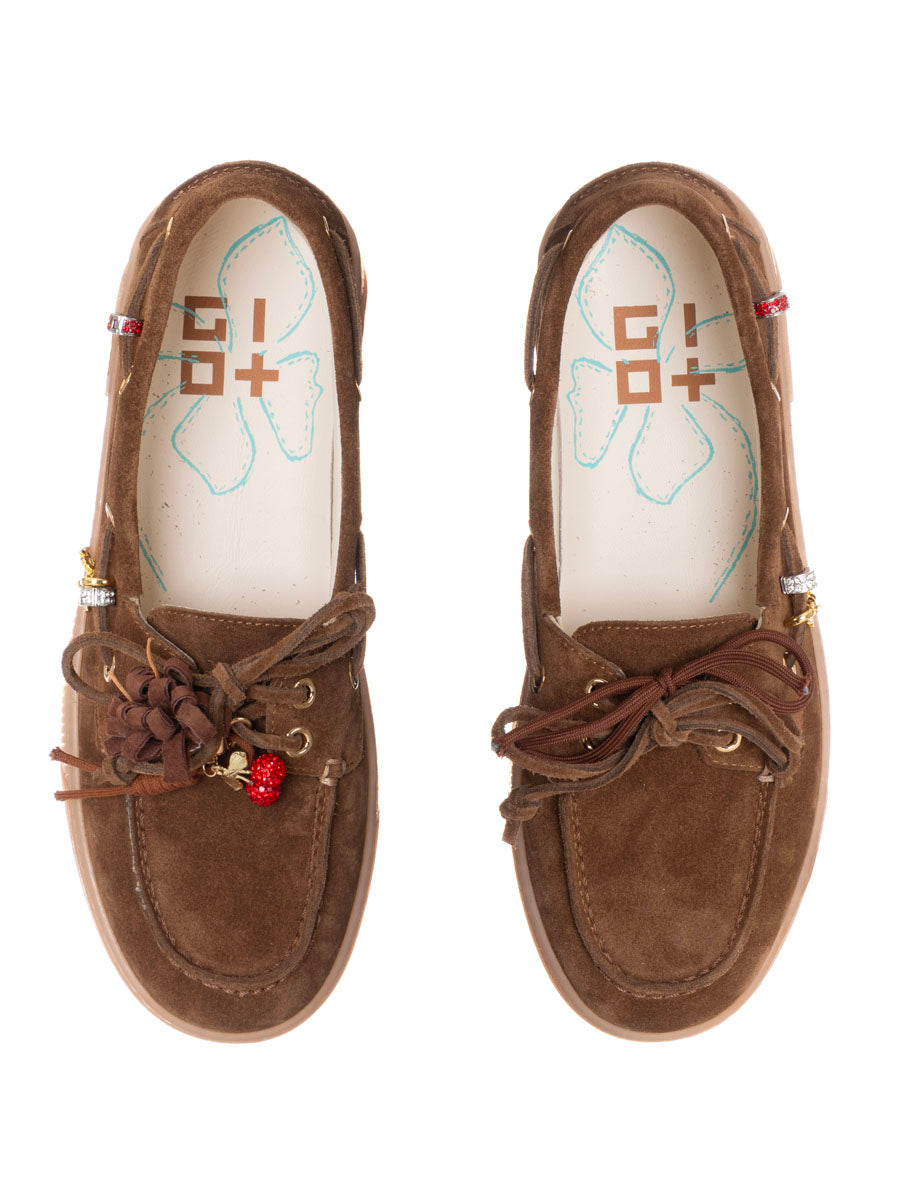 Mocassino Gio+ in camoscio con nappine in pelle e frange marroni applicate ai lacci, piccoli charm metallici dorati( con elementi rossi decorativi). Chiusura con lacci passanti laterali in stile boat shoe. Interno soletta chiara con stampa floreale e simbolo grafico.