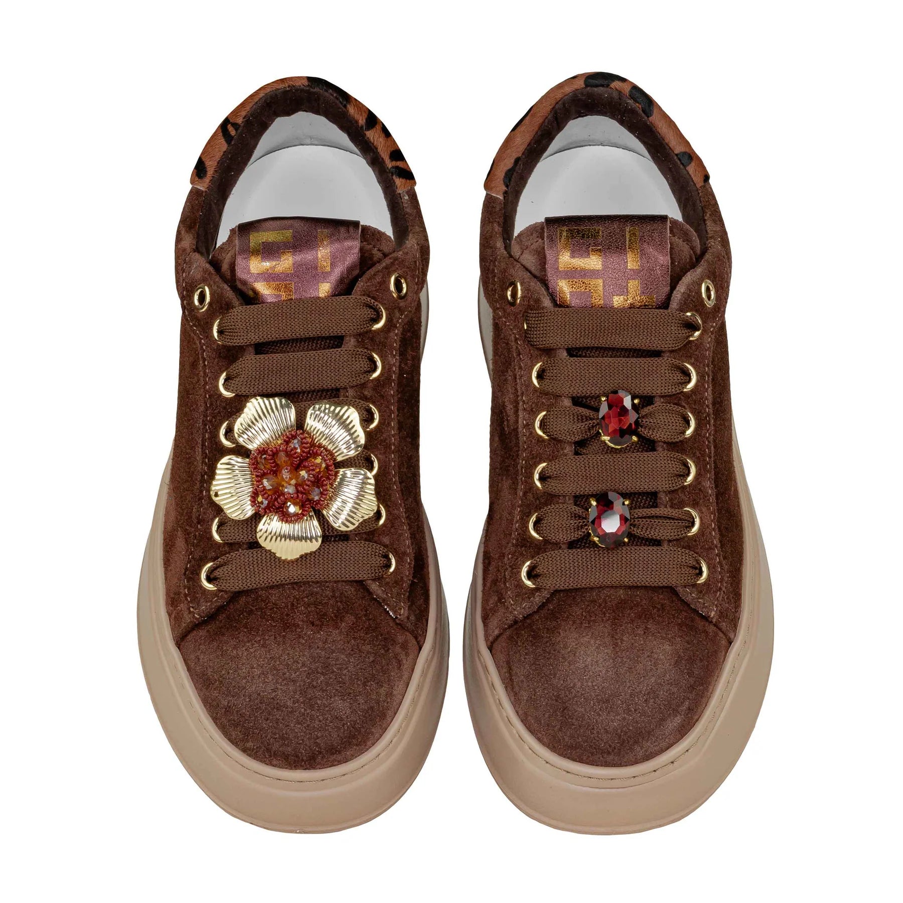 Gio+ pia408a combi cioccolato sneaker dallo stile deciso e ricercato, realizzata in camoscio color cioccolato con dettagli in cavallino stampato animalier sul tallone. arricchita da una decorazione gioiello sul davanti che dona un tocco glamour e distintivo. tomaia e soletta estraibile in pelle, per assicurare comfort e traspirabilità. fondo in gomma alto 4,5 cm che slancia la figura senza rinunciare alla comodità. perfetta per dare personalità ai look della stagione autunno inverno 2025. made in italy.