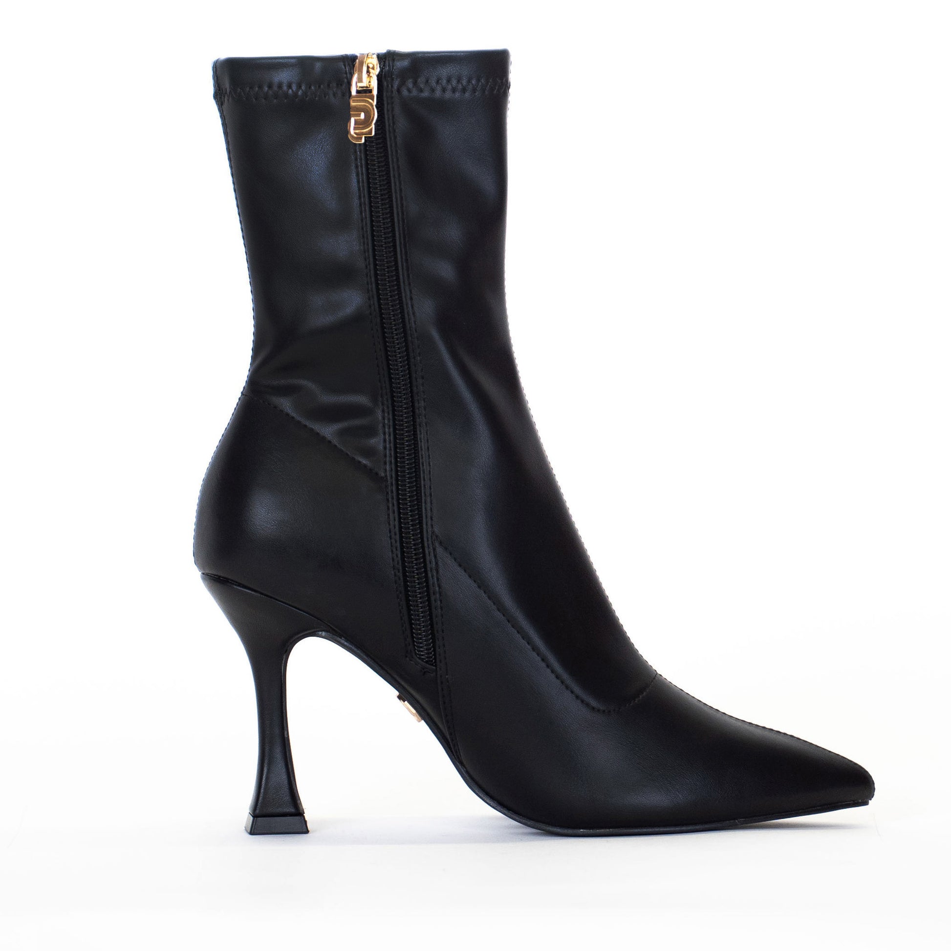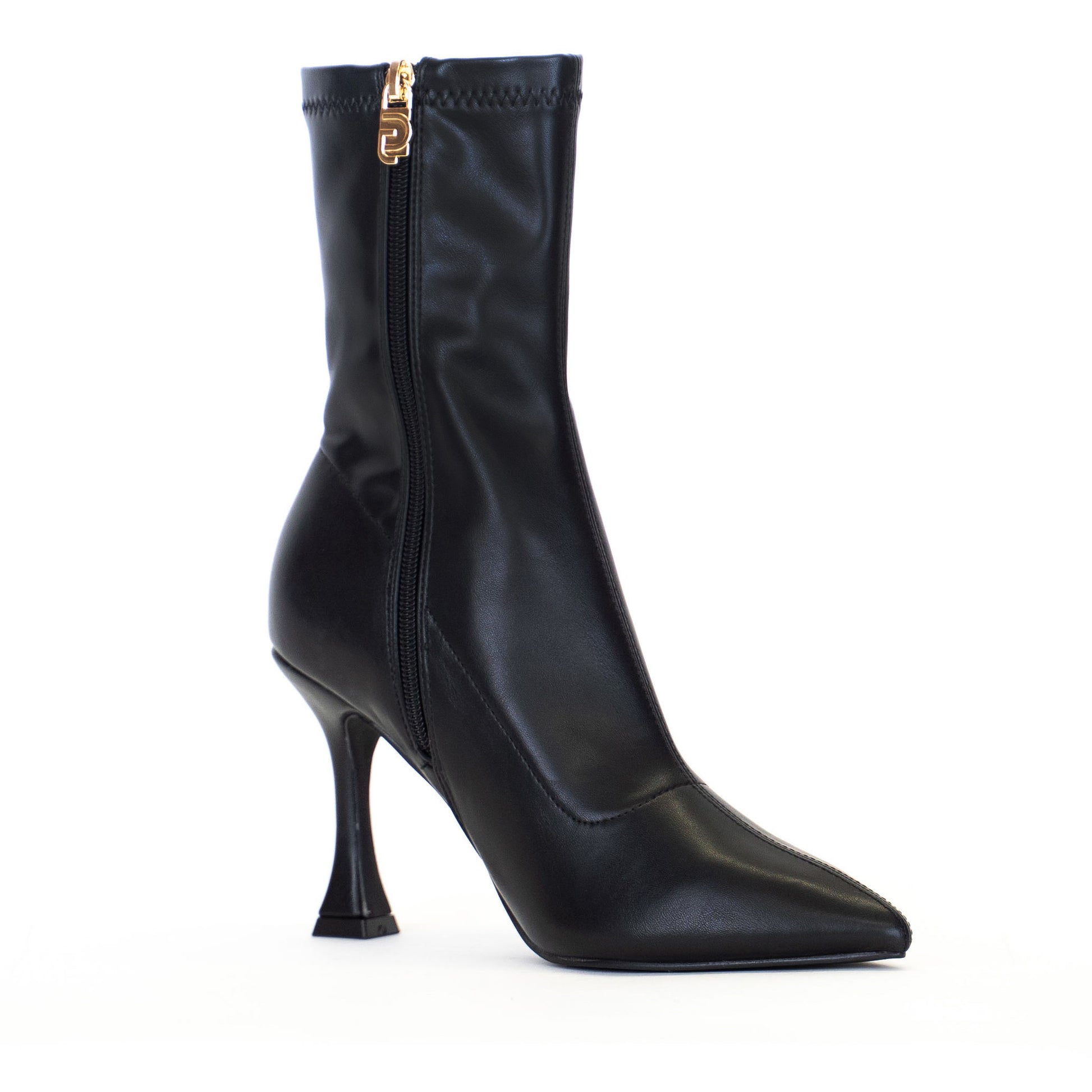 Tronchetto a punta elasticizzato in similpelle con tacco alto 9 cm e gambale 12 cm , zip laterale e fondo antiscivolo.