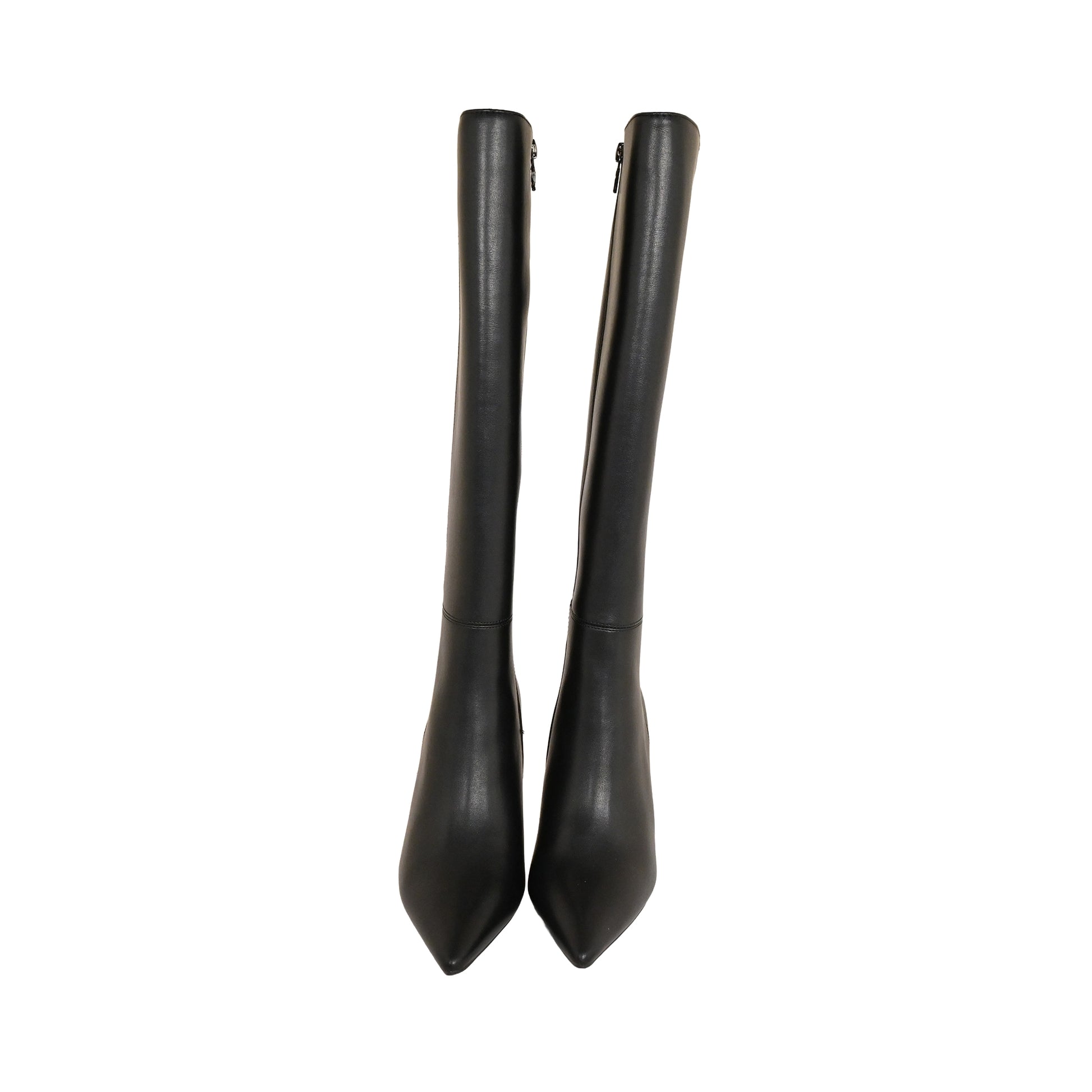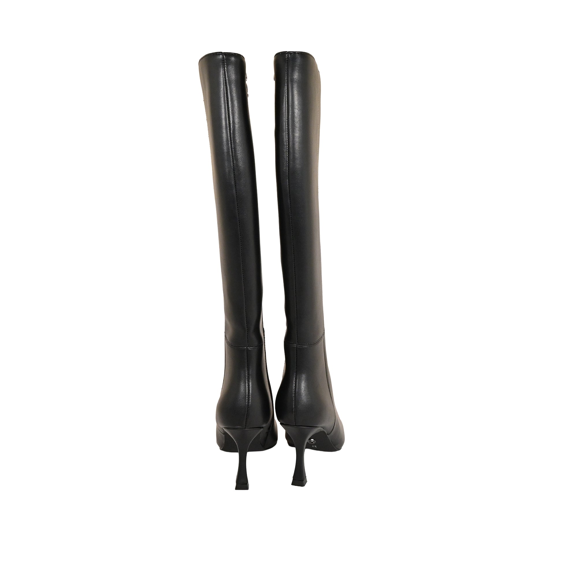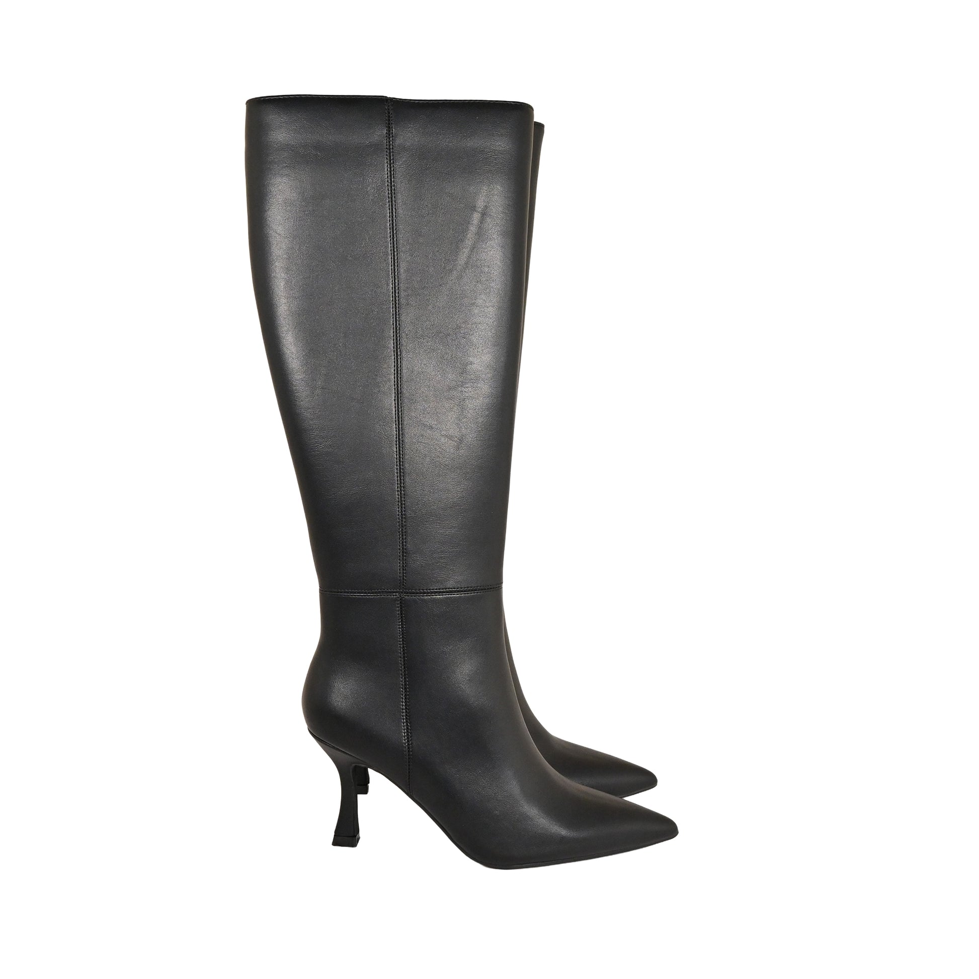 Stivale a punta in similpelle nero con tacco 8 cm , zip laterale per l'apertura e fondo antiscivolo. Cuciture in rilievo tono su tono .