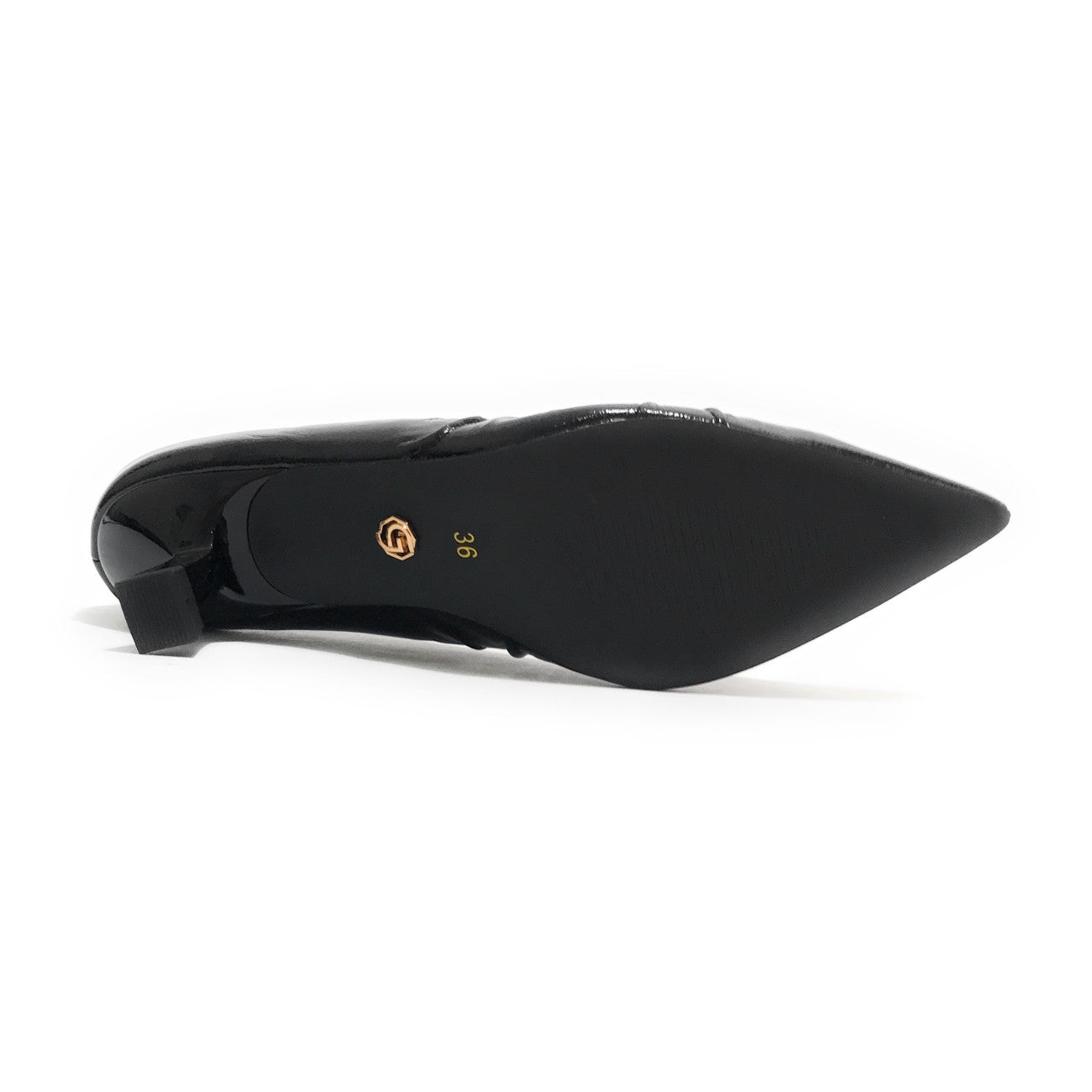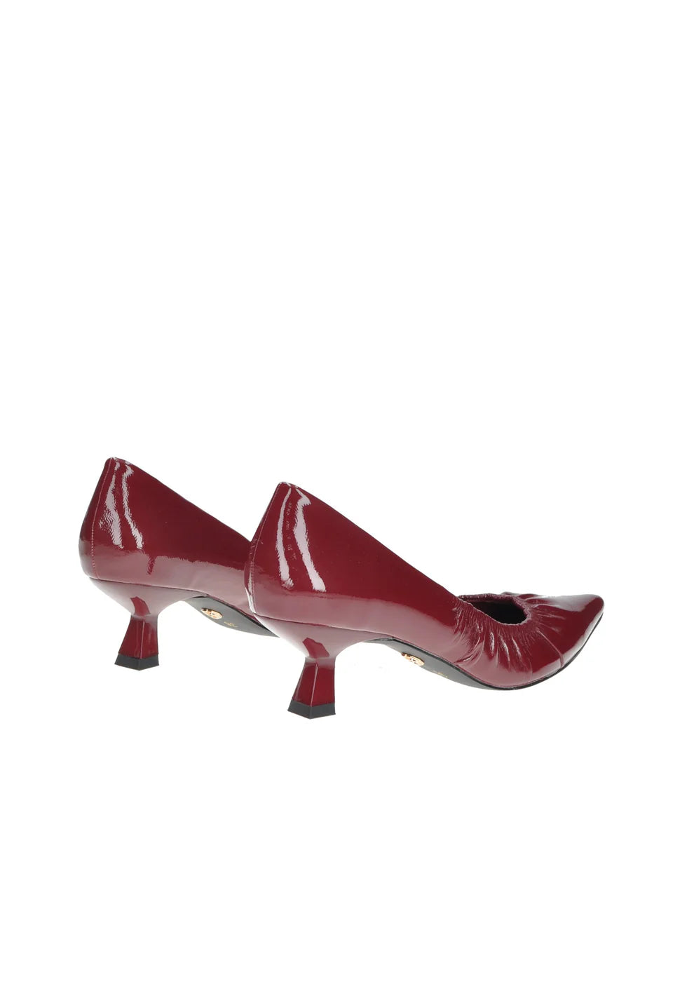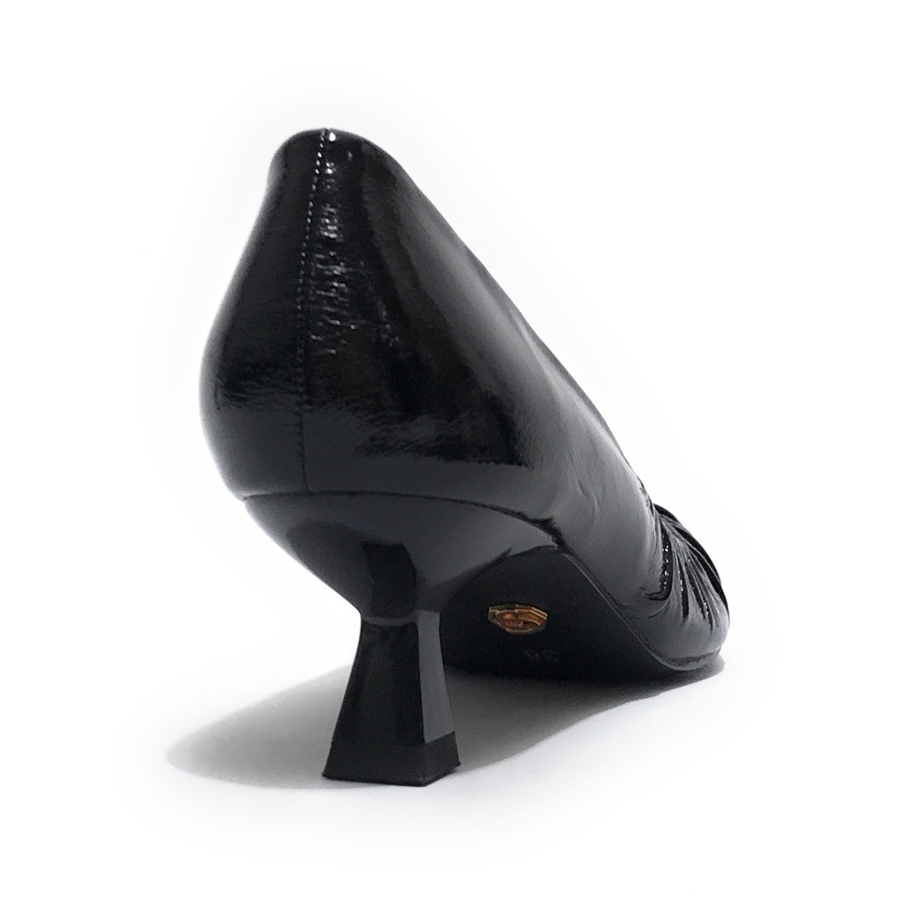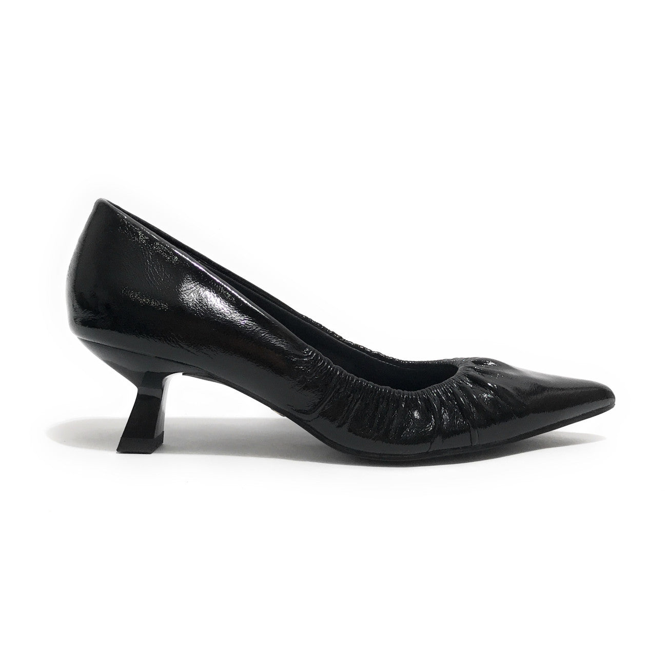 Dècolletè a punta realizzata in ecopelle arricciata effetto lucido, di colore nero. Tacco rivestito in ecopelle. Sottopiede in vera pelle. Tacco 5 cm.