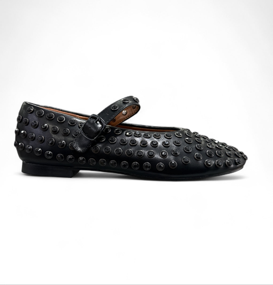 Ballerina strass nera, scollo a uovo, cinturino regolabile.