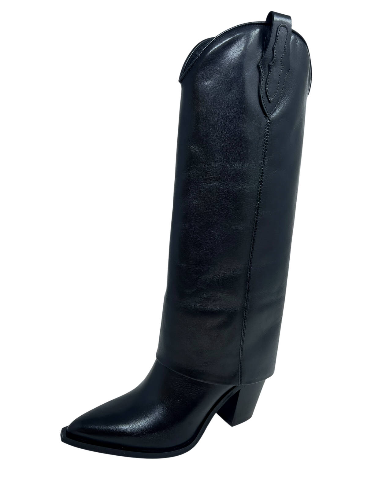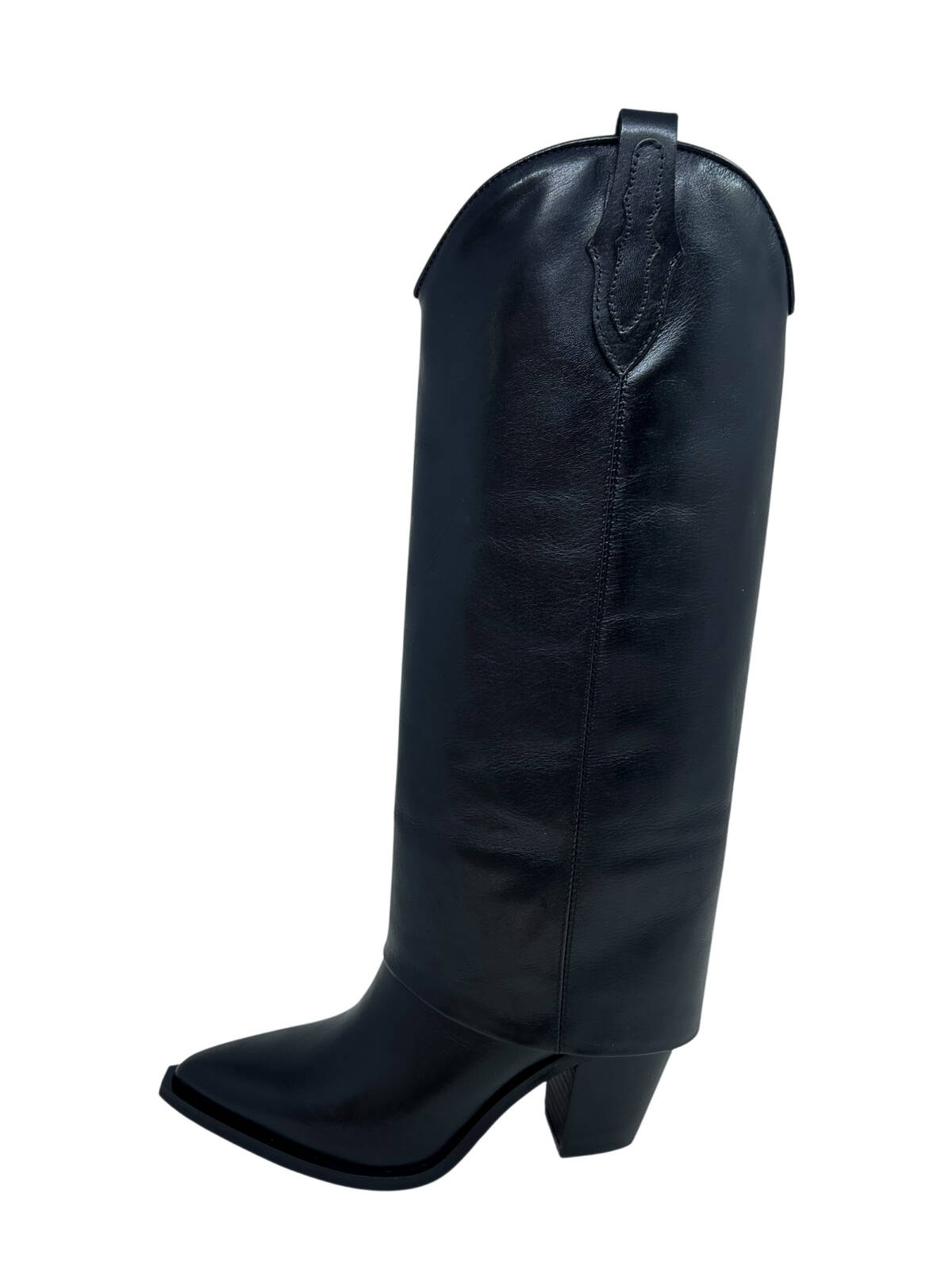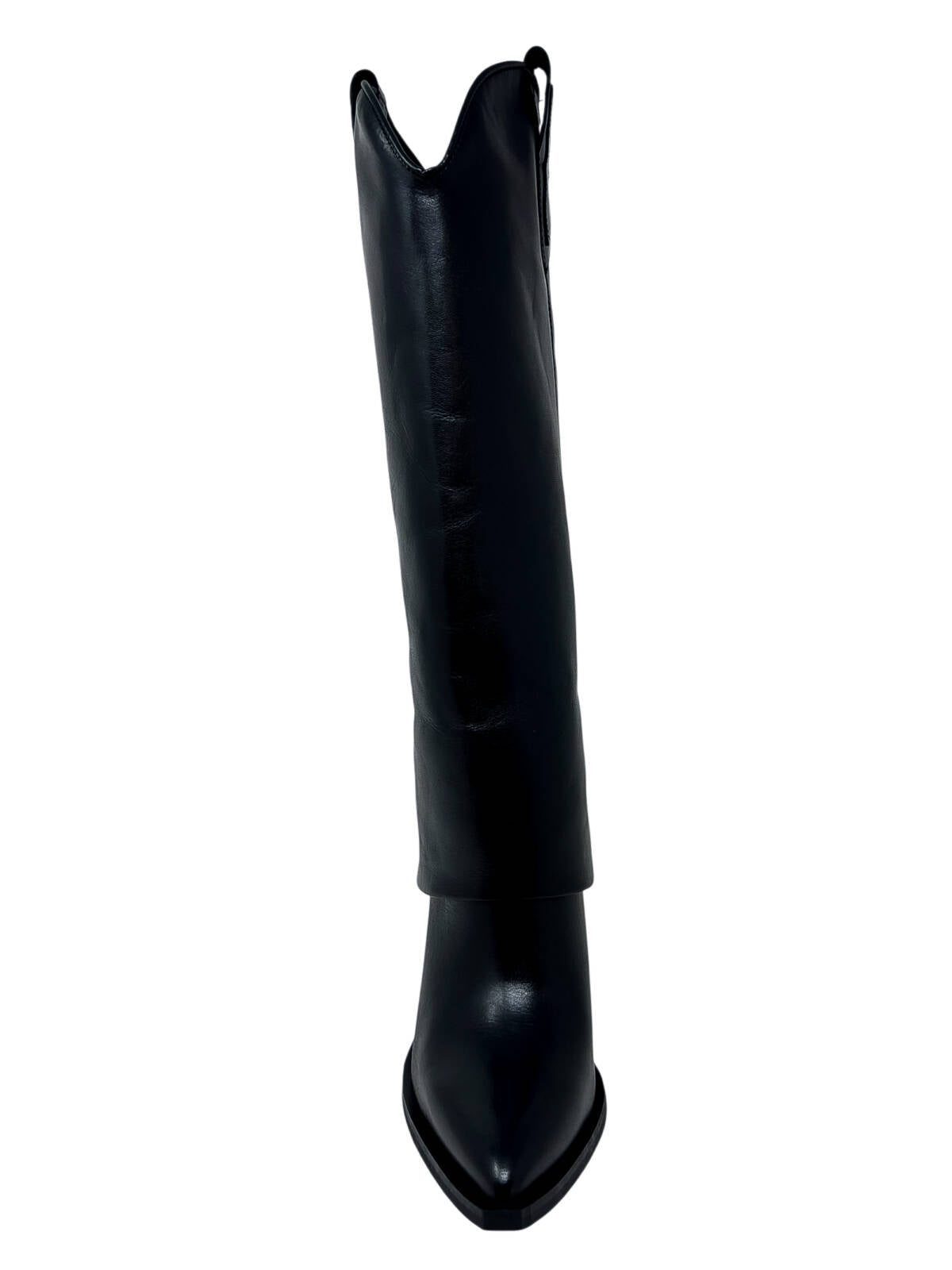 Stivale in pelle nera stile camperos, altezza sotto il ginocchio con ghetta e tacco di 8 centimetri.