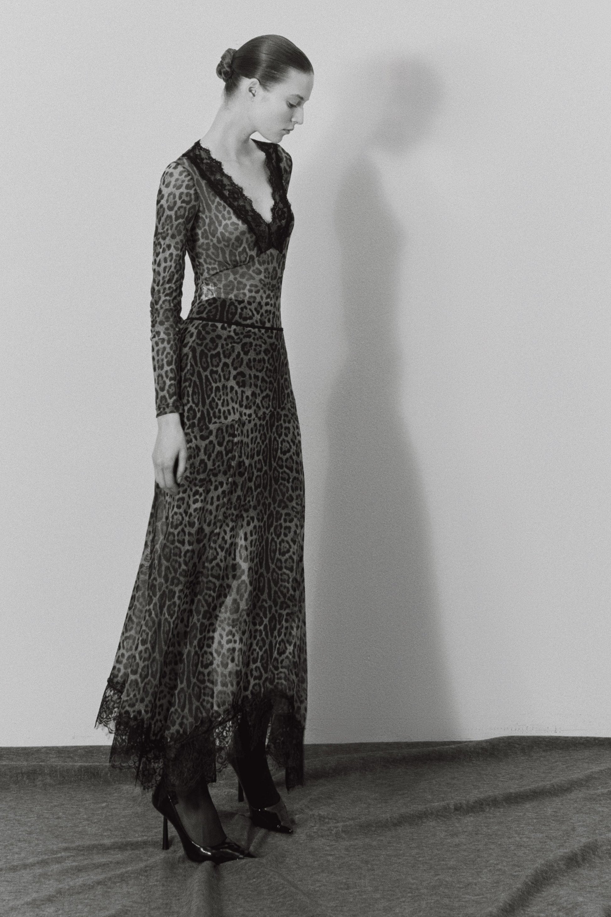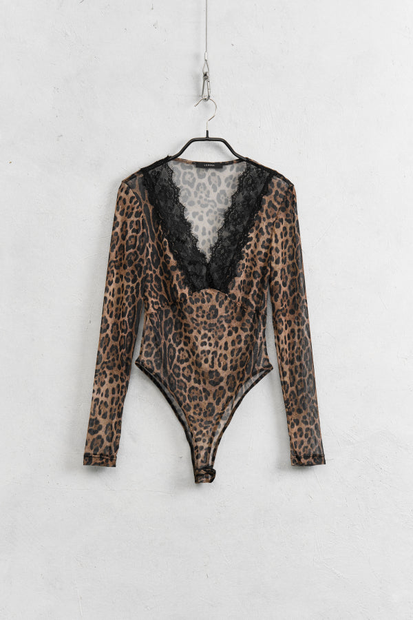 Body con scollo a V fantasia animalier, chiusura inferiore con clips, dettaglio trasparenza, vestibilità regolare.
