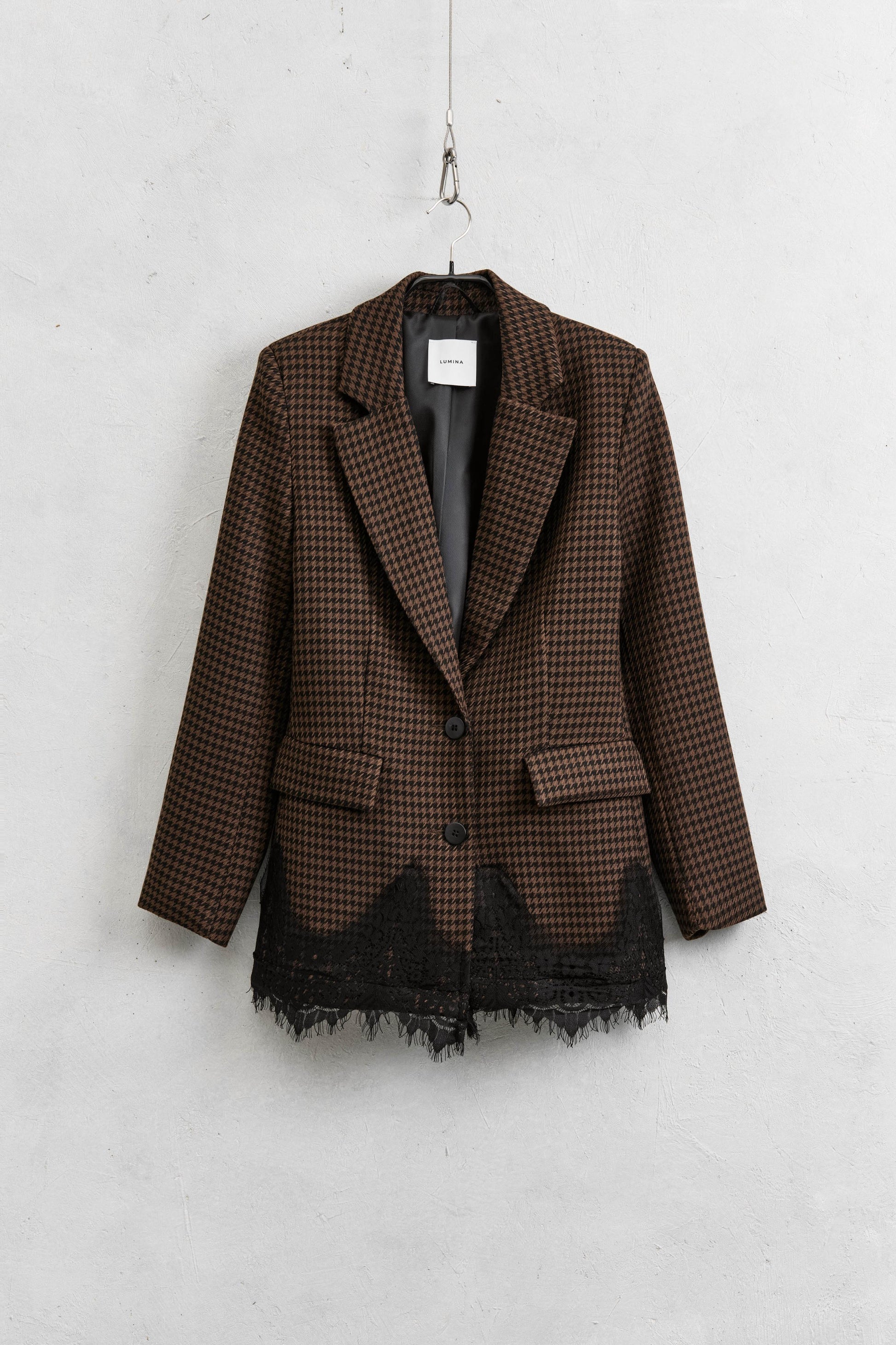 Blazer in principe di galles, marrone/nero, doppio bottone sul davanti, con inserti in pizzo.