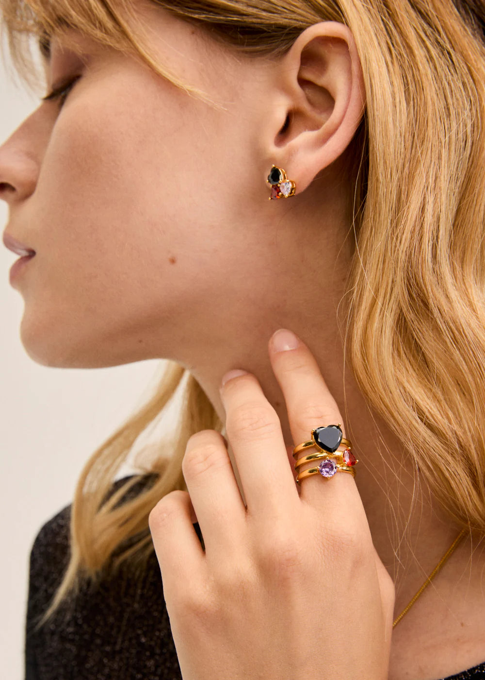Anello placcato oro con tre pietre a forma di cuore in diverse tonalità, montate su una fascia tripla. Un accessorio romantico e colorato che cattura l'attenzione.