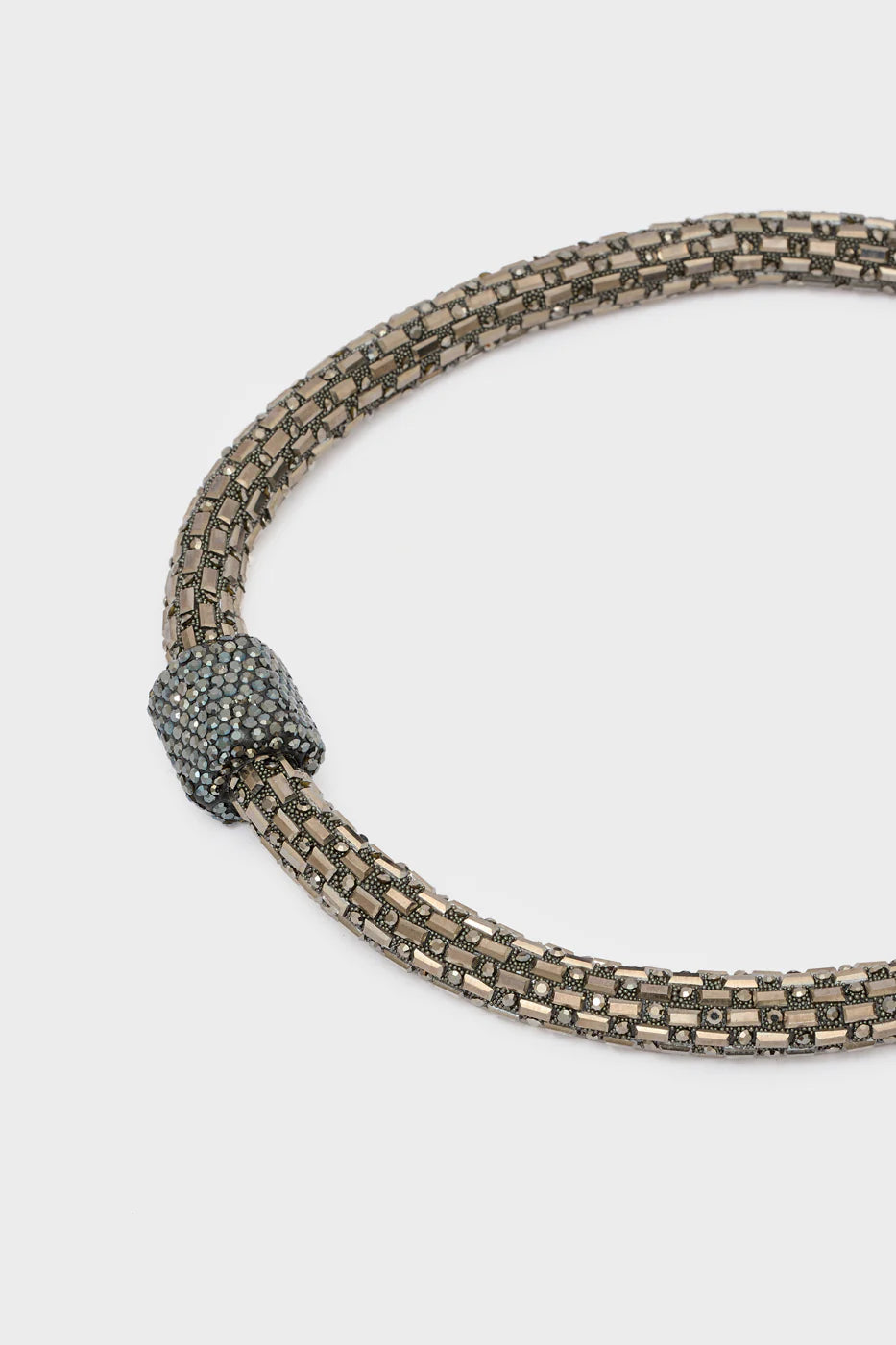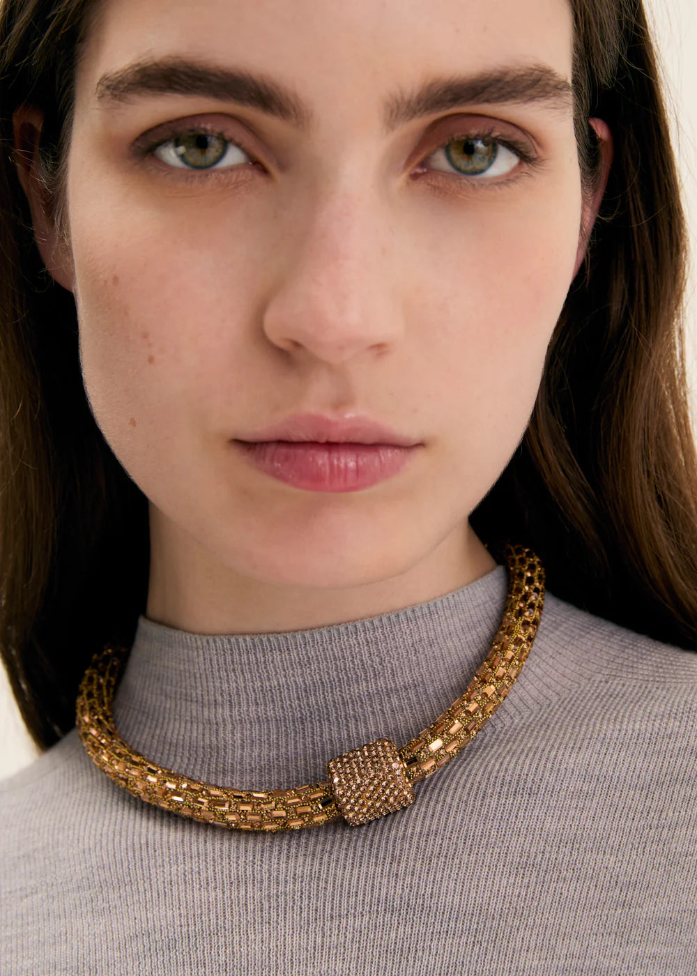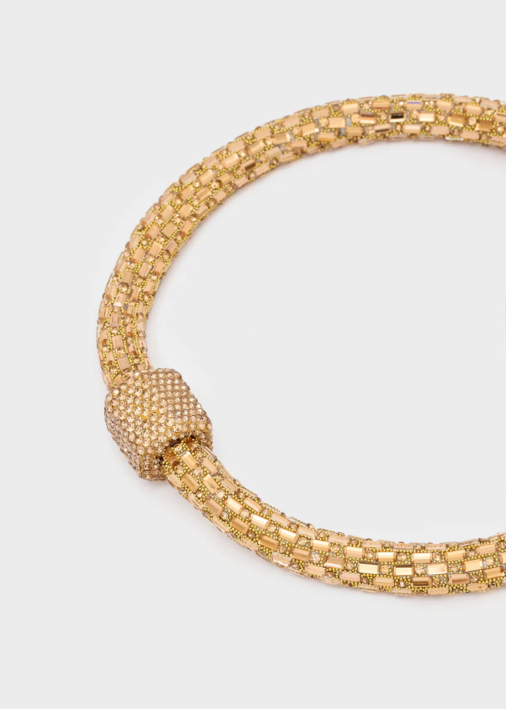 Collana a girocollo rigida con maglia intrecciata e dettaglio centrale luminoso, perfetta per aggiungere un tocco raffinato a look eleganti.
