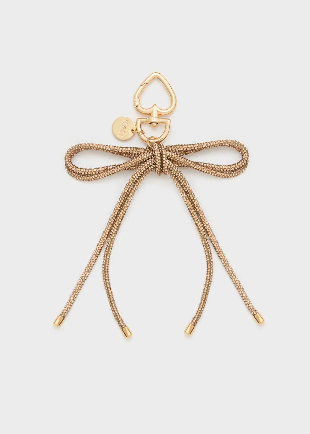 Portachiavi elegante a forma di fiocco in cordino dorato con moschettone a cuore. Raffinato e trendy, dona un dettaglio chic e romantico a zaini e borse.