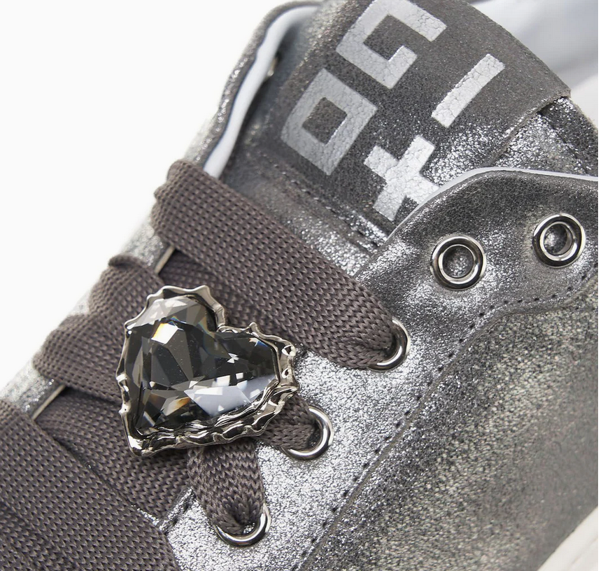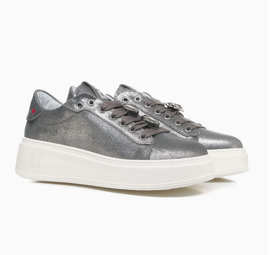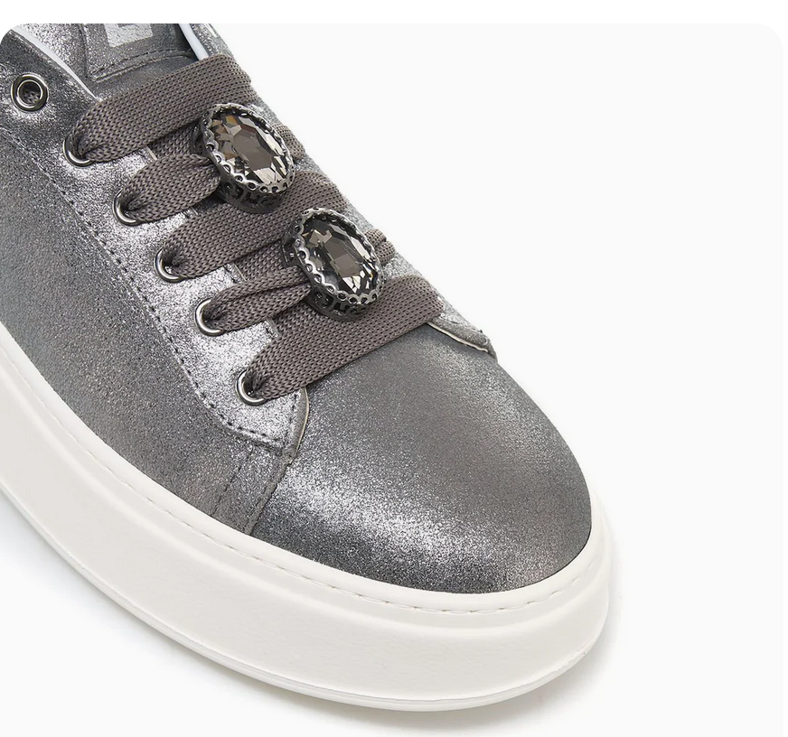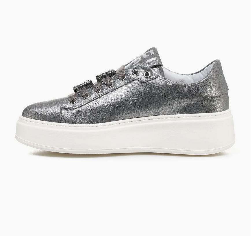 Sneakers in pelle argento, fondo in gomma 5 cm bianco, dotata di lacci con pietre argento.