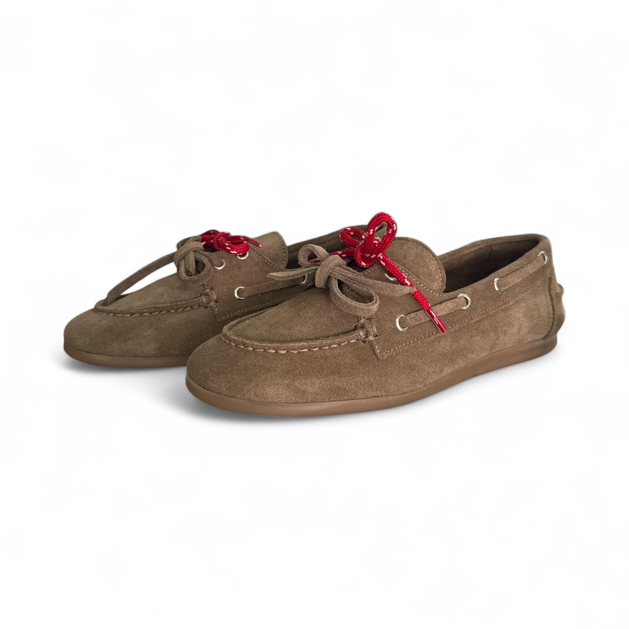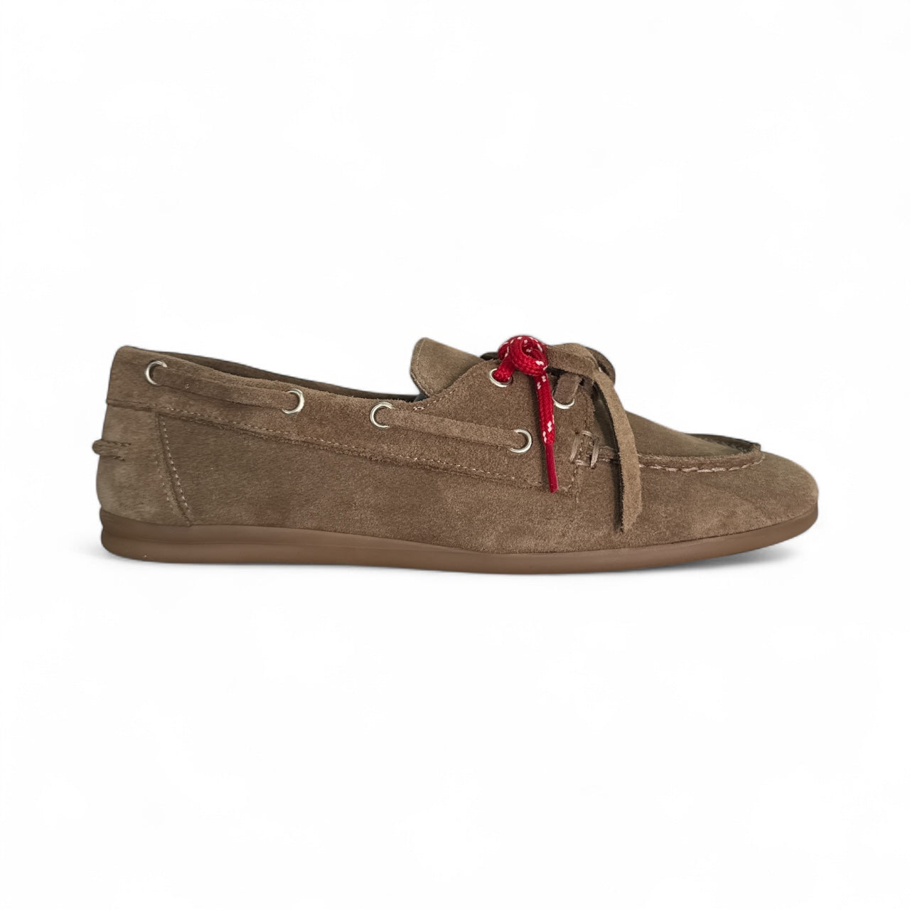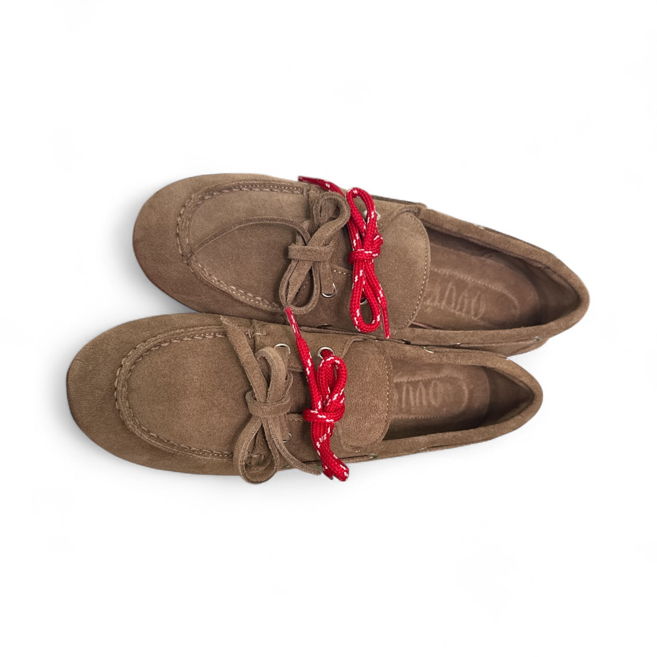Mocassino in crosta con chiusura laccio ,sottopiede imbottito e suola in gomma alta 1 cm . In dotazione doppio laccio .