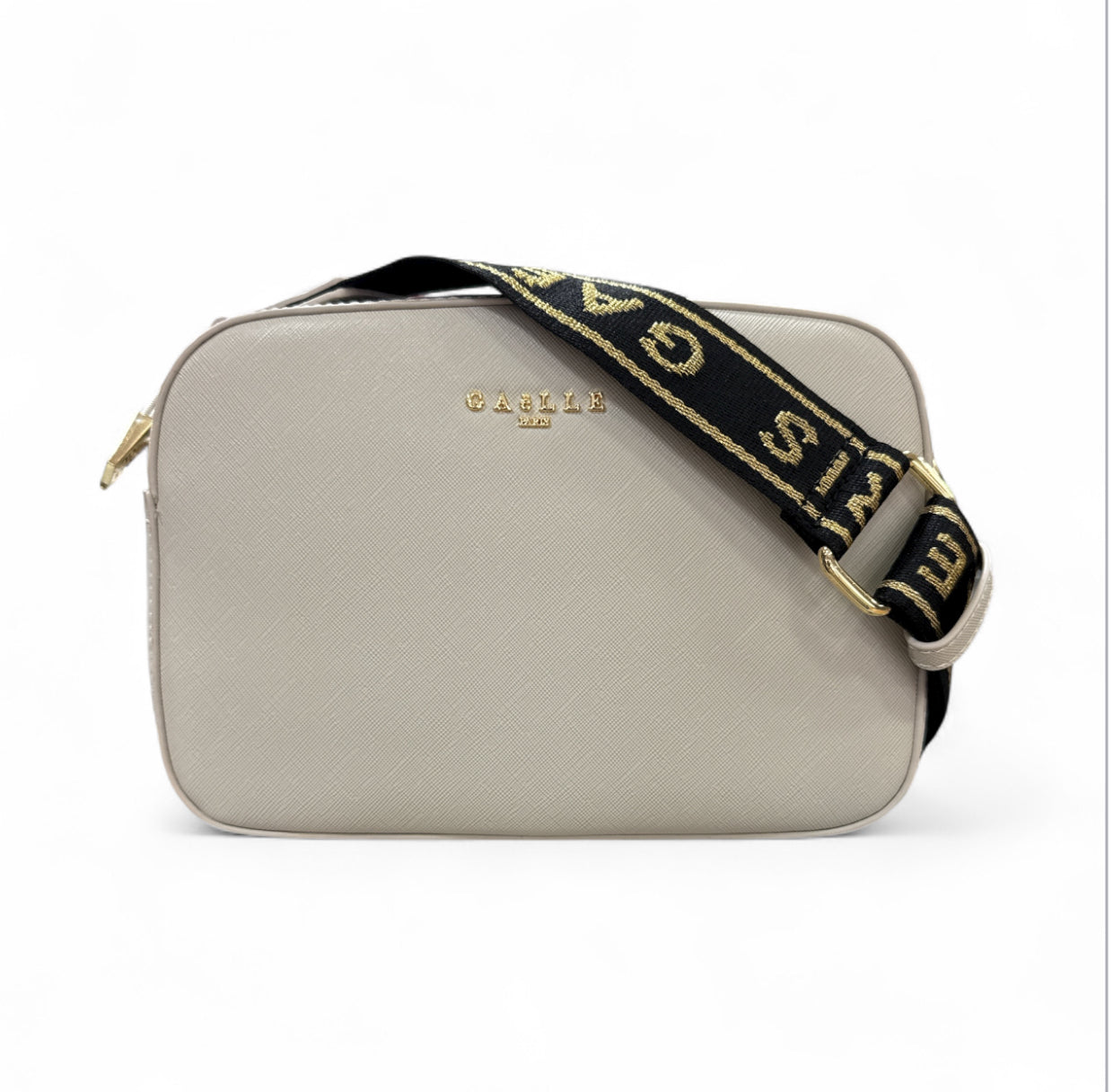 Regular camera bag con nastro lurex in ecopelle saffiano, chiusura con zip.