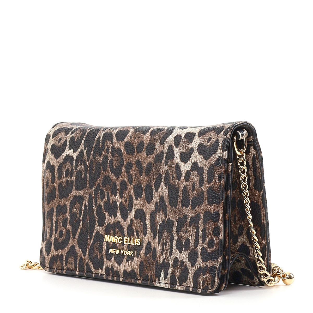 Borsa a tracolla con patta sul davanti in ecopelle stampa maculata , tracolla metallica color oro con cursore per regolarne la lunghezza , tasca interna con zip.