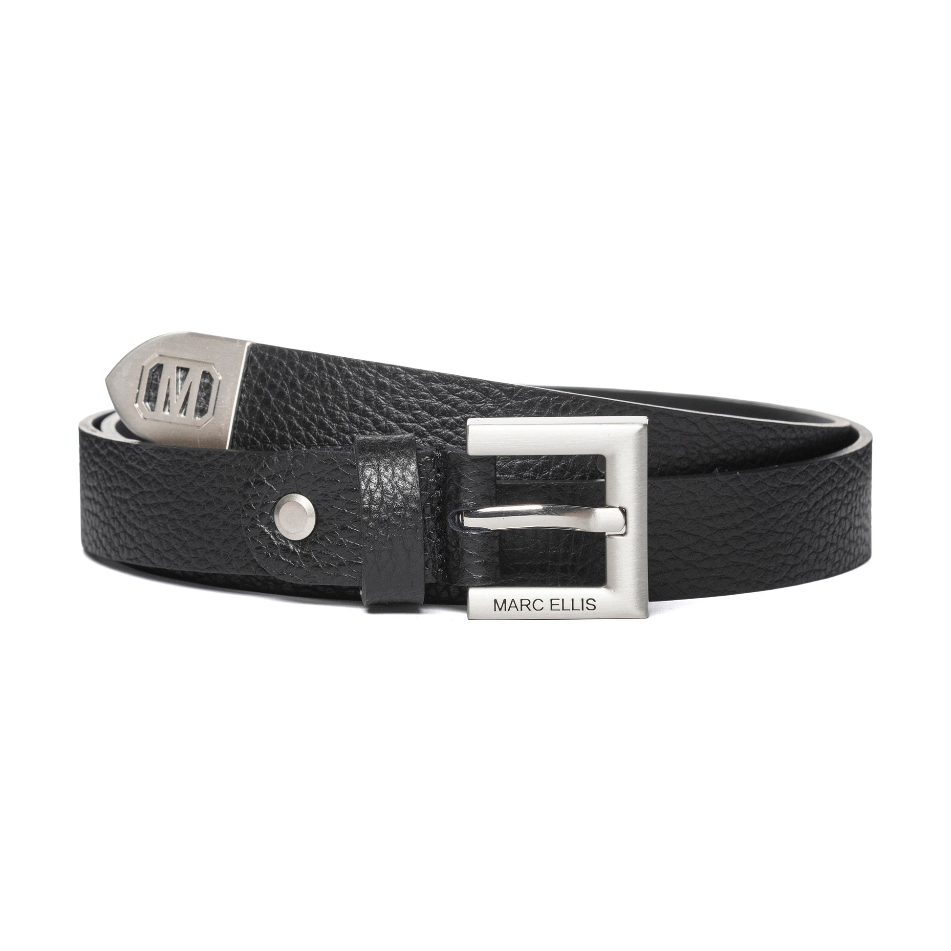Cintura Marc Ellis in pelle martellata con fibbia metallica logata , punta terminale in metallo anch'essa logata e passante in pelle .