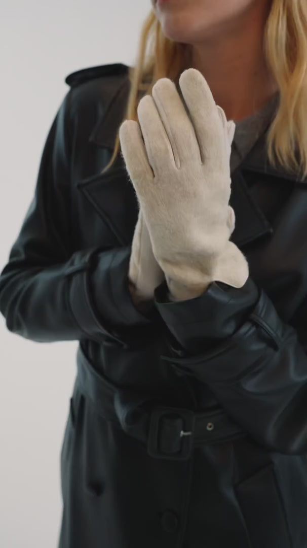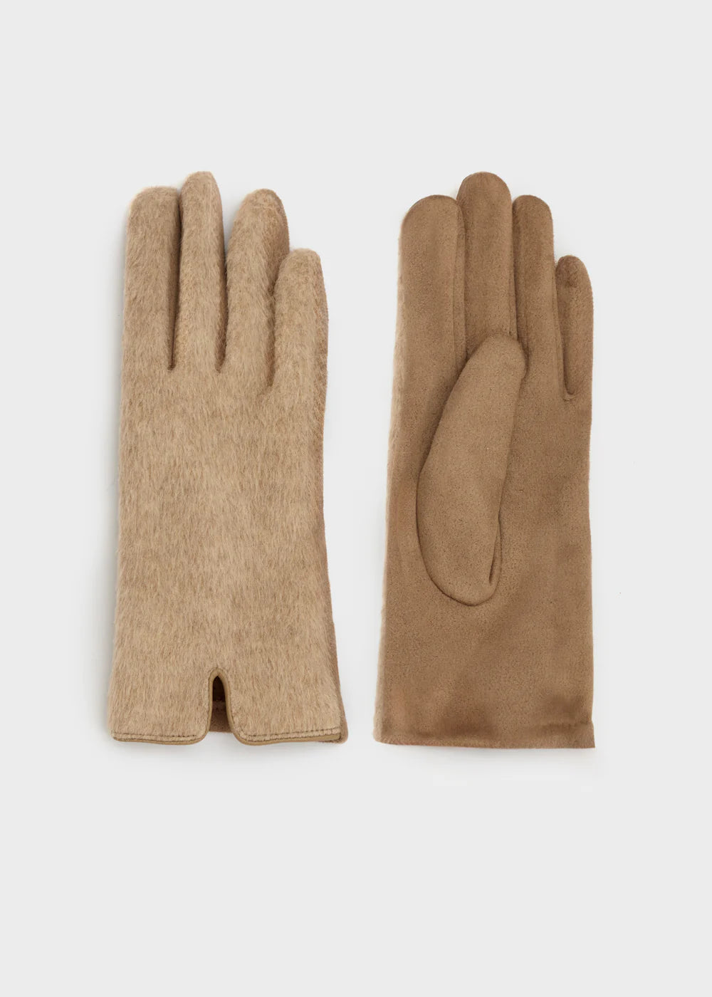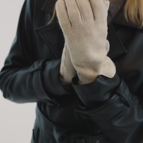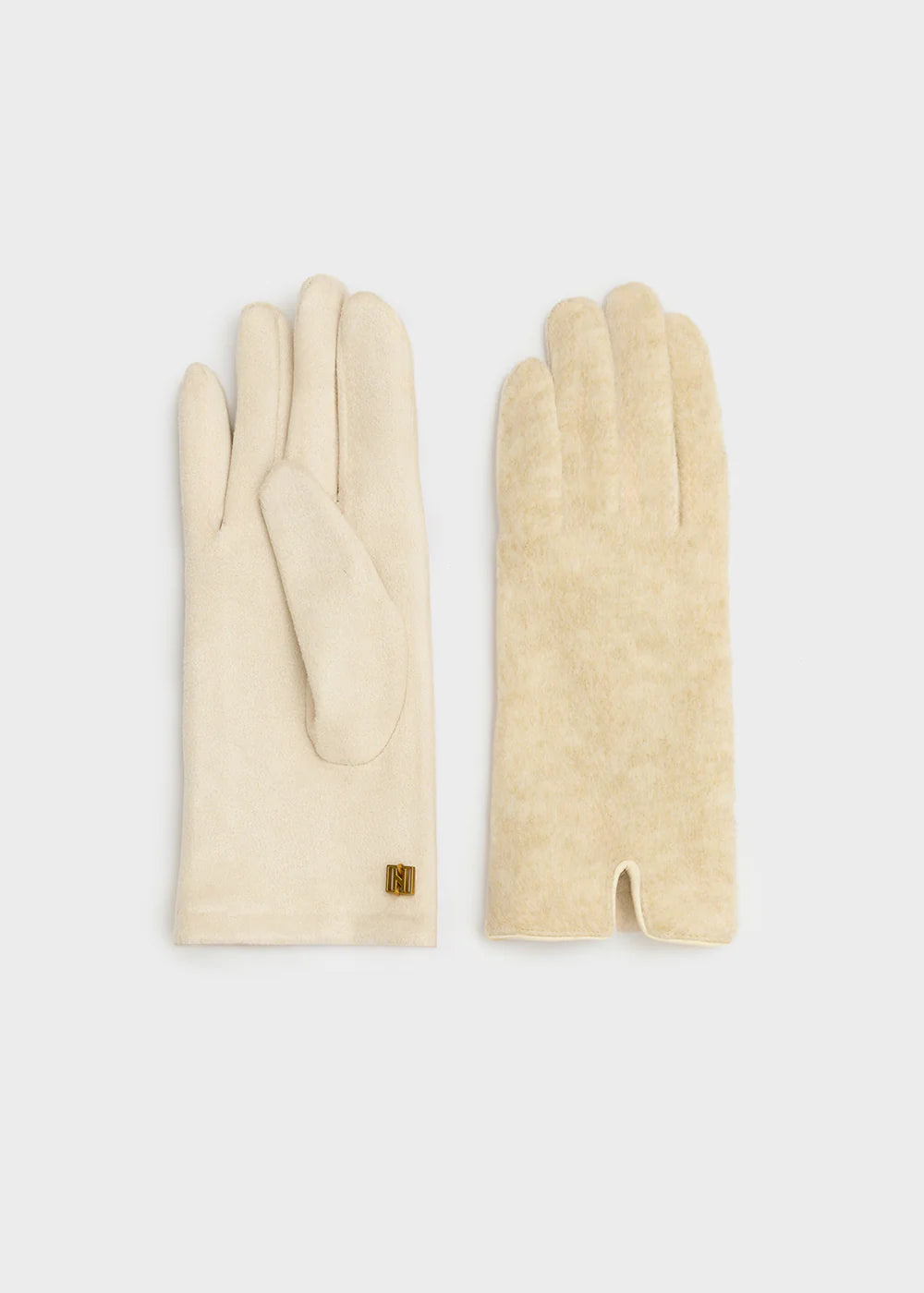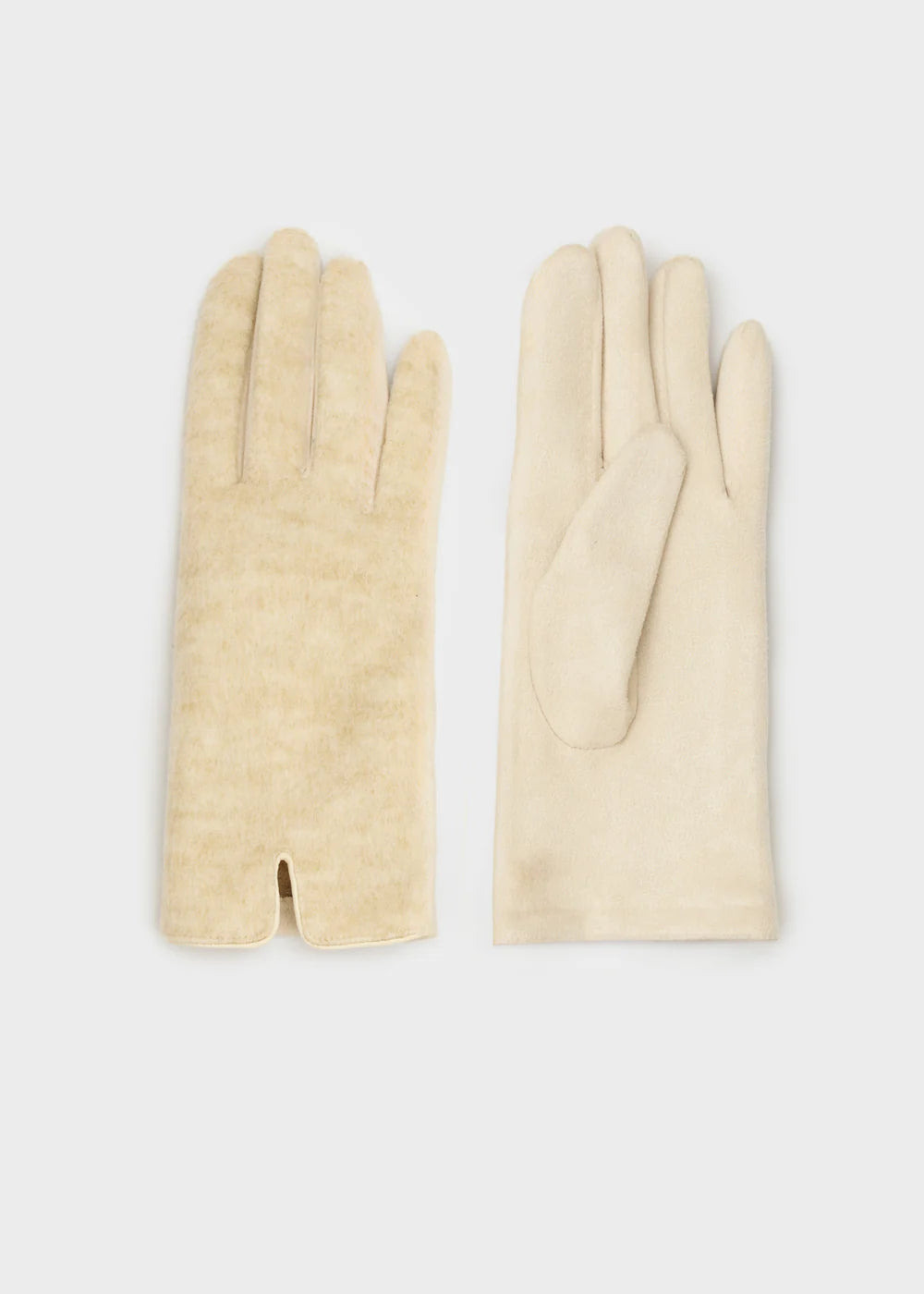 Guanti eleganti in lana beige con interno morbido, perfetti per un look sofisticato e caldo.