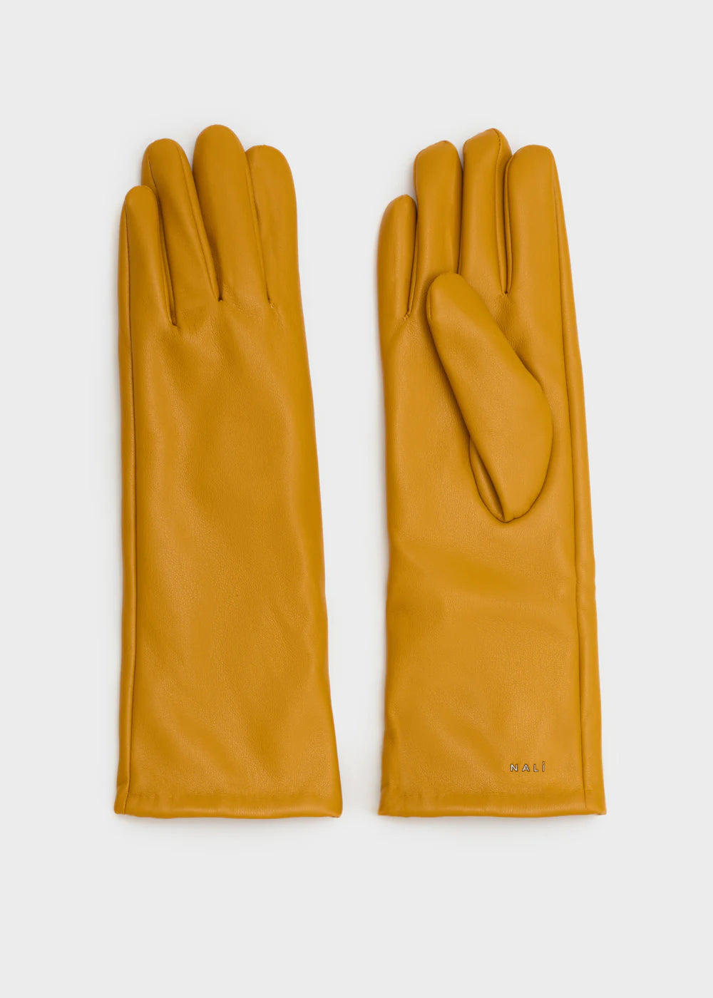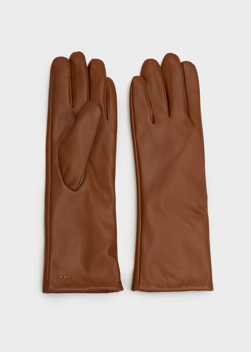 Guanti lunghi in ecopelle marrone, dal design raffinato e versatile per ogni occasione.