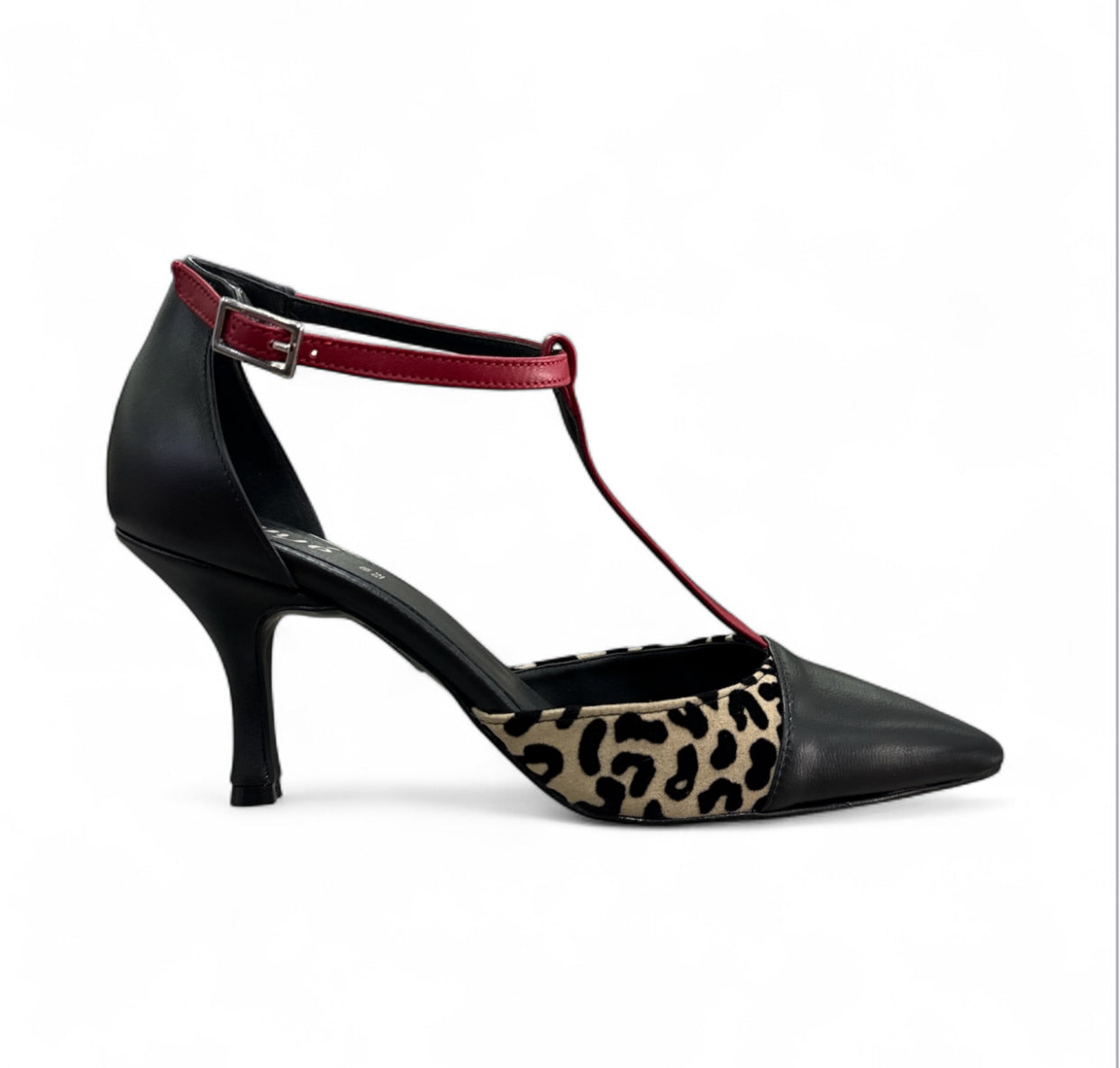 Décolleté con tacco medio e punta affusolata, arricchite da un grintoso inserto animalier . Il cinturino t-bar a contrasto dona un tocco originale e assicura stabilità al piede, perfetto per affrontare la giornata con stile e personalità. Ideali da abbinare a look sia casual che raffinati.