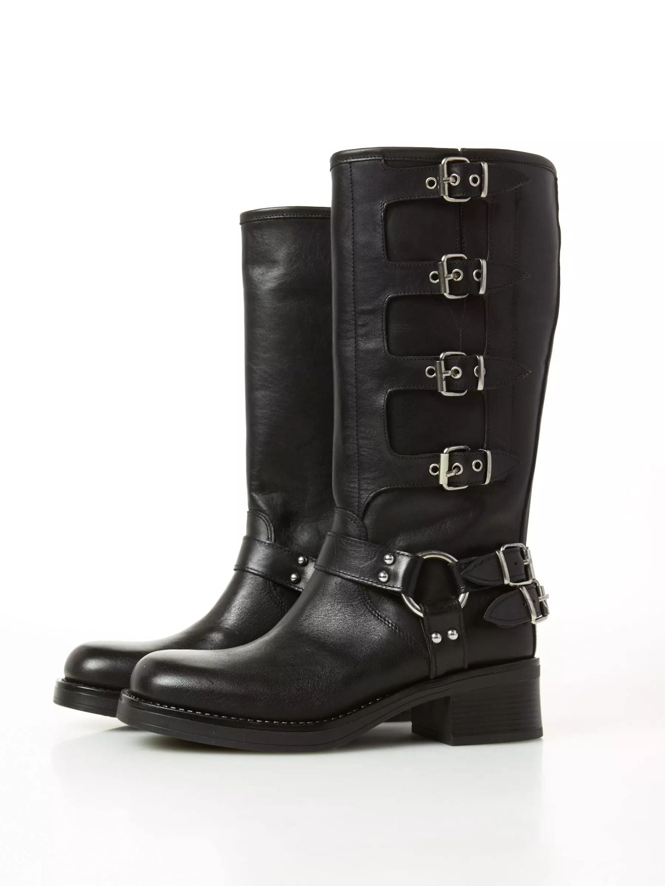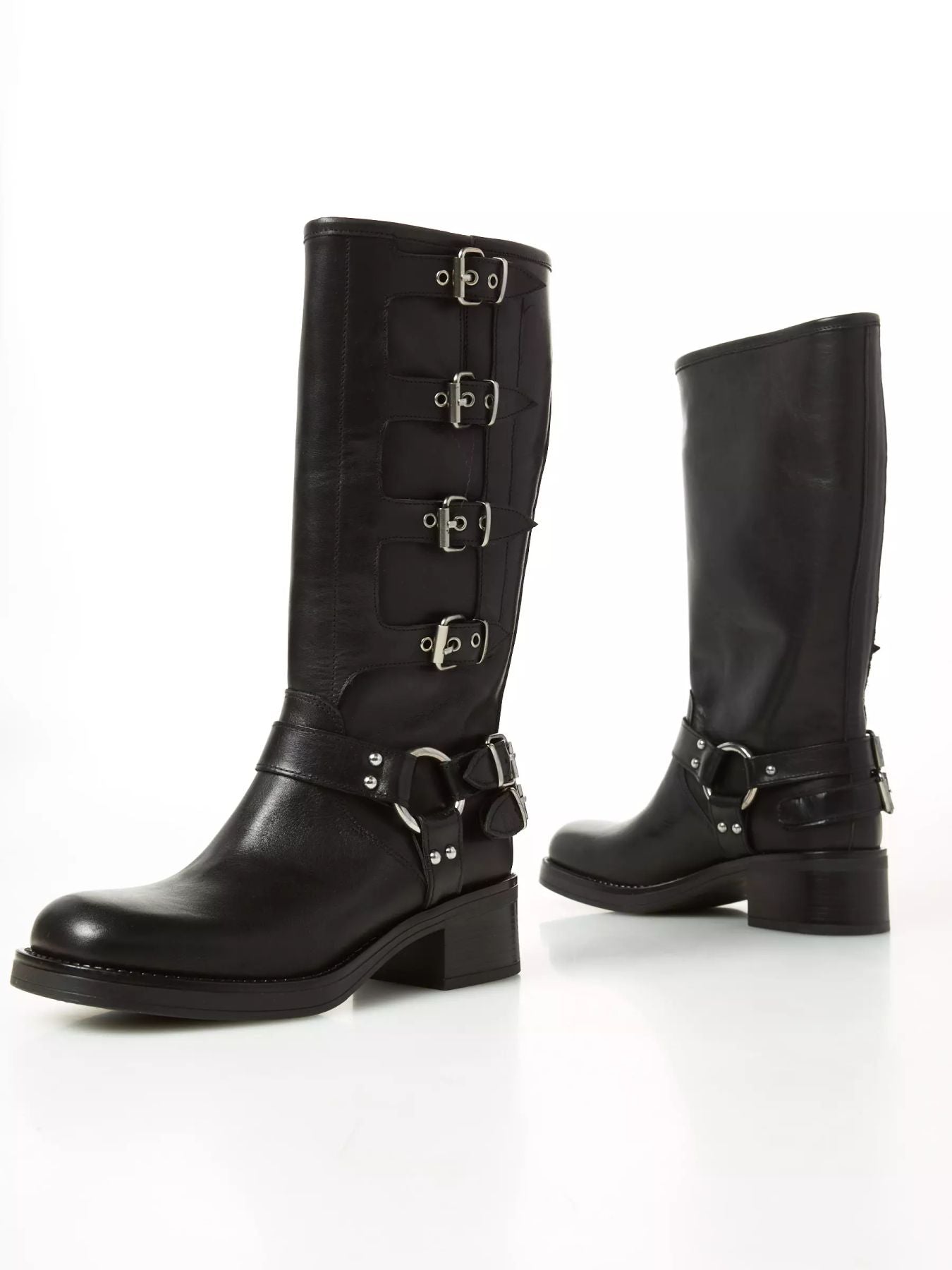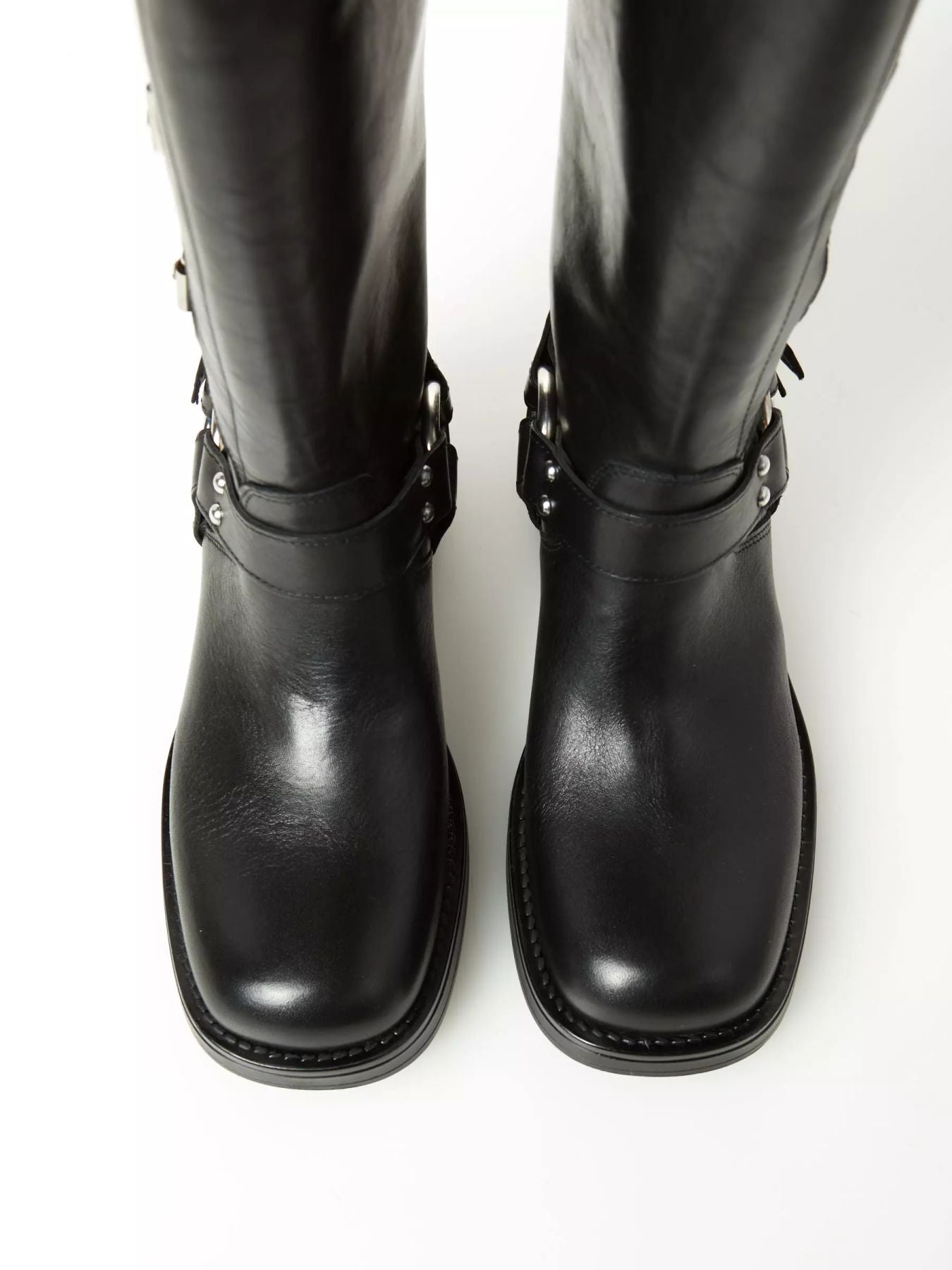 Stivale in pelle nero con punta quadrata , modello biker, con fondo in gomma e tacco h.5cm . Arricchito lateralmente da diverse fibbie regolabili in metallo, perfetto per completare i look in questa stagione autunnale ed essere sempre al passo con la moda.