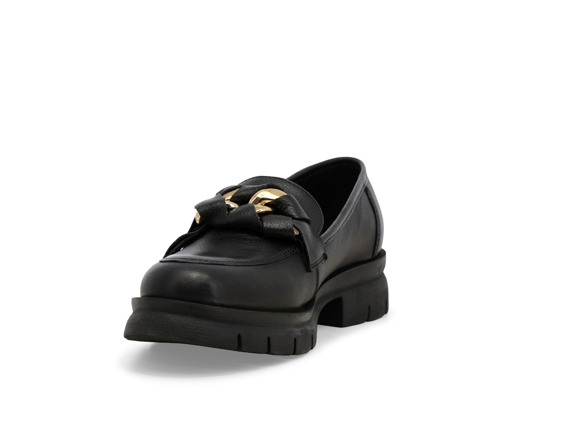 Mocassino in pelle , accessorio catena oro, fondo in gomma.