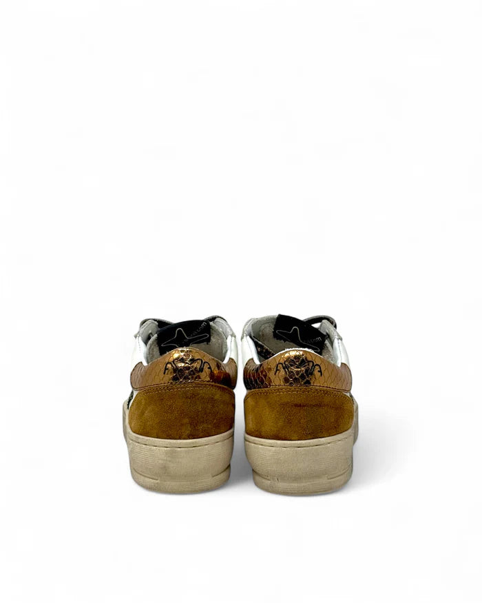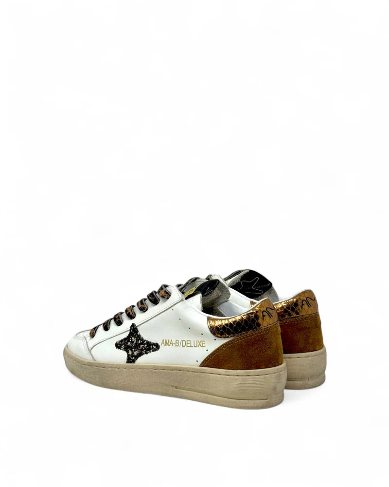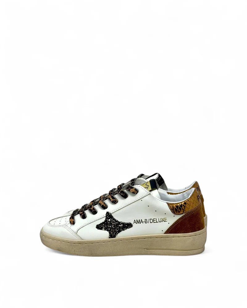 La tomaia bianca è valorizzata da inserti in pelle marrone sul tallone, mentre l’iconica stella laterale glitter bronzo dona un tocco di luce e personalità. I lacci maculati aggiungono un twist audace, rendendo queste sneakers perfette per chi ama distinguersi. Completano il design il logo su linguetta, la patch laterale con logo e la suola in gomma che garantisce comfort e durata.