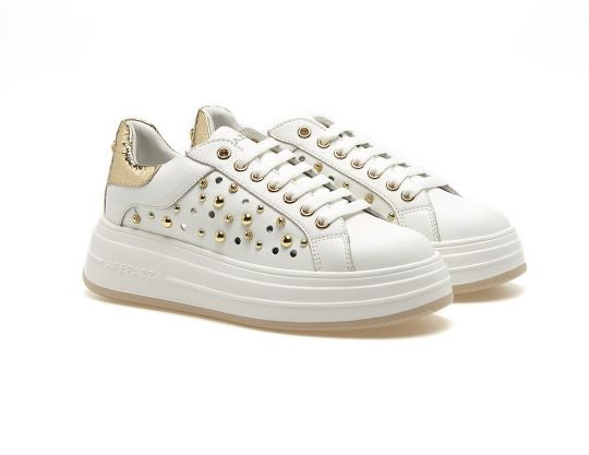 Sneakers da donna Apepazza dallo stile moderno e femminile, realizzate in pelle bianca di alta qualità. Il design è impreziosito da borchie decorative color oro di diverse dimensioni e micro-forature laterali, che creano un raffinato gioco di luce e texture.