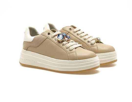 Sneakers da donna dal design raffinato e contemporaneo, realizzate in pelle liscia color tortora/beige con dettagli coordinati. Il modello si distingue per l’applicazione gioiello removibile sui lacci, impreziosita da pietre sfaccettate multicolor che donano luce e un tocco glamour alla calzatura.