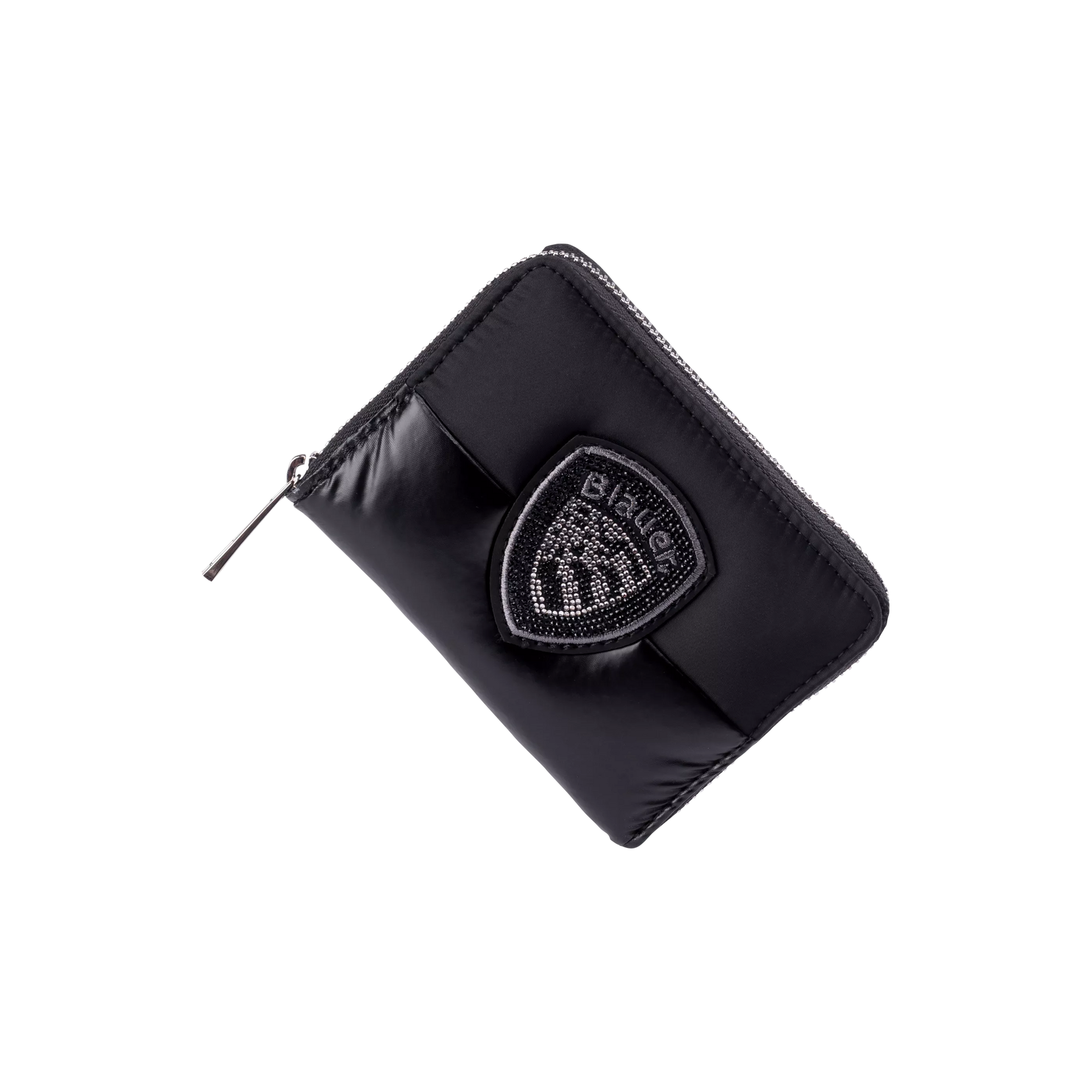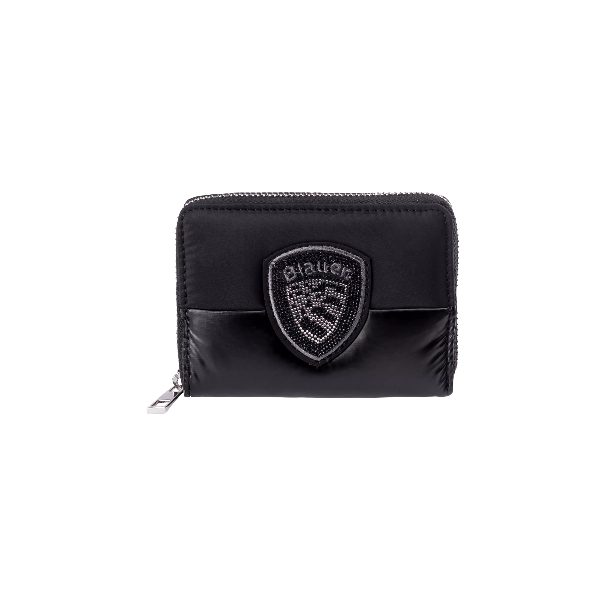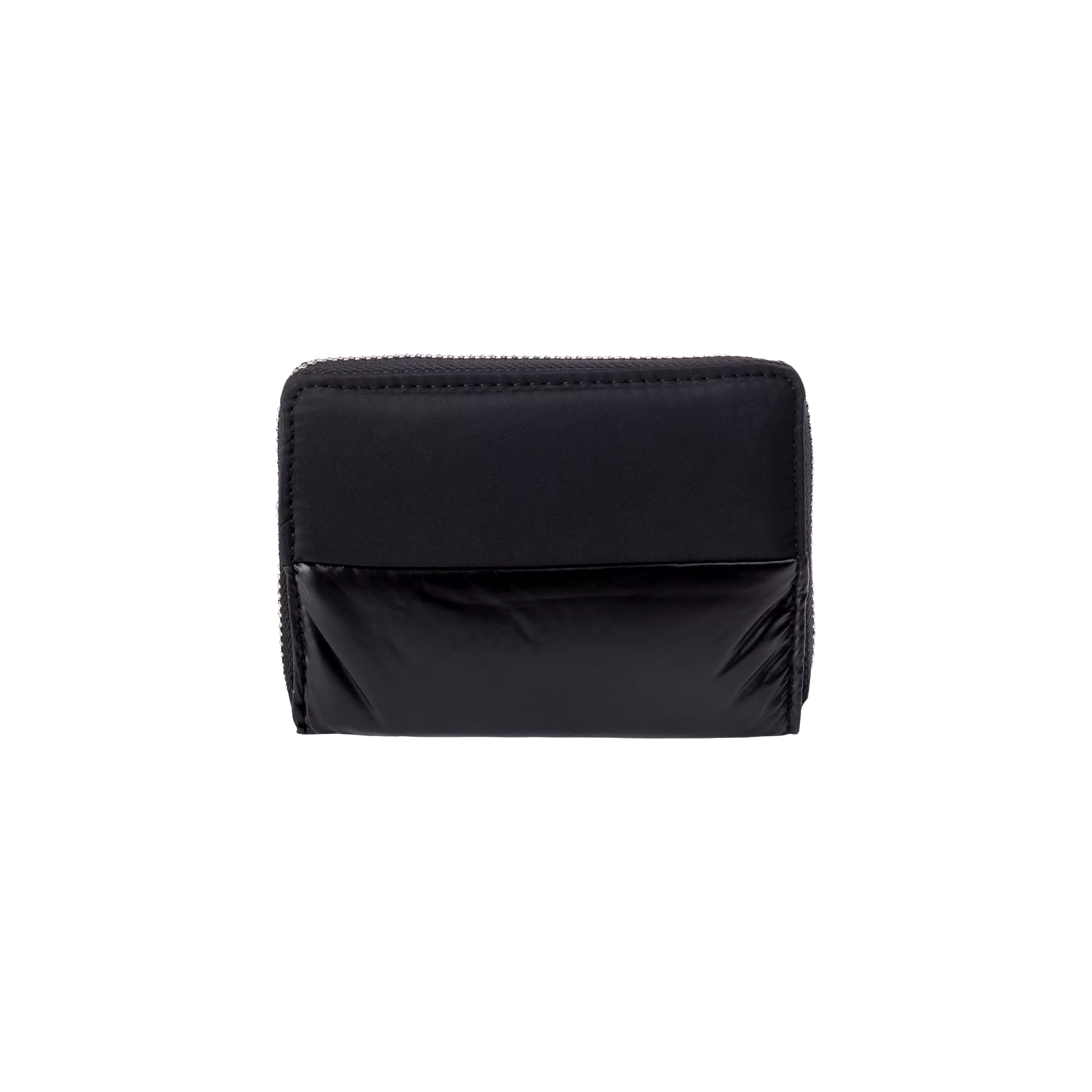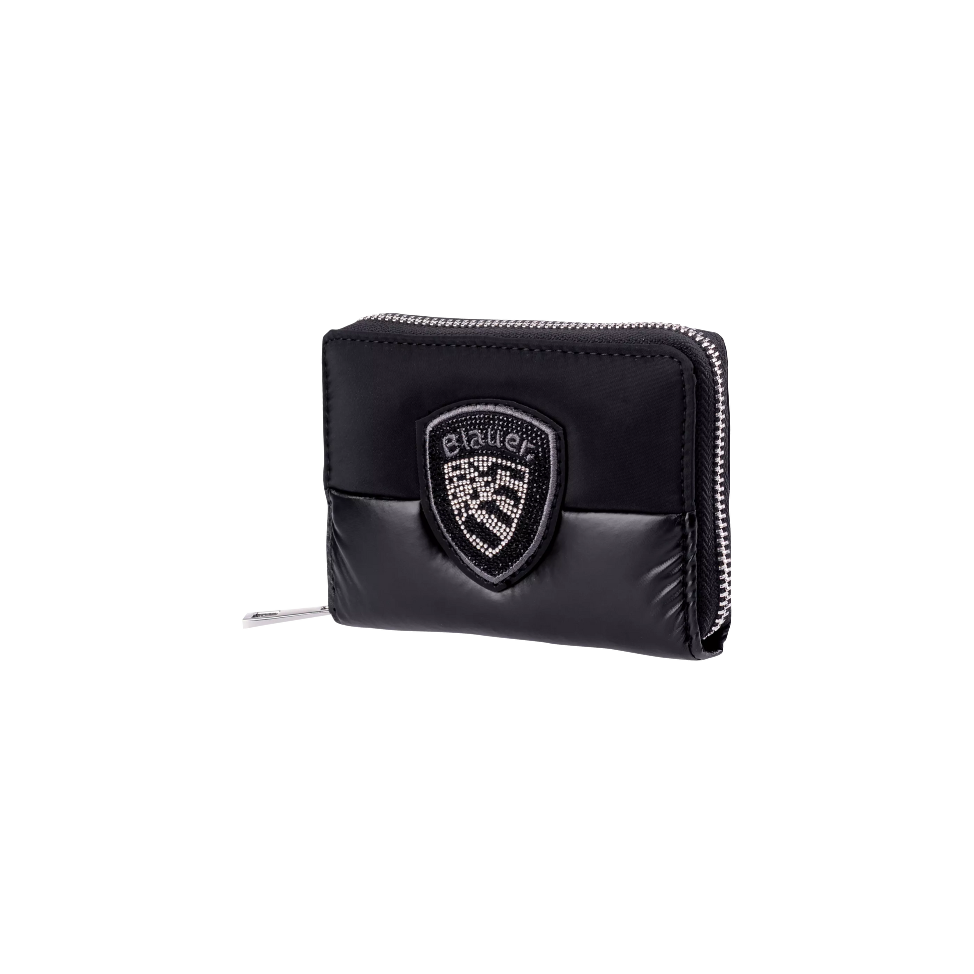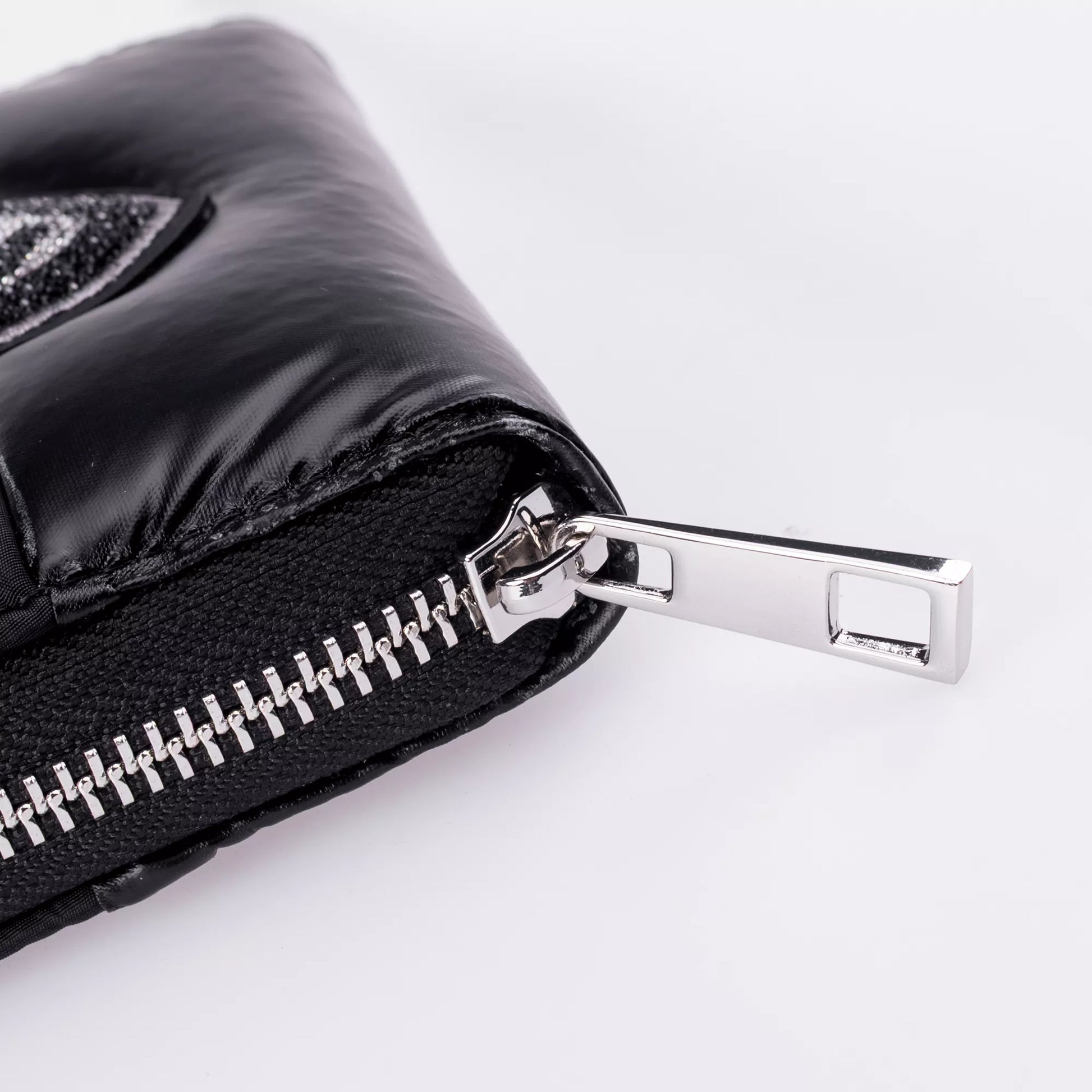Questo portafoglio chiuso da zip su 3 lati si distingue per la sua imbottitura morbida e leggera, realizzata con un sofisticato abbinamento di due diversi nylon. E' impreziosito da patch adornato con strass in tinta, che conferiscono un tocco di brillantezza e stile. Funzionale e raffinato.