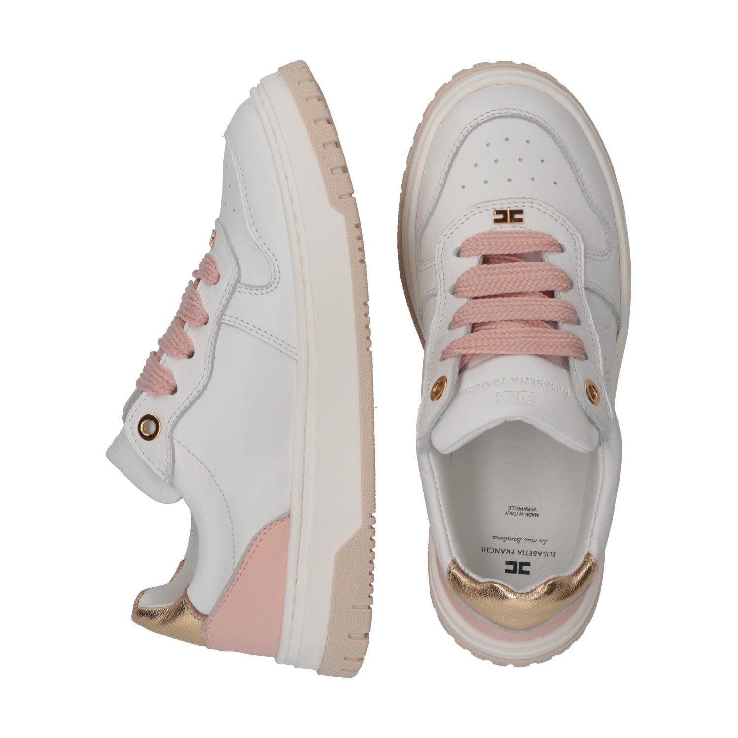 Sneakers Elisabetta Franchi La mia Bambina dal design contemporaneo e delicatamente femminile, perfette per accompagnare ogni giornata con stile e comfort. La silhouette bassa e strutturata viene valorizzata da dettagli a contrasto che incorniciano la tomaia e creano un raffinato equilibrio cromatico.