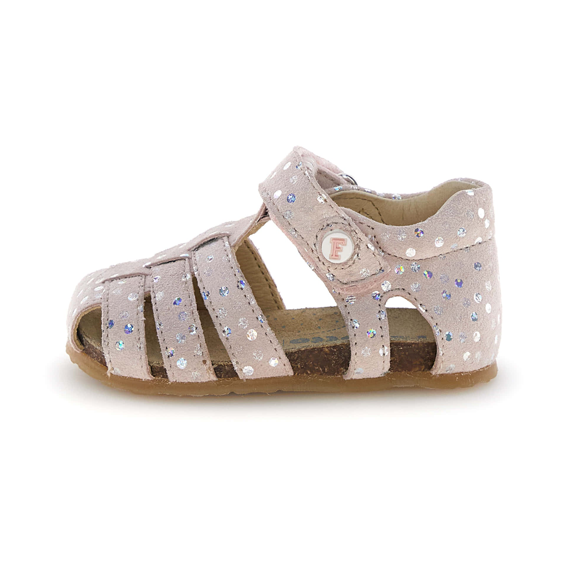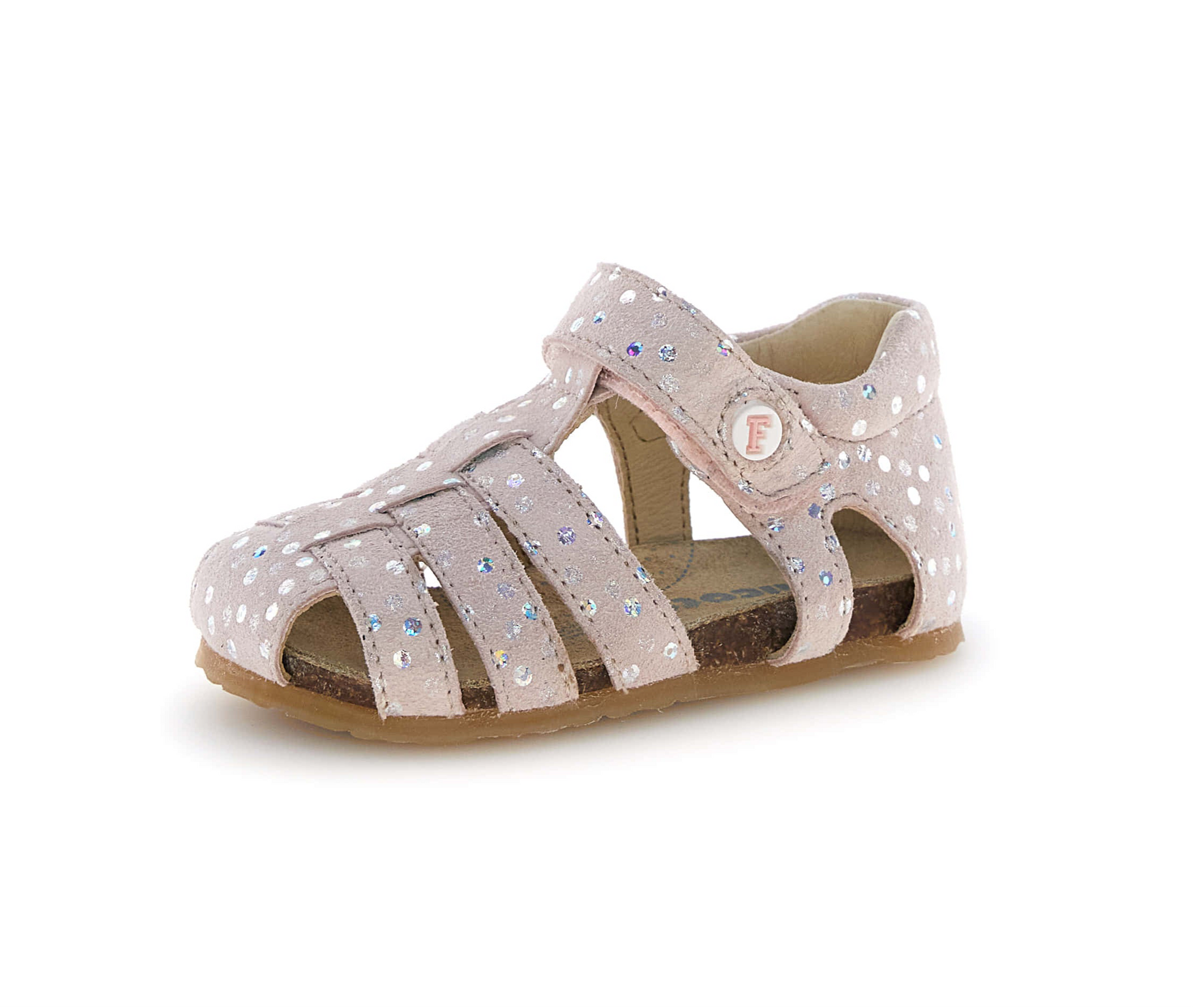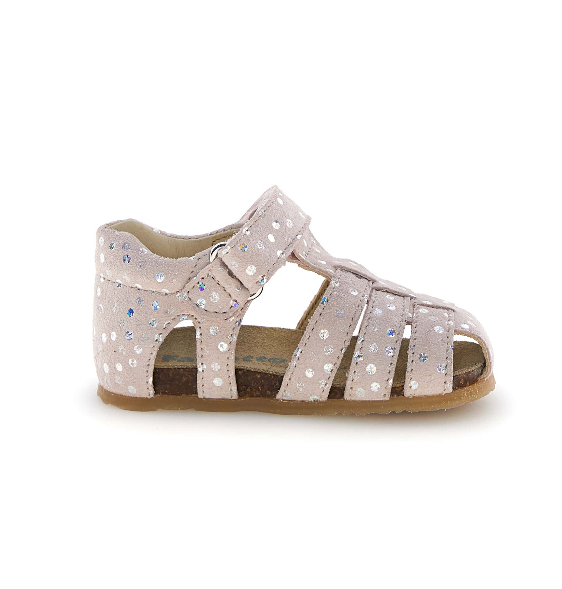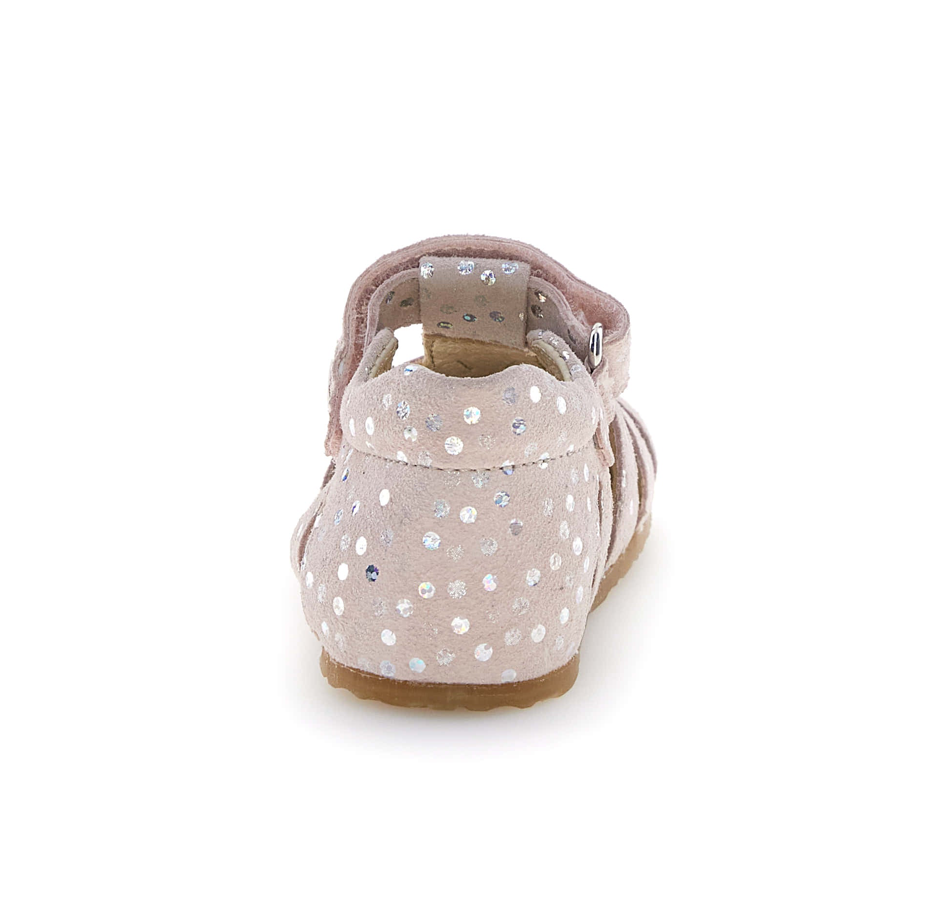 Luminosi e romantici, ecco i sandalini dedicati ai piedini più glamour: realizzati in suede e decorati con stampe a pois iridescenti , presentano una costruzione avvolgente e protettiva, che assicura una perfetta traspirabilità. Il cinturino alla caviglia con velcro, il tallone strutturato e l'imbottitura alla caviglia offrono tutto il sostegno necessario ai piedini inesperti. Fodera interna e soletto in cuoio, suola in gomma.