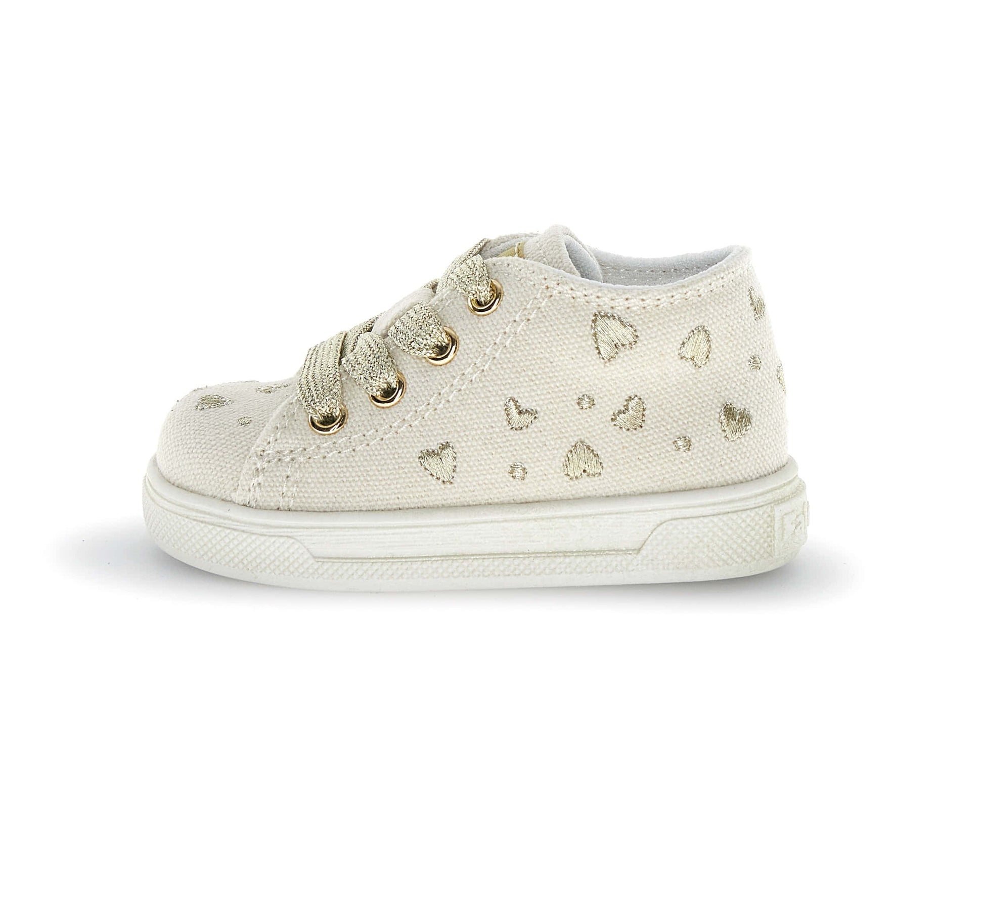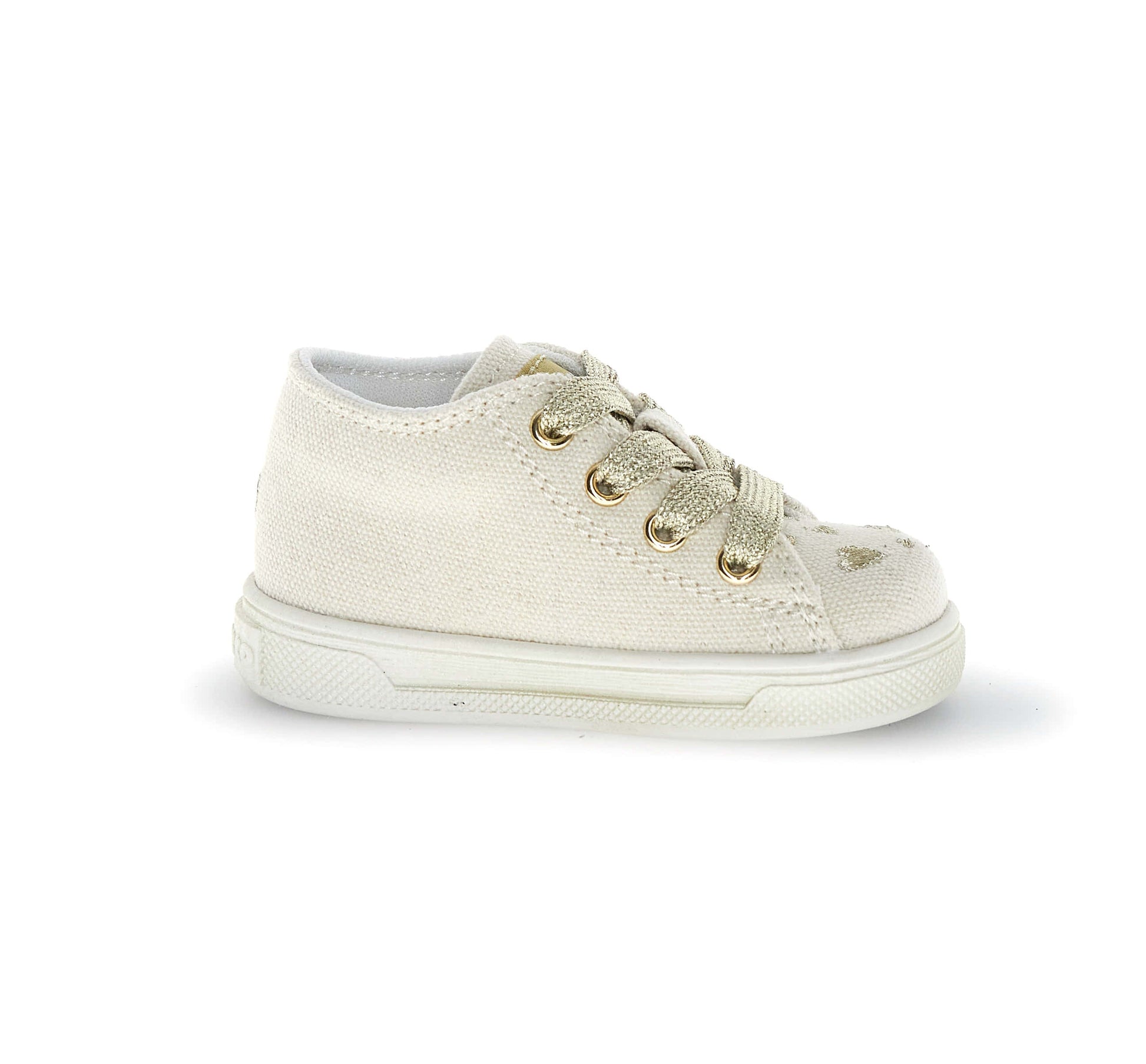 Lascia che i piedini risplendano con stile grazie a queste sneakers in tessuto con cuori ricamati! La fodera e la soletta interna in pelle garantiscono un comfort che dura nel tempo, mentre il tessuto esterno aggiunge quel tocco di magia ad ogni passo. La chiusura con lacci permette una calzata sicura e personalizzabile, rendendole perfette per accompagnare i bambini nelle loro infinite avventure.