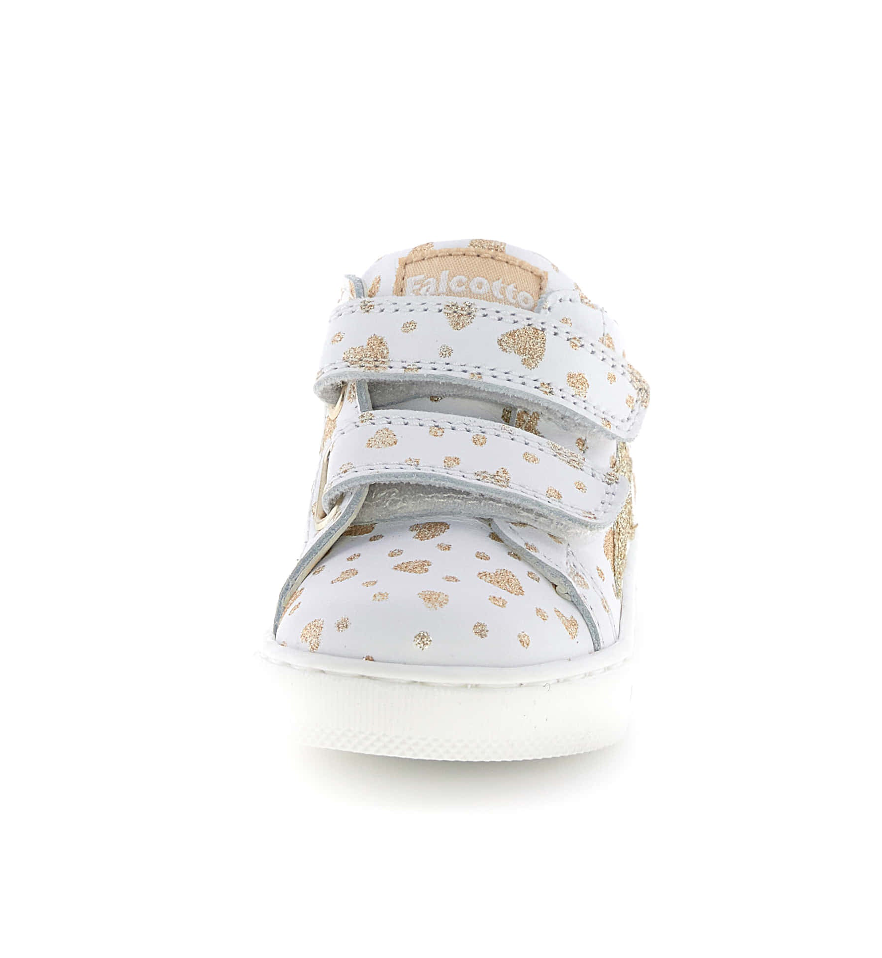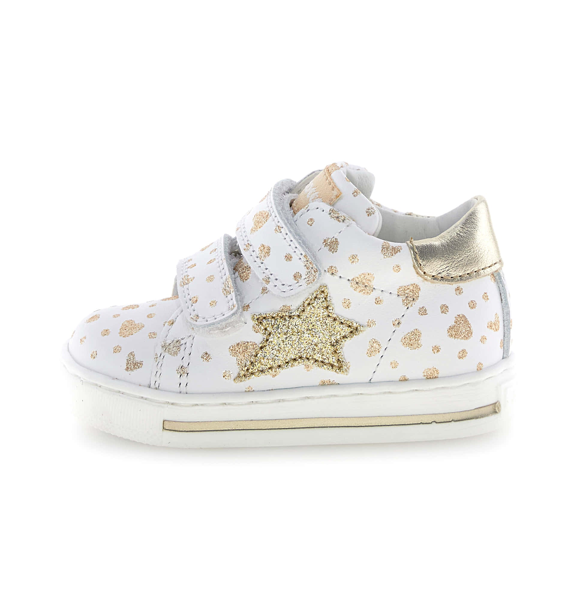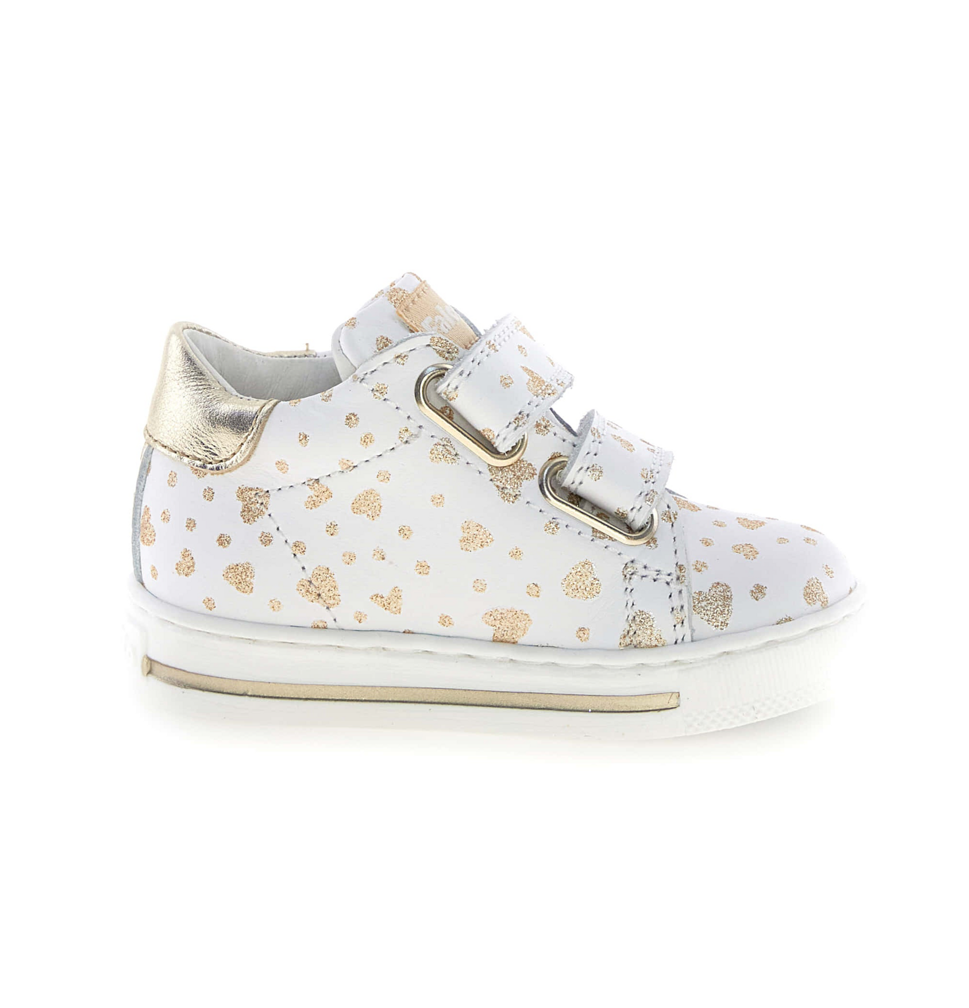 Appeal sportivo e look fashion: ecco la sneaker che farà impazzire tutte le bambine. La tomaia in vitello è decorata da stampe a contrasto, con cuori oro glitter per un effetto romantico. Il topponcino metallizzato a contrasto sigilla un design assolutamente fashion. La chiusura con doppio velcro, la fodera in pelle e la struttura del tallone offrono comfort e sostegno al movimento. Fondo in gomma antiscivolo.