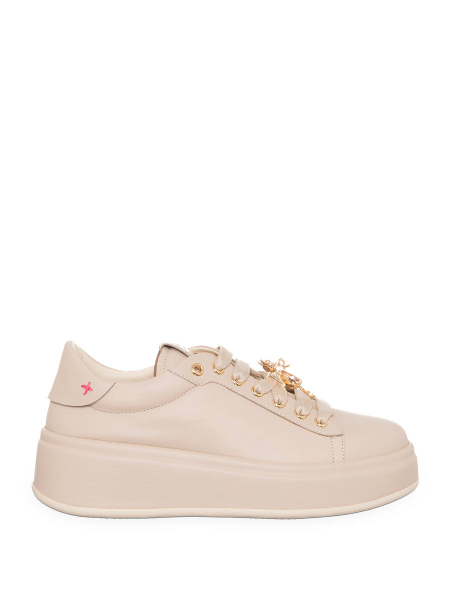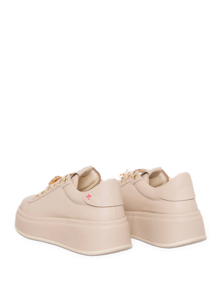 Una sneaker elegante e luminosa firmata Gio+, pensata per dare carattere anche agli outfit più semplici. Il design minimal in tonalità neutra viene impreziosito da raffinati dettagli dorati e da applicazioni gioiello sui lacci, che aggiungono un tocco glamour e femminile.