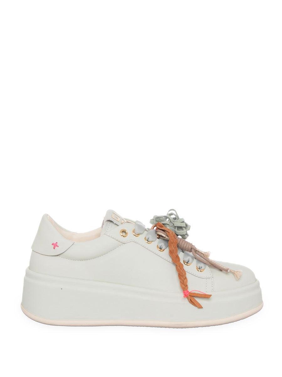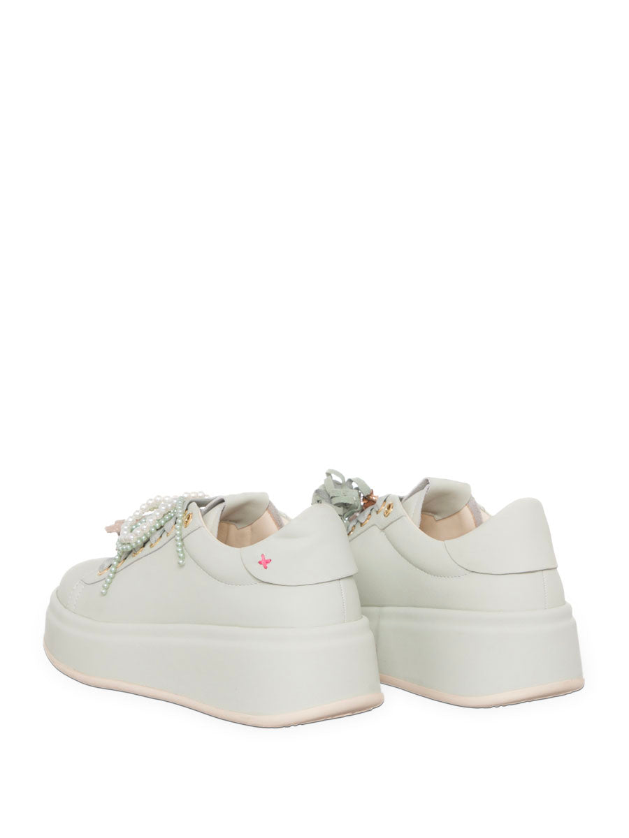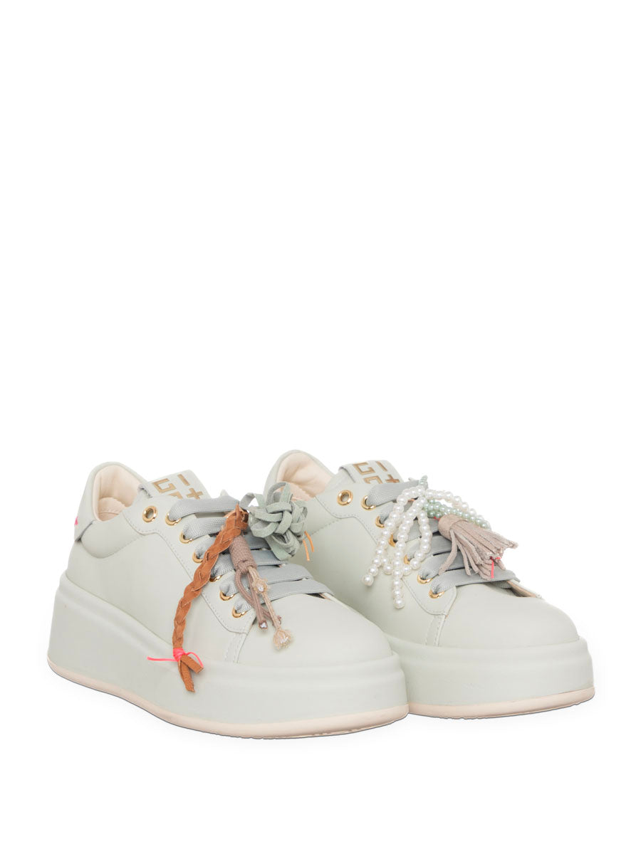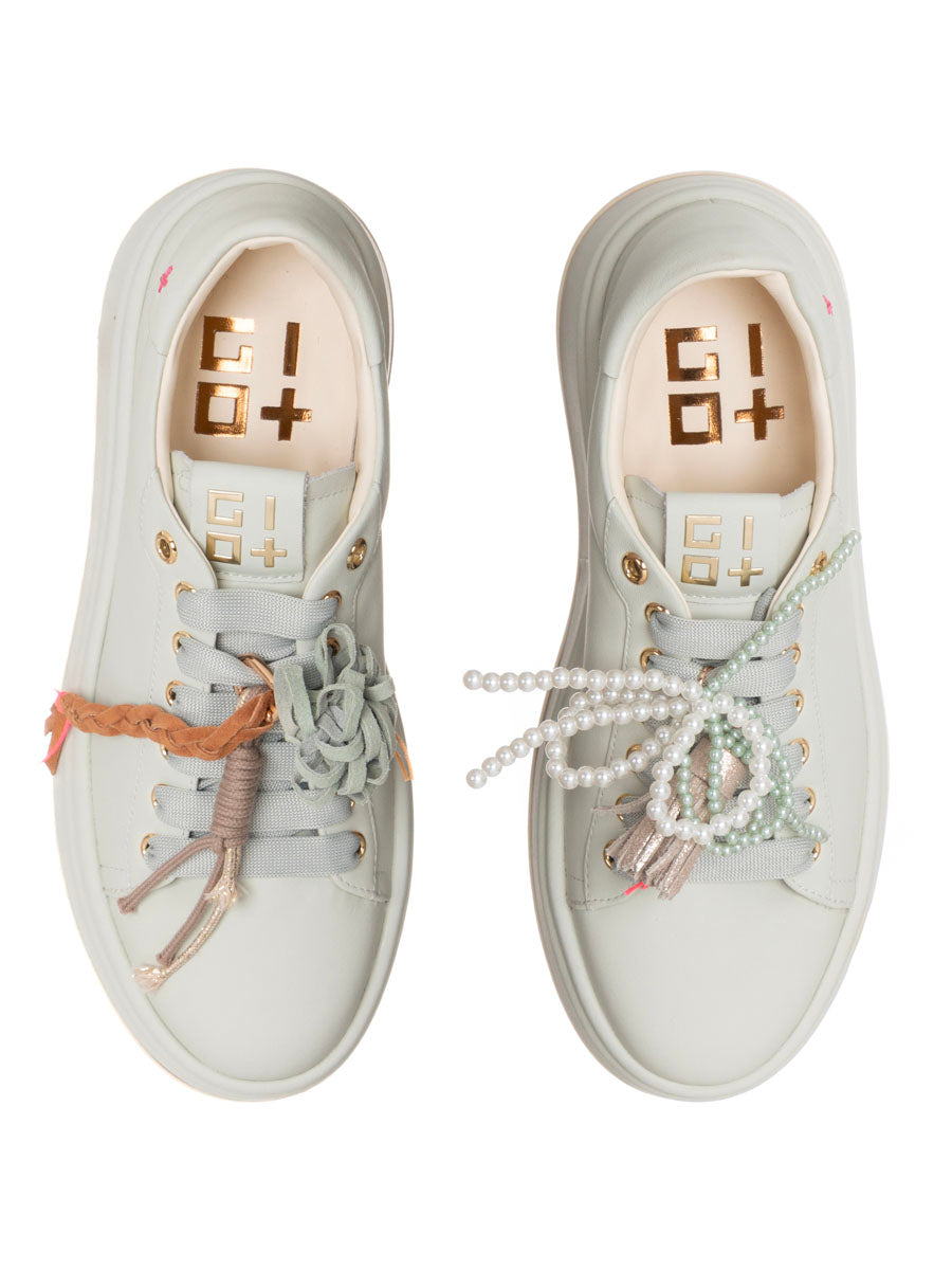 Una sneaker dal carattere raffinato e contemporaneo, firmata Gio+, pensata per chi ama unire comfort e dettagli ricercati. Il design pulito in tonalità neutra è valorizzato da eleganti inserti dorati e da lacci decorativi impreziositi con perle e charm pendenti che donano un tocco femminile e originale.