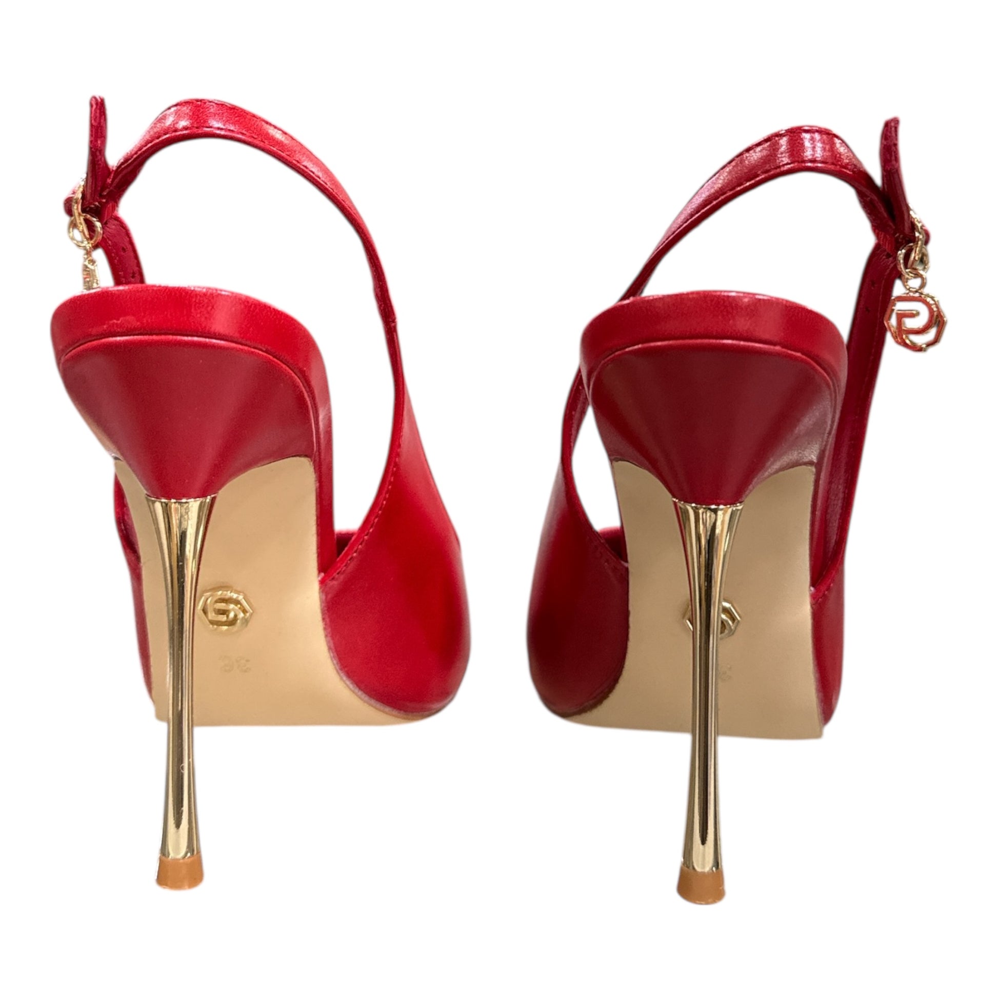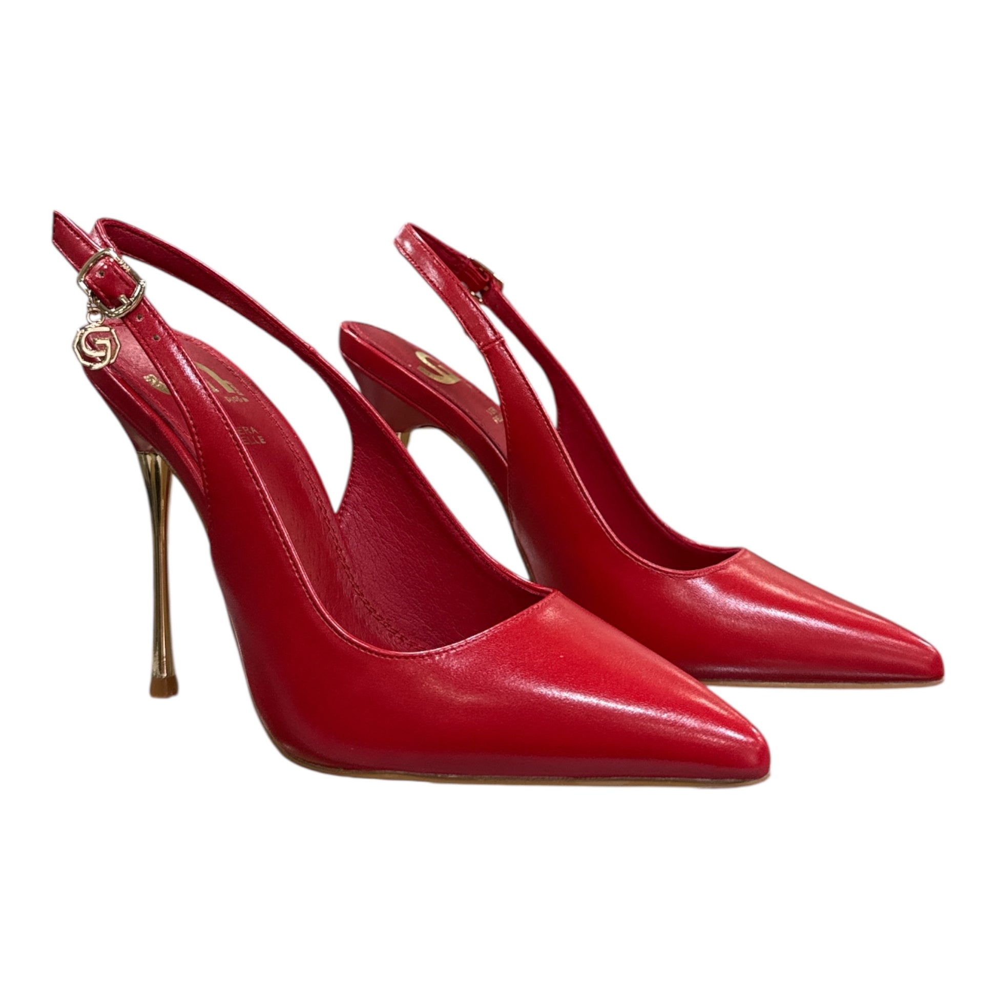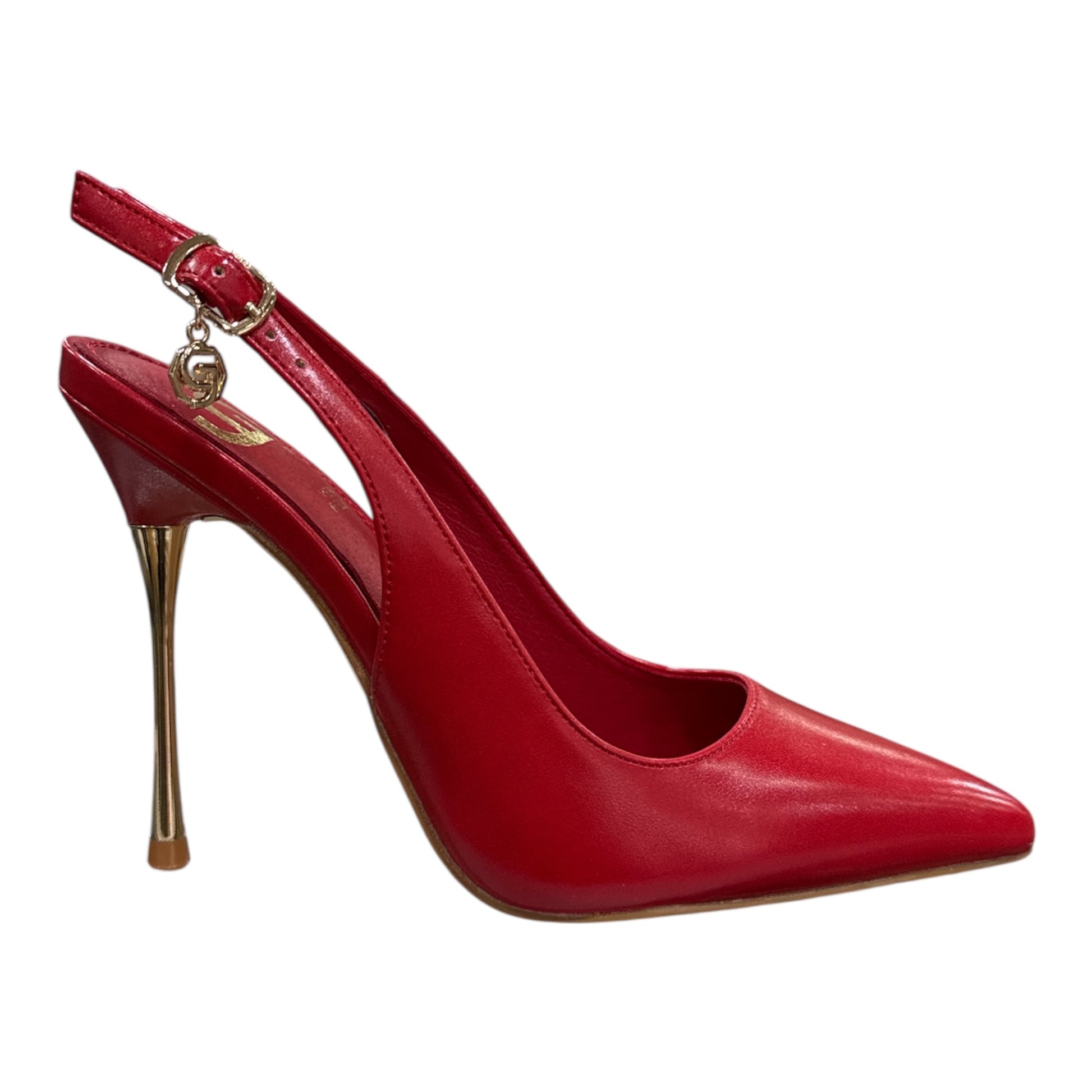 Realizzata in elegante finitura rosso intenso, questa scarpa si distingue per la silhouette affusolata con punta sottile e il tacco stiletto slanciato con dettaglio dorato, che dona luce e carattere ad ogni passo. Il cinturino regolabile sul tallone assicura una calzata stabile e confortevole, impreziosito da un delicato charm gold che firma il design con stile.