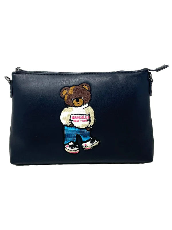 Pochette grande in ecopelle con logo orsetto, chiusura zip, tracolla in stoffa regolabile e removibile.