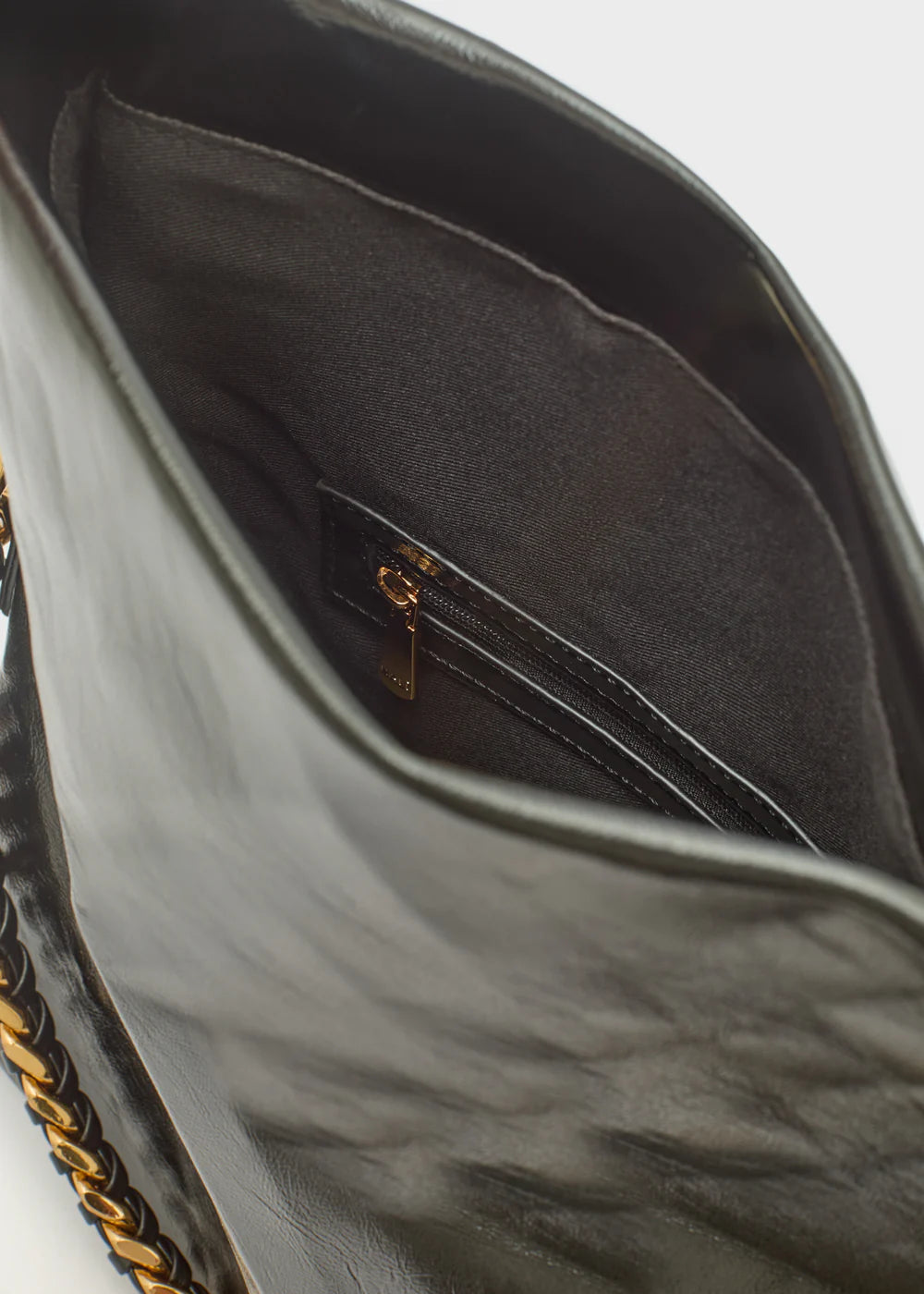 Borsa a tracolla dalla linea morbida con catena decorativa e chiusura a patta, perfetta per abbinamenti versatili e di tendenza.