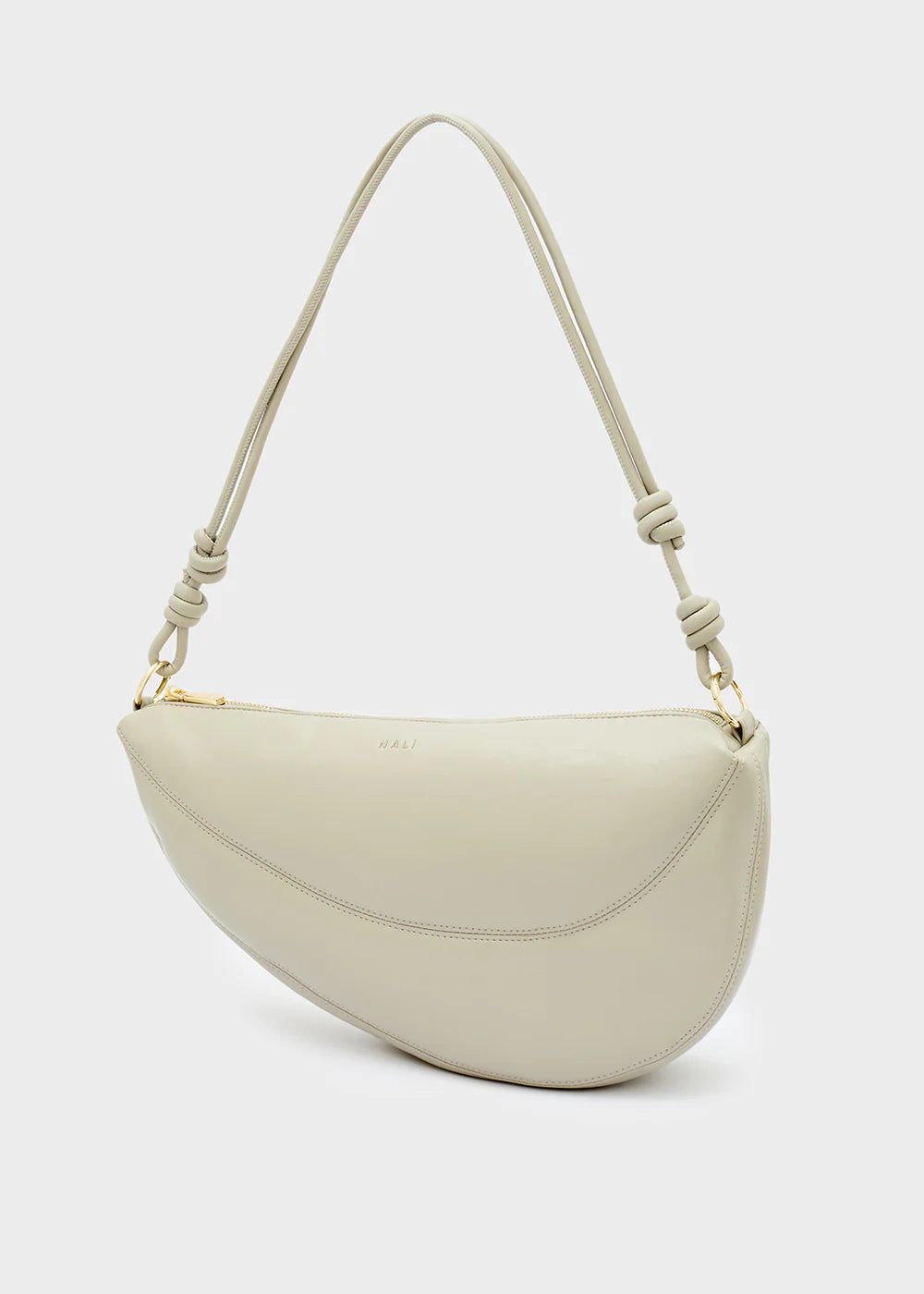 Borsa a spalla dal profilo curvo e contemporaneo, con manico regolabile e dettagli in cucitura a vista, ideale per completare look moderni con un tocco di personalità.