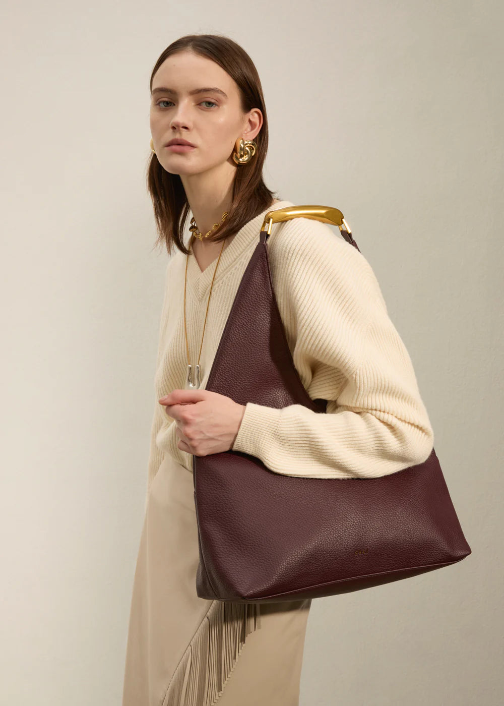 Borsa a spalla dalla forma morbida e minimalista, arricchita da un manico rigido in metallo e capiente scomparto interno, perfetta per uno stile sofisticato e versatile.