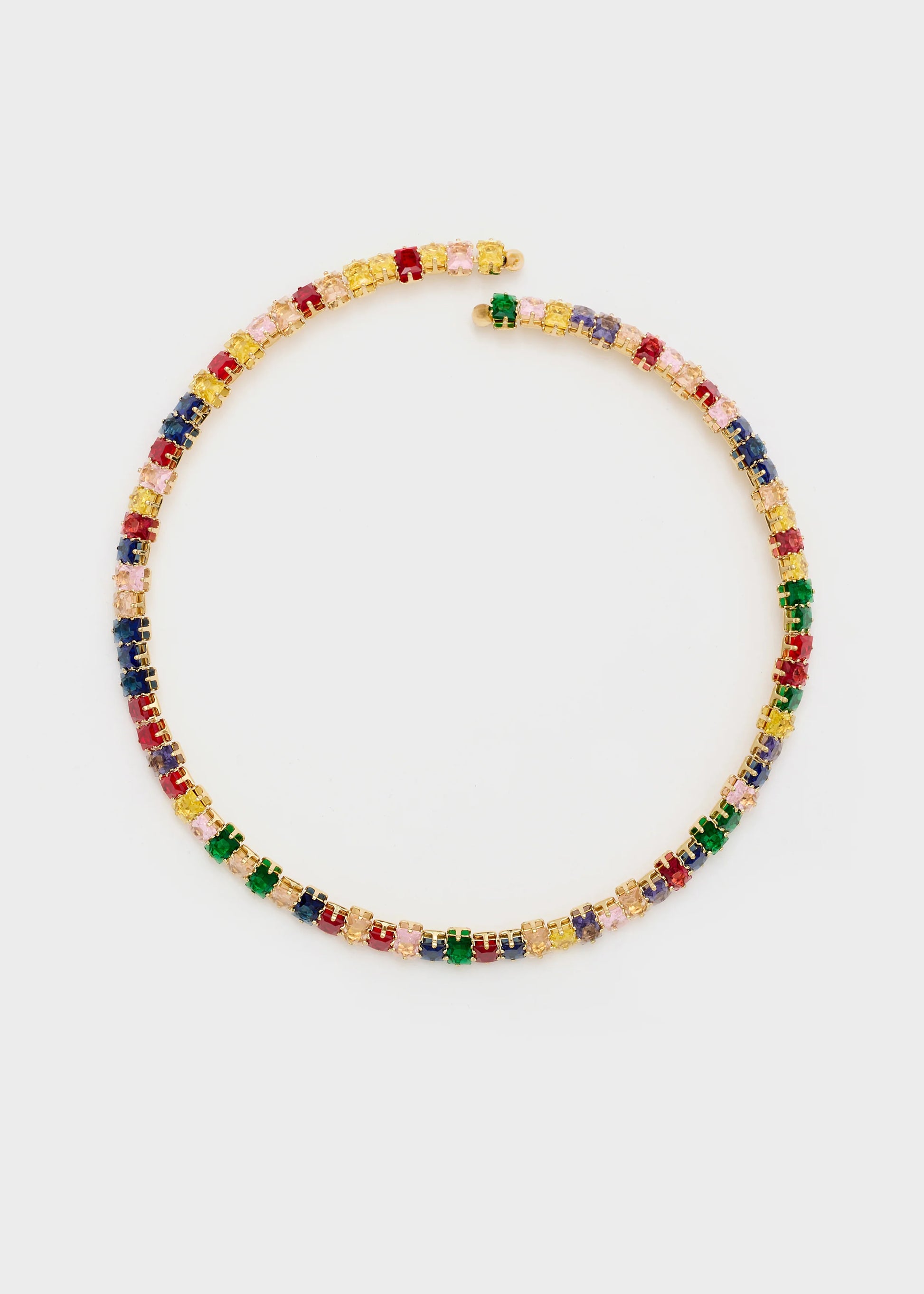 Collana rigida impreziosita da una sequenza continua di cristalli multicolor incastonati su struttura color oro. Il design circolare avvolge il collo con eleganza, creando un raffinato gioco di luce e colore. Perfetta per valorizzare look serali o dare carattere ad outfit minimal, è una collana gioiello dallo stile sofisticato e deciso, ideale per chi ama accessori ricercati e luminosi.